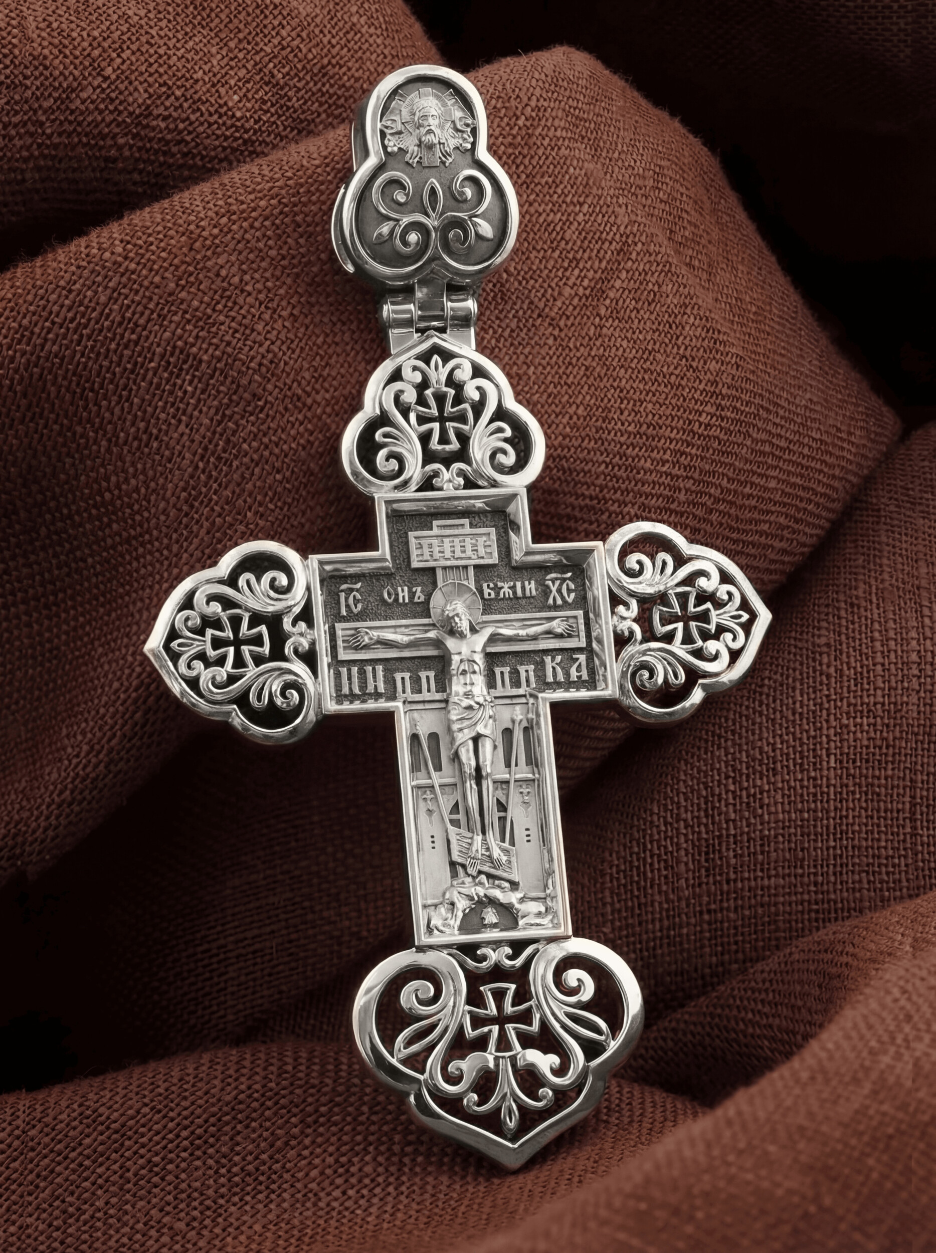 На лицевой стороне изображено Распятие. Позади Распятия видна иерусалимская стена, знак того, что Господь был распят вне стен города. Но вместе с тем стена символизирует и Небесный Иерусалим, путь который открылся для человека через Голгофу. У подножья Господа в виде скалистой горки видна сама Голгофа с Главой Адамовой в пещере. Рядом с Крестом из горы выступают орудия страданий Господа — трость и копие, обозначенные буквами Т и К. На трости стражники подали Христу пропитанную уксусом губку, когда Он жаждал воды, а копьем пронзили Ему ребра, чтобы проверить: умер ли Он?