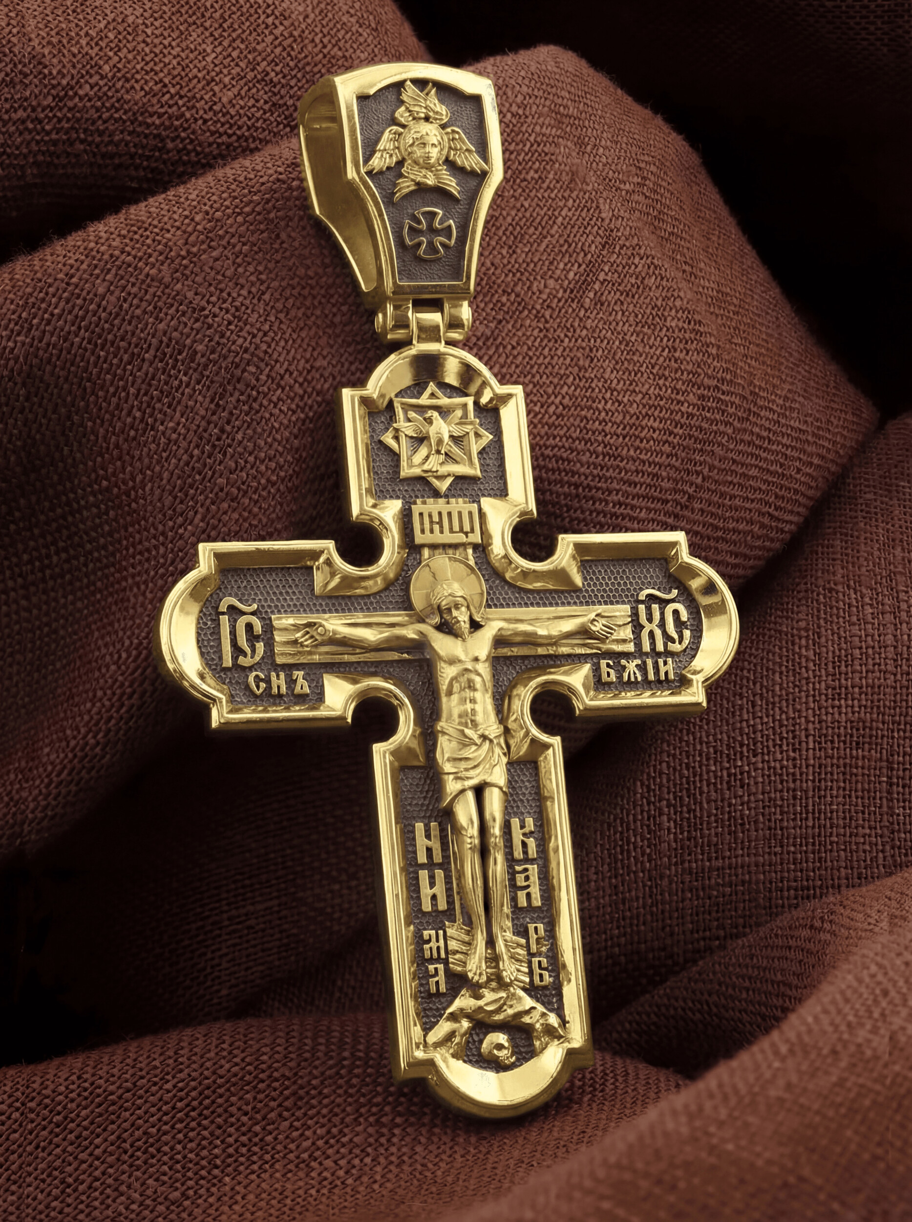 На лицевой стороне креста изображено Распятие Господа и Спасителя нашего Иисуса Христа. Христос, подвергнутый на кресте мучительной казни, своими страданиями искупил нас от древнего греха и даровал нам жизнь вечную. На верхней табличке, выше головы Иисуса, расположена надпись, составленная Понтием Пилатом — «IНЦI». Она означает «Иисус Назорей, Царь Иудейский». Надпись «IС ХС» означает Иисус Христос и словосочетание «СЫН БОЖИЙ», что означает божественную природу Иисуса Христа, помещается на разных сторонах поперечной перекладины креста. В нижней части креста находятся надписи –«НИКА» и «МЛРБ». В переводе с греческого, слово «НИКА» означает «победитель». Именно оно является символом победы Христа над смертью. Надпись «МЛРБ» — «место лобное рай бысть» означает, что место лобное стало раем. Крест стоит на горе камней, символизирующих Голгофу. Под подножием Креста изображена покоящаяся голова (череп) Адама, грехи которого Христос омыл Своею Кровью. Христос в Своей Божественной любви, над которой смерть не властна и которая, страдая, и не страдает в обычном смысле, простирает к людям со Креста Свои объятия, в которые призывается и привлекается весь мир. Поэтому Тело Его не висит, а торжественно покоится на Кресте.