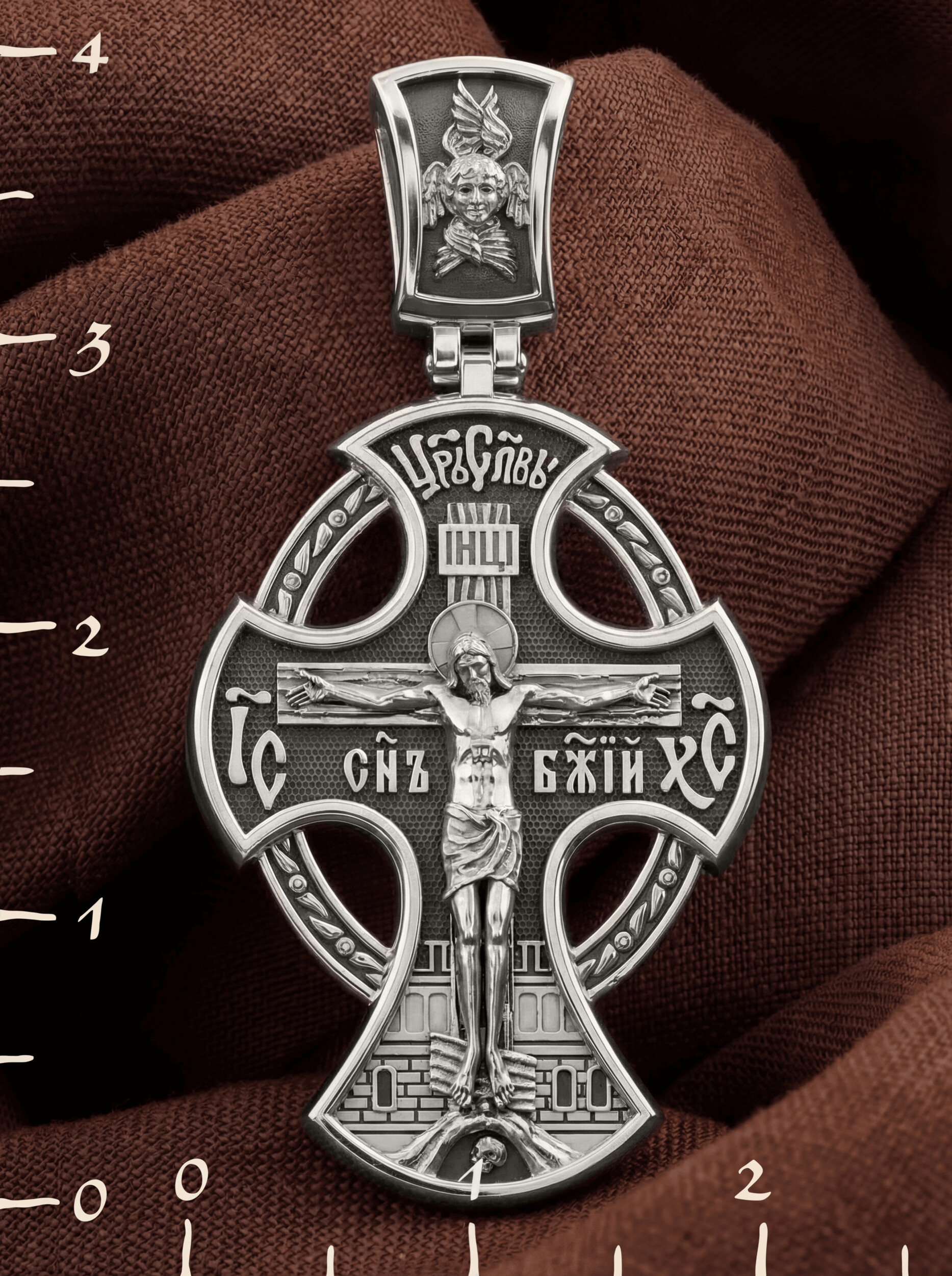 На лицевой стороне креста изображено Распятие Иисуса Христа. Господь представлен свободно покоящимся на кресте с простертыми руками и как бы обнимающим всю Вселенную. Он — Спаситель, искупивший грехи мира, «поправший смертию смерть» и призывающий к Себе «все концы земли». Поэтому рядом с Его образом помещены слова «Царь Славы». Эти слова характеризуют Господа как Великого Архиерея, победителя смерти. Верхняя перекладина символизирует титло — табличку, на которой, согласно Евангелию, было начертано: Иисус Назорей Царь Иудейский (IНЦI). Также Распятие сопровождается надписями, олицетворяющими Христа. Это святое имя Христа «IC» (Иисус) «ХС» (Христос), и словосочетание «Сын Божий». Крест стоит на горе камней, символизирующих Голгофу, в основании которой различается череп. Это голова Адама. На кулонном кольце помещено изображение серафима.