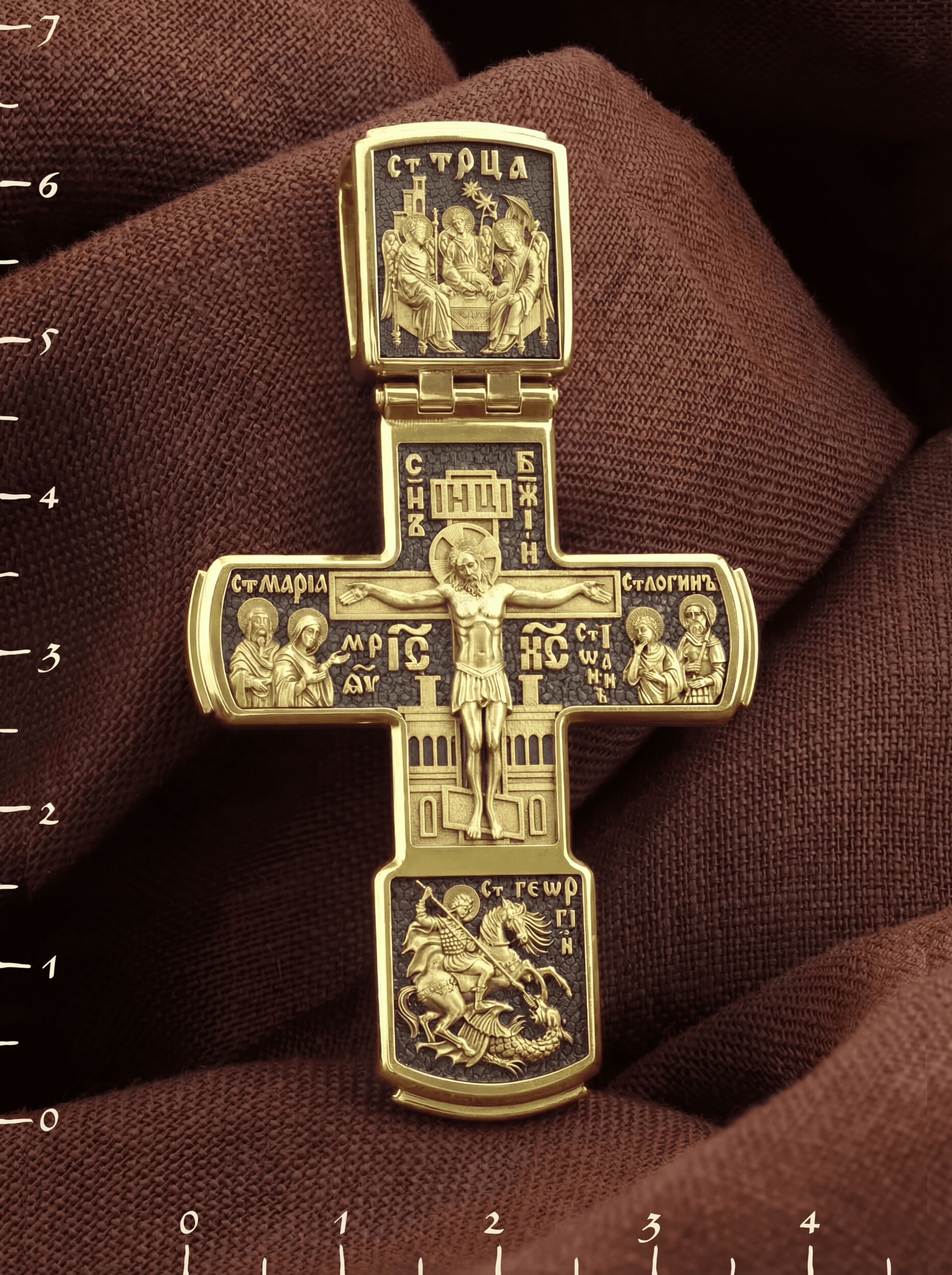 На кресте изображено Распятие Господа нашего Иисуса Христа. Ему предстоят Святая Мария Магдалина, Пресвятая Богородица, апостол Иоанн и Святой Иосиф, свидетели крестных страданий Господа. Вверху — икона Святой Троицы, на которой запечатлено явление Триединого Бога праотцу Аврааму в виде трех ангелов. В нижнем клейме изображено Чудо Святого Георгия о змие. Великомученик Георгий почитается как покровитель воинов, защитник от злых сил, помощник в духовной борьбе.