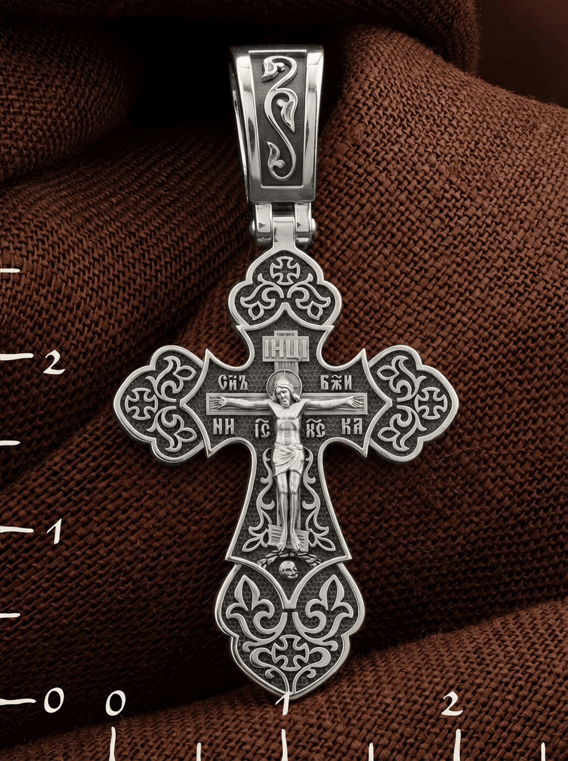 Крест с рельефным изображением Распятия в окружении пышных цветов и ажурного узора, напоминает нам о красоте Райского сада. На лицевой стороне креста изображено Распятие, потому что это орудие казни Иисус Христос сделал орудием победы над грехом и смертью. Своими страданиями Он искупил грехи человечества, умерев и сошествовав во ад, победил сатану, освободил души праведников от вечной смерти и открыл им небесные врата рая. Жертва Христа сделала возможным спасение для каждого человека. На православном кресте Христос не умирает, а свободно простирает руки, ладони Иисуса открыты, будто он хочет обнять все человечество, даря им свою любовь и открывая путь к вечной жизни. Верхняя перекладина символизирует собой табличку с надписью «IHЦI» — Иисус Назарянин Царь Иудейский. Над перекладиной пишется словосочетание «СЫН БОЖИЙ», ниже перекладины добавляется: «НИКА» (греч. — Победитель) и сокращенное имя Спасителя «IC XC» — Иисус Христос. Возвышение, на котором стоит Крест, символизирует гору Голгофу, на которой произошло Распятие. У подножия Креста изображают прах Адама, обозначенный черепом.