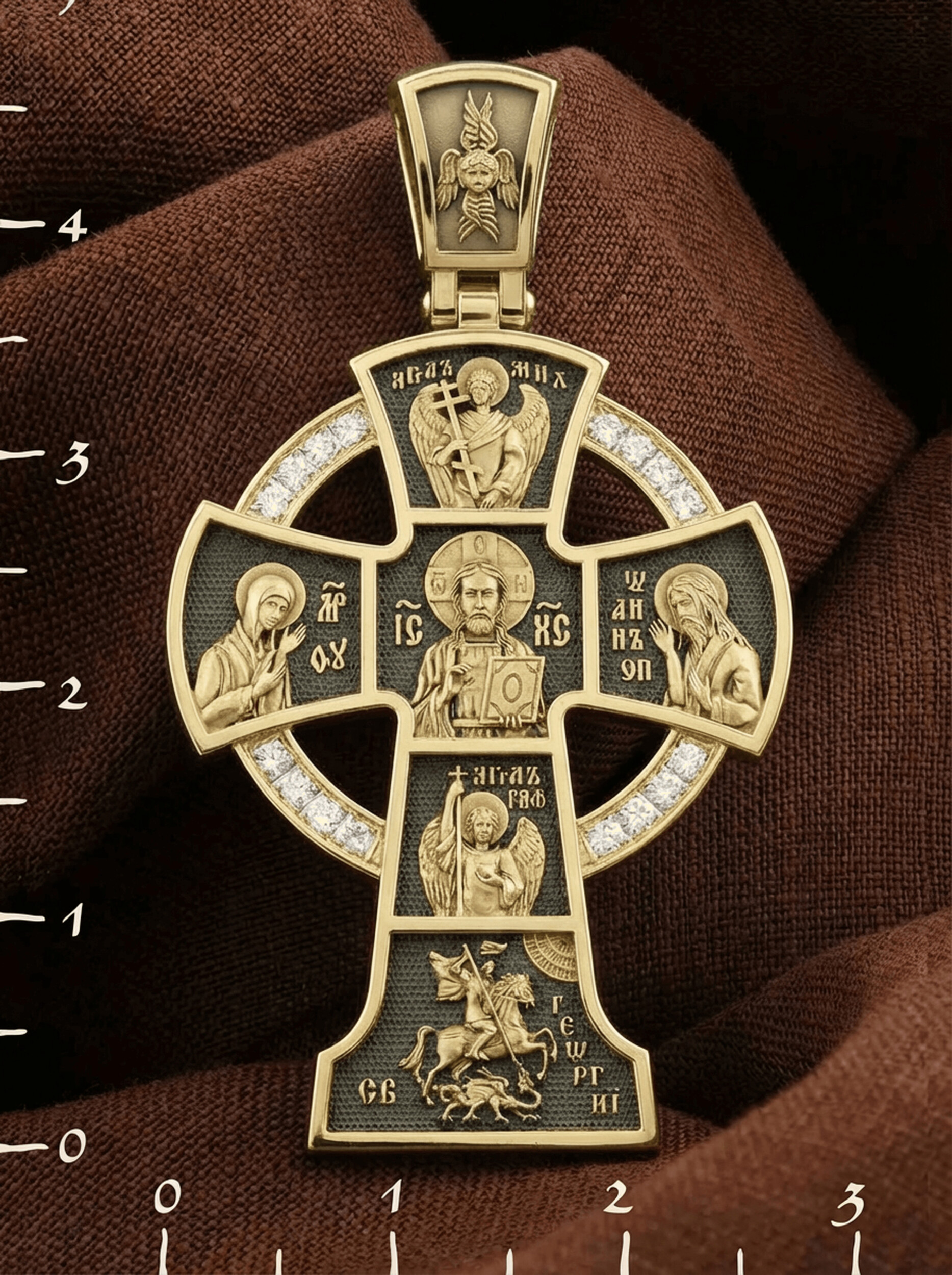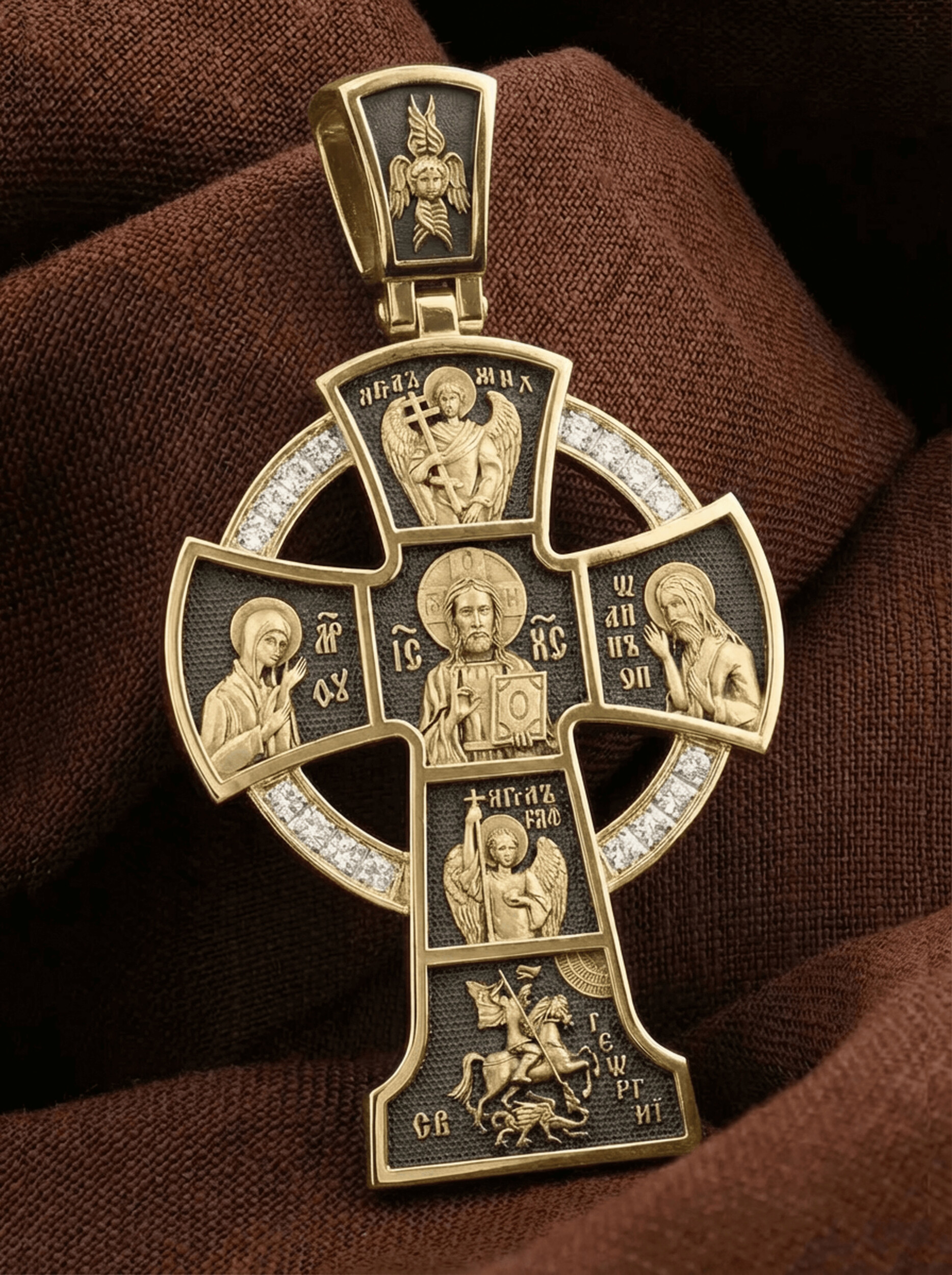 Вверху и внизу от спасителя предстоят два архангела, Михаил (Первый служитель Божественной славы, страж и защитник) и Гавриил (служитель Божественной крепости и изъявитель сокровенных Божьих тайн). Внизу помещен образ свт. Георгия Победоносца. Святой при жизни прославился не только как храбрый воин и твердый исповедник веры, но и как сострадательный, милосердный целитель и чудотворец. Святому молятся о покровительстве воинам и армии, о защите государства, сохранении и спасения России.