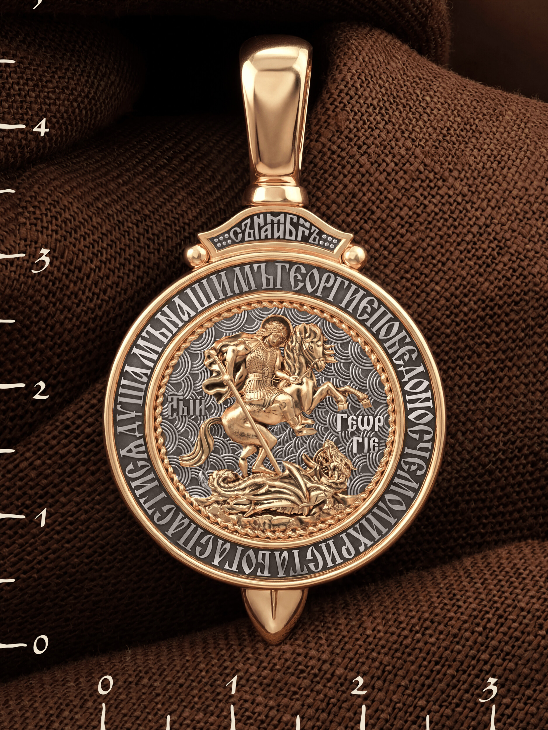 Основой композиции лицевой стороны является изображение Святого Великомученика Георгия Победоносца — одного из самых почитаемых и удивительных святых. На Руси он известен как Юрий или Егорий, покровитель воинов, помощник в крестьянском труде. На образке он изображен как воитель, сидящий на вздыбленном коне и поражающий копьем огнедышащего змея. Змей символизирует собою сатанинские силы. Молитвами вознесенными к Всевышнему и своей непреклонной верой он смог одолеть чудовище. Святой убил змея, спас царскую дочь, принесенную в жертву, и жителей города, их души от влияния дьявола, породив в них надежду и веру в Господа, призывая людей принять христианскую веру. Изображение святого великомученика Георгия Победоносца обрамлено словами молитвы: «Геогрие Победоносче, моли Христа Бога спастися душам нашим».