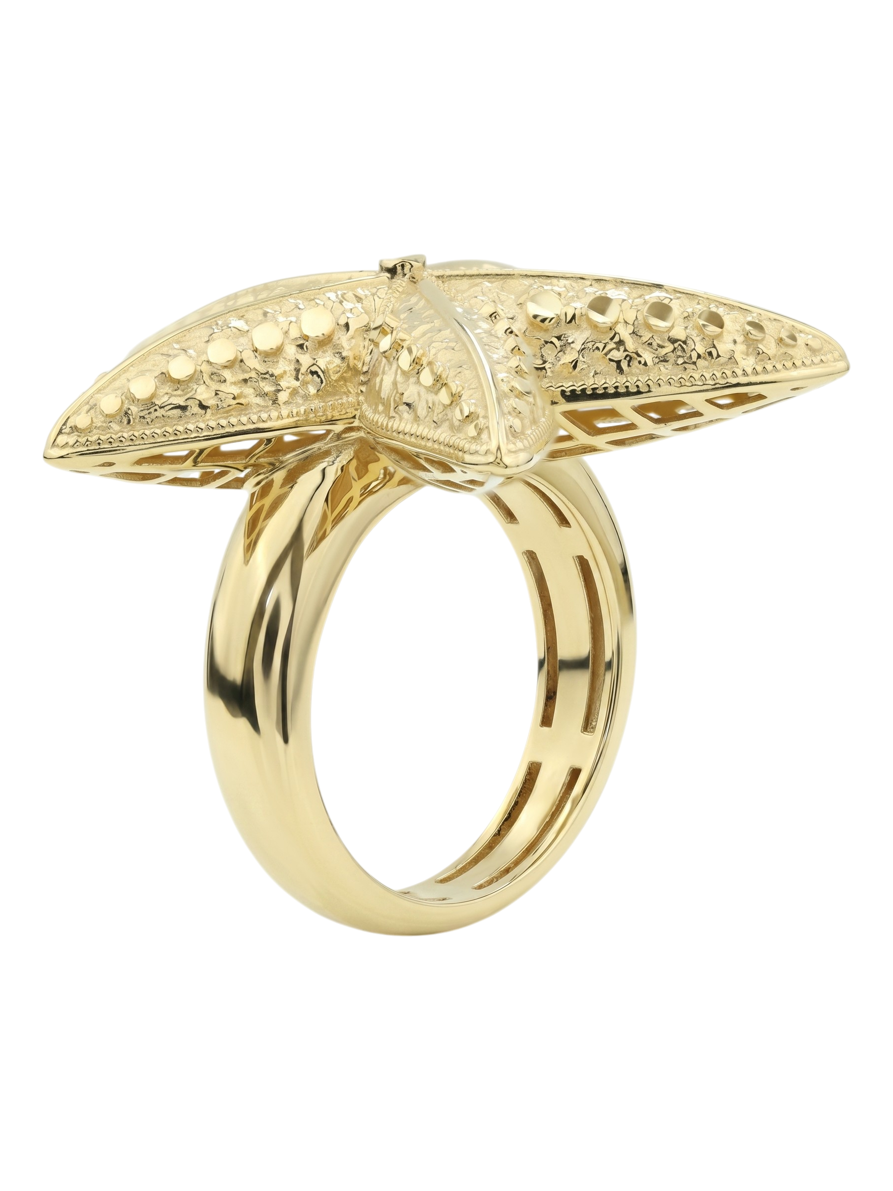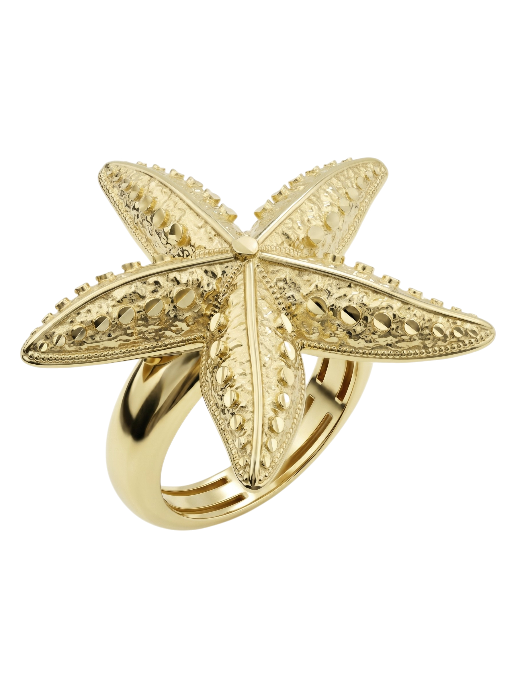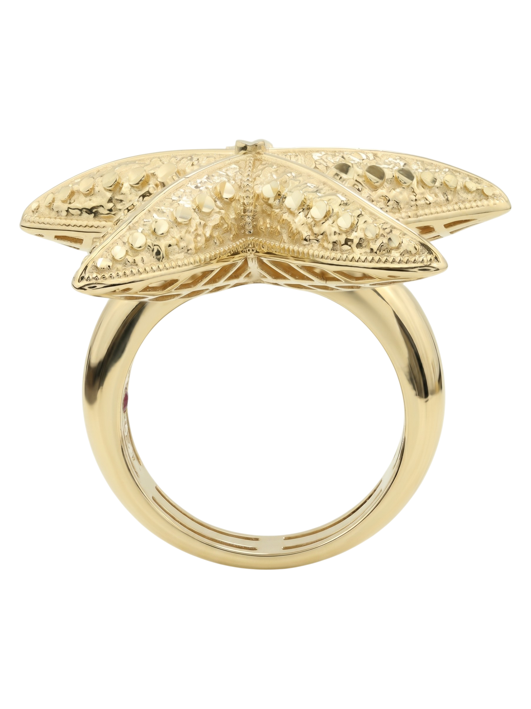 Кольцо из лимонного золота с рубином из коллекции Vioretty — Oceano воплощает собой смелый морской дизайн, который притягивает взгляд и подчеркивает индивидуальность. Это эффектное изделие выполнено в форме морской звезды, что придает украшению уникальный природный шарм. Изысканный лимонный оттенок золота 585 пробы создает гармоничную основу для центрального акцента — драгоценной вставки. Круглый рубин насыщенного красного цвета в центре звезды добавляет изделию роскоши и яркости.