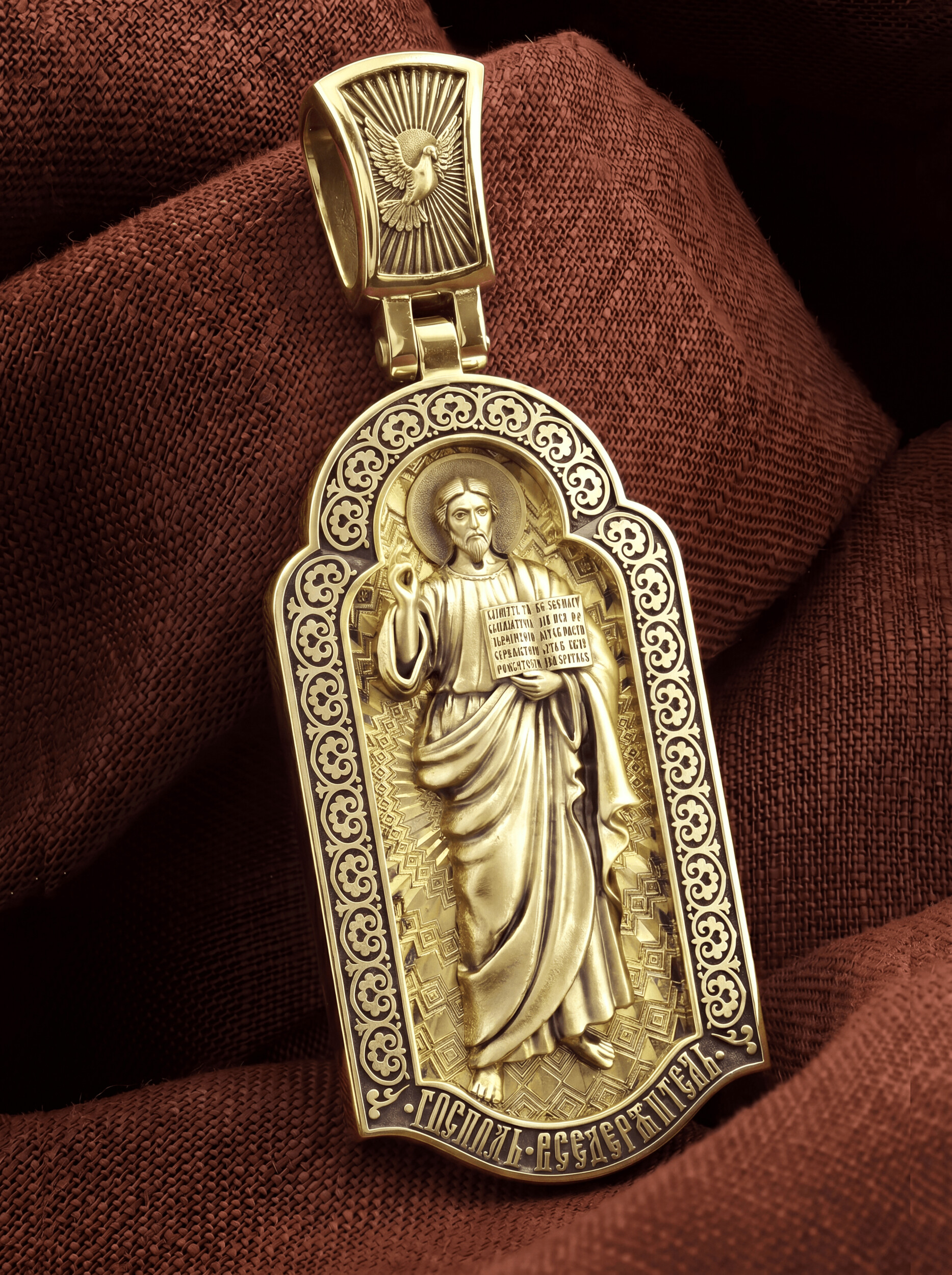 На лицевой стороне креста изображен Иисус Христос в образе Вседержителя, по-гречески «Пантократор». Это древнейший образ Спасителя, на котором Он представлен как властелин и правитель мира. Христос держит в руках Книгу, которая символизирует Книгу Бытия, то есть весь сотворенный Богом мир. В этой Книге судьбы всех людей, живущих на земле. Часто эту Книгу образно называют Книгой Жизни. Первое дошедшее до нас подобное изображение датируется VI веком и хранится в монастыре Святой Екатерины на горе Синай. Такие образы Христа с глубокой древности писались и в Палестине. Но Святая земля так часто подвергалась разграблению завоевателями, что древних икон там не осталось. Большинствоикон в храме Воскресения Христова были созданыв XIX веке.