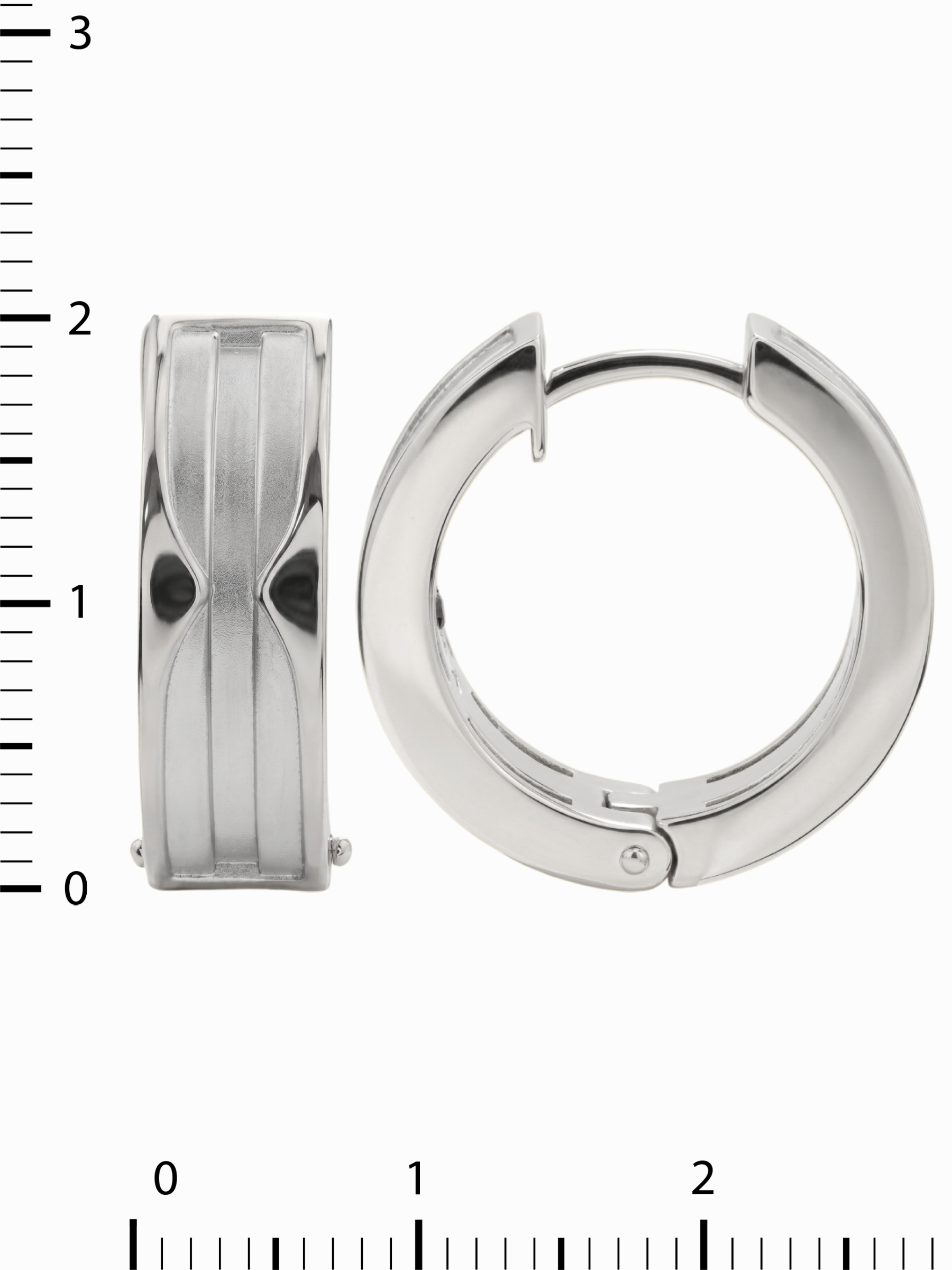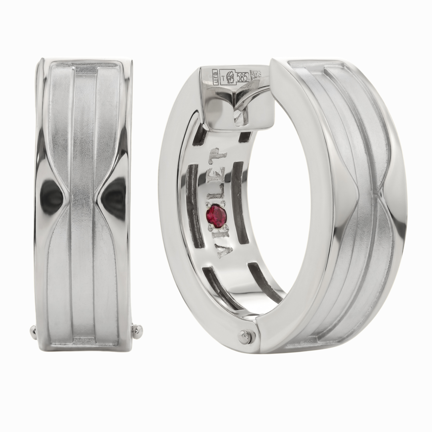 Особую выразительность модели придает вставка: два рубина круглой формы насыщенного красного цвета. Эти драгоценные камни, скрытые внутри конструкции, добавляют украшению глубины и загадочности, создавая эффектный контраст с холодным сиянием белого золота. Тщательно проработанная фактура поверхности подчеркивает статус изделия и его высокое качество исполнения.