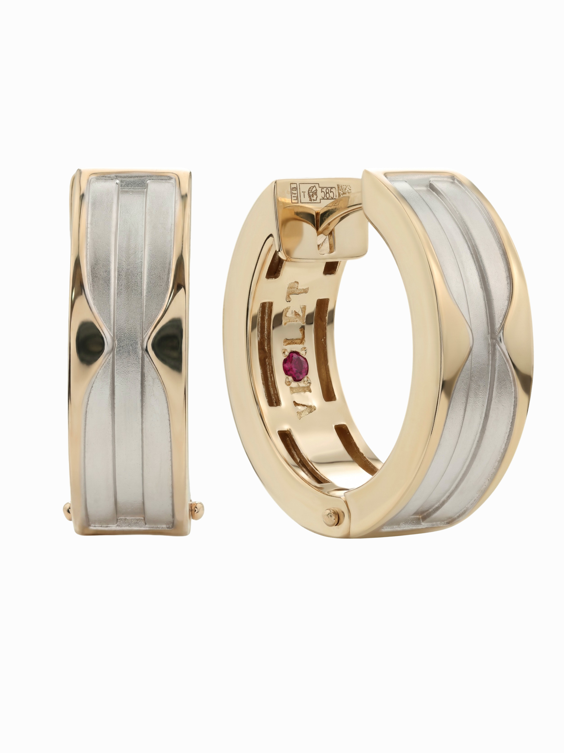 Элегантность и сдержанный стиль объединились в этих выразительных серьгах из коллекции Vioretty — DEMETRA. Ювелирное изделие выполнено из красного золота 585 пробы, что обеспечивает благородный оттенок и долговечность украшения. Дизайн модели отличается геометрической строгостью, сочетающей в себе гладкие полированные поверхности и матовые акценты, создающие эффектный контраст. Особую глубину композиции придает скрытая интрига: внутри каждой серьги закреплен небольшой рубин красного цвета круглой формы.