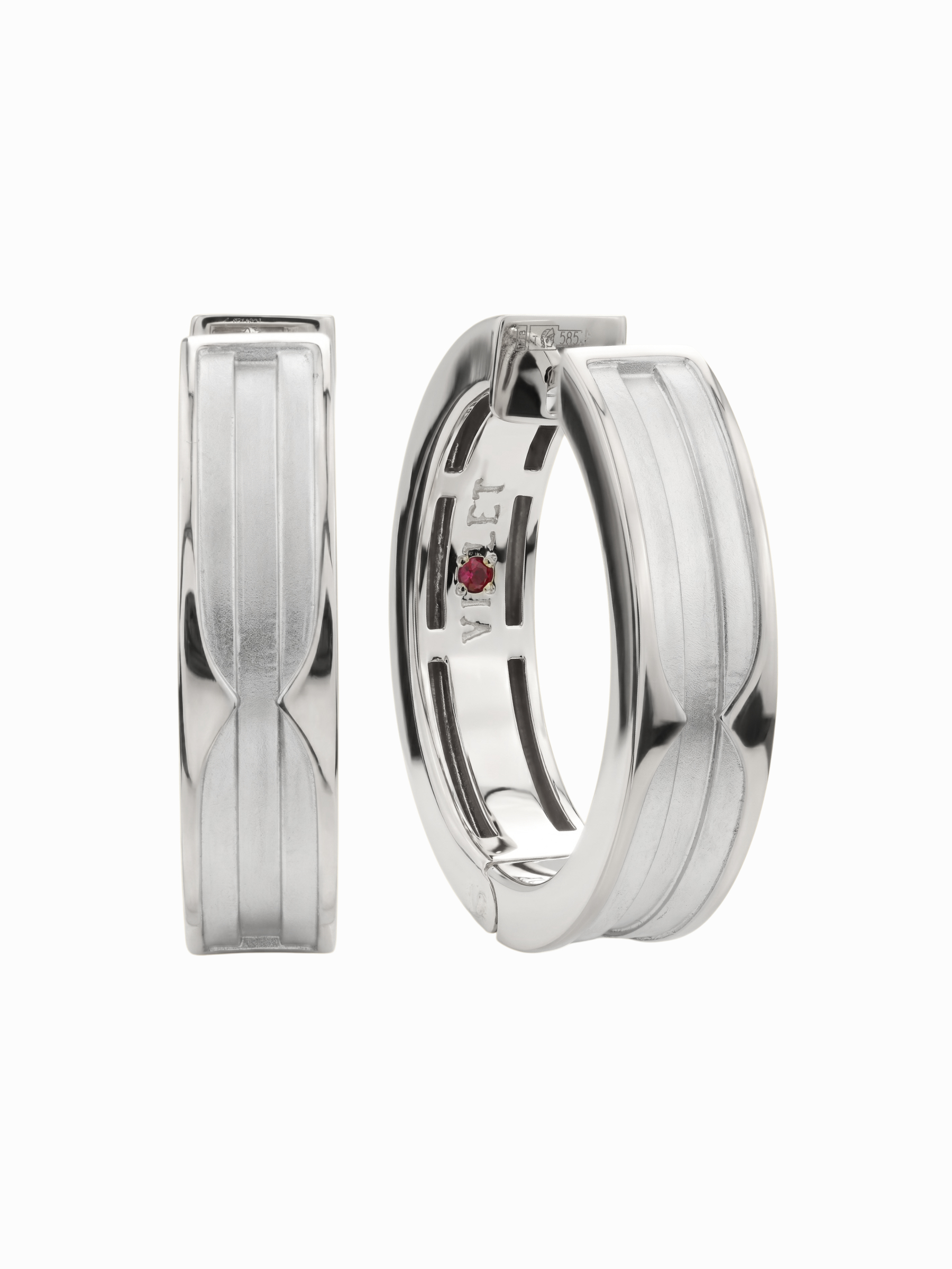 Серьги из белого золота 585 пробы из коллекции Vioretty — DEMETRA представляют собой воплощение современной эстетики и ювелирного мастерства. Это изделие, выполненное в благородном белом цвете, привлекает внимание своей лаконичной геометрической формой и продуманными деталями дизайна. Отличительной особенностью модели является скрытый акцент — по одной инкрустации в каждом украшении. В качестве вставок использованы 2 натуральных рубина ярко-красного цвета с огранкой формы круг, которые придают строгому металлу особую выразительность.