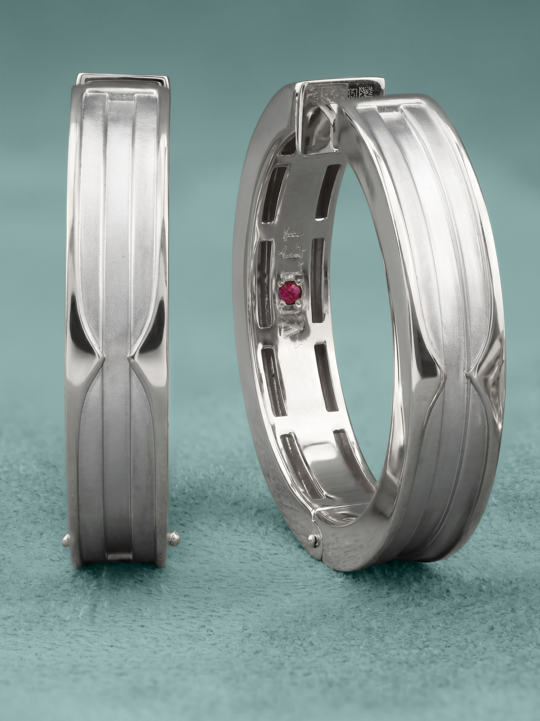 Уникальность данных серег заключается в их универсальности. Дизайн изделия позволяет носить эти серьги как женщинам, так и мужчинам, предпочитающим стильные и современные аксессуары. Качественная обработка металла и внимание к деталям делают это украшение подходящим для создания гармоничного образа. В конструкции использованы 2 вставки рубинов, которые придают модели особую выразительность. Данное ювелирное изделие станет отличным дополнением к вашей шкатулке или частью изысканного комплекта, который подчеркнет безупречный вкус владельца.