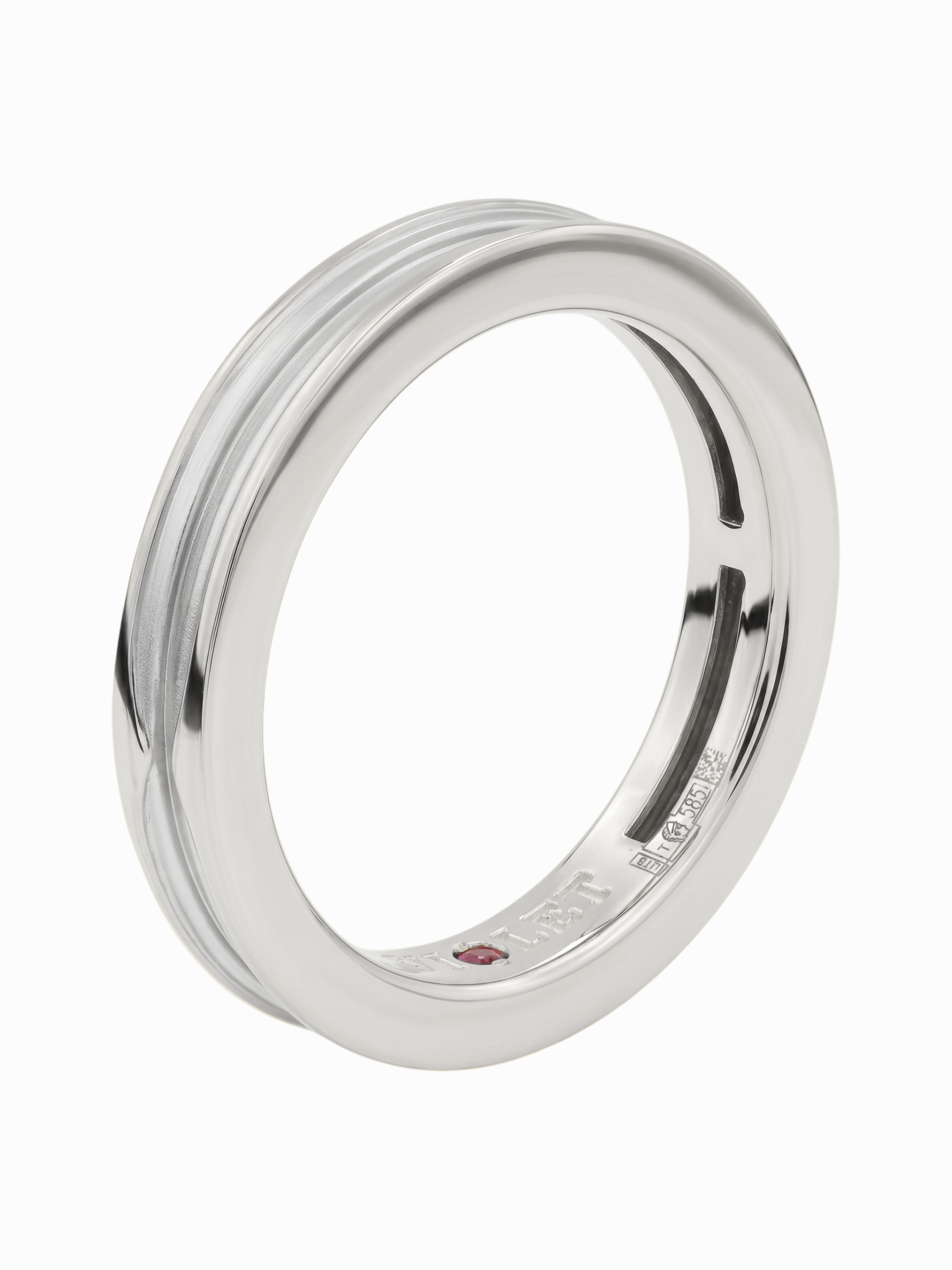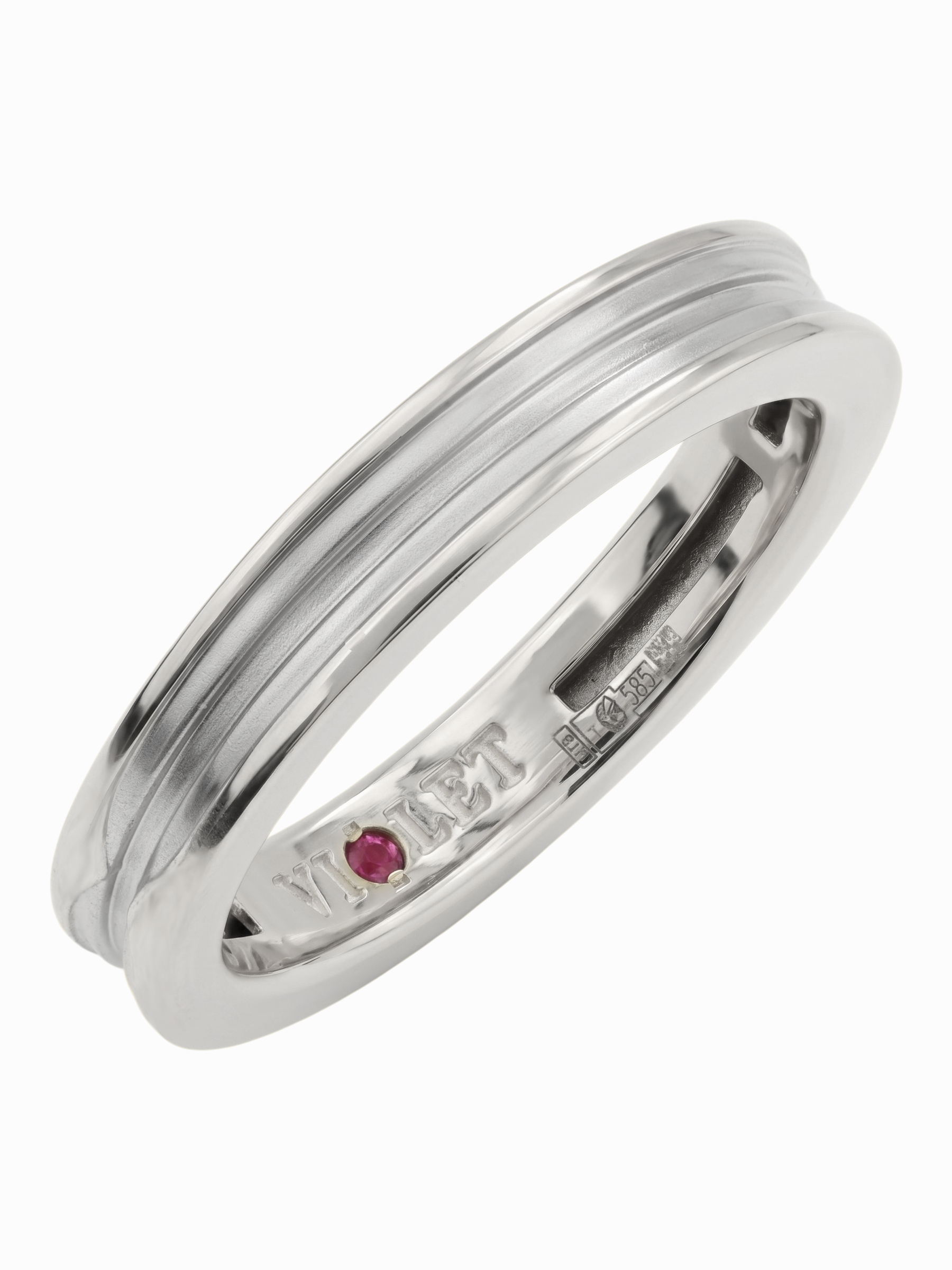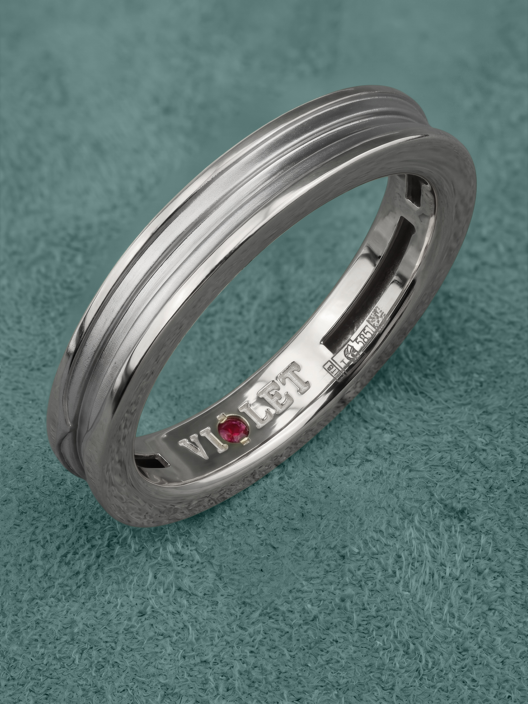 Особенностью модели является скрытая деталь — вставка из ярко-красного рубина круглой формы, расположенная во внутренней части шинки. Такое дизайнерское решение превращает классическое кольцо в личный амулет, секрет которого известен только владельцу. Глубокий оттенок красного камня гармонично контрастирует с холодным цветом материала. Это украшение станет прекрасным дополнением к повседневному образу или завершающим акцентом делового костюма.