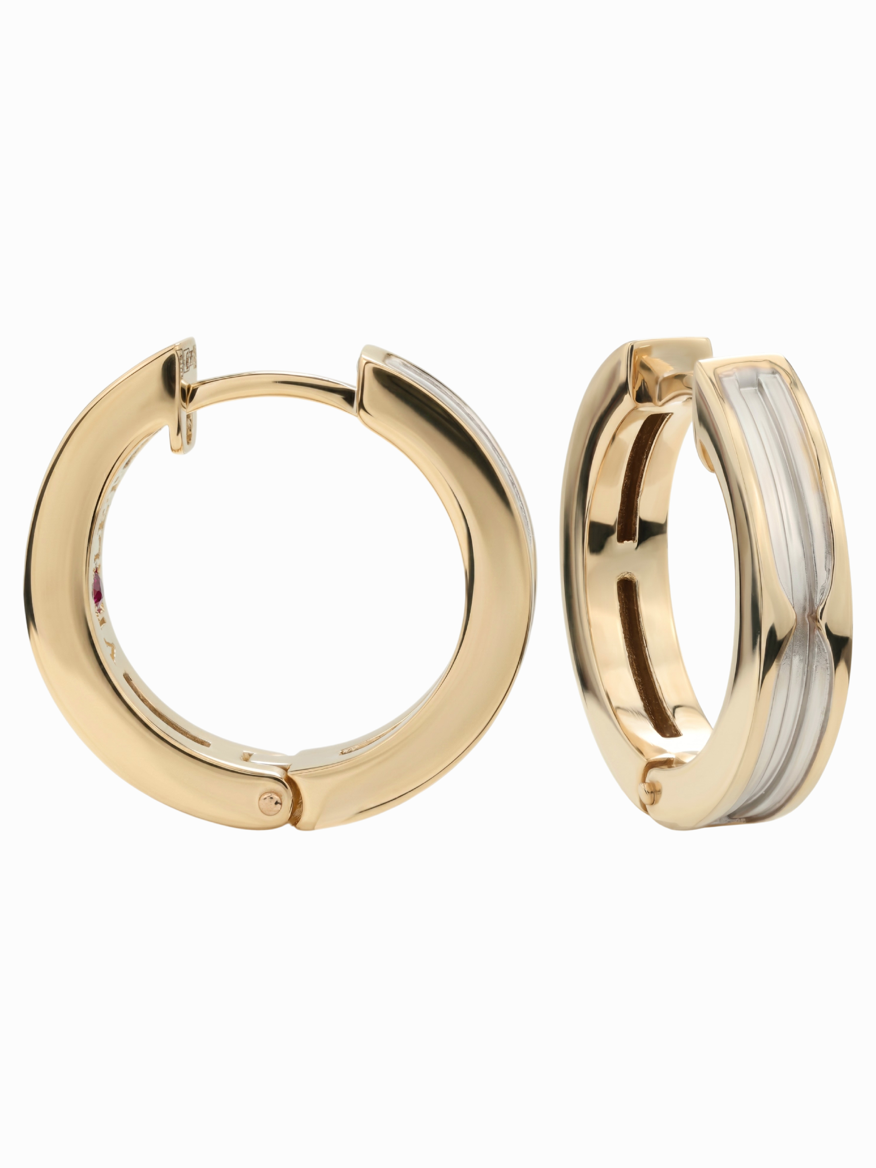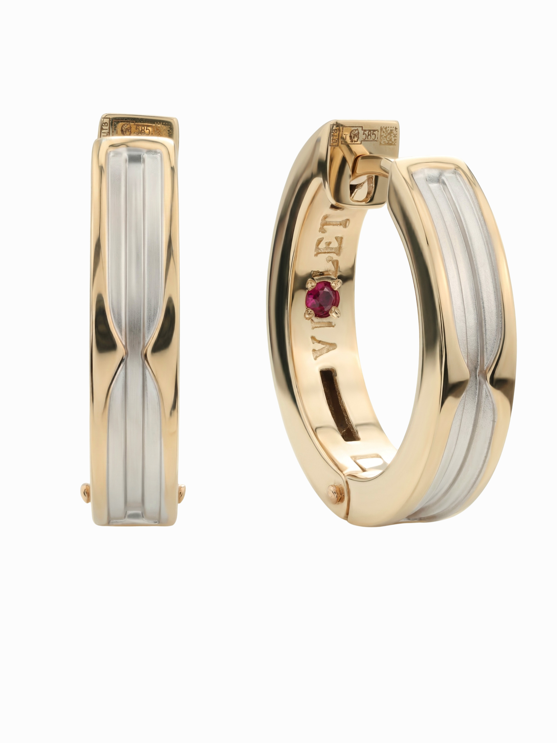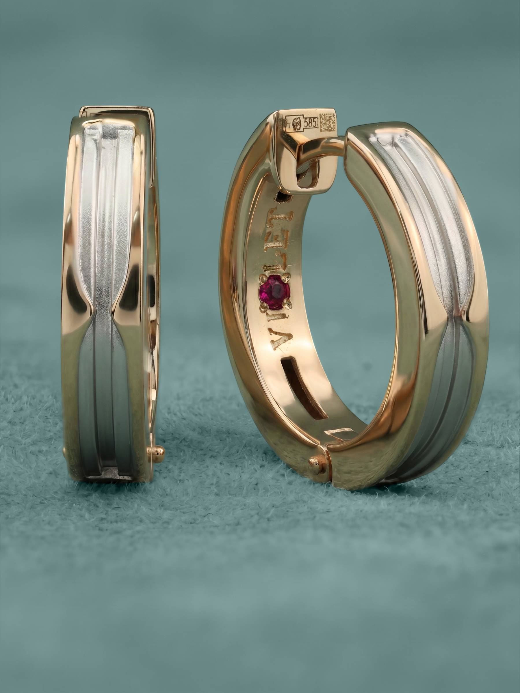 Особую выразительность украшению придает акцентная деталь — вставка из красного рубина круглой формы, расположенная во внутренней части обода. Всего в изделии использовано 2 вставки, создающие деликатный, но узнаваемый визуальный эффект. Мастерство исполнения подчеркивает благородный блеск красного золота, делая эти серьги универсальным выбором как для женщин, так и для мужчин. Лаконичная геометрия формы позволяет сочетать их с другими украшениями, создавая полноценные комплекты.