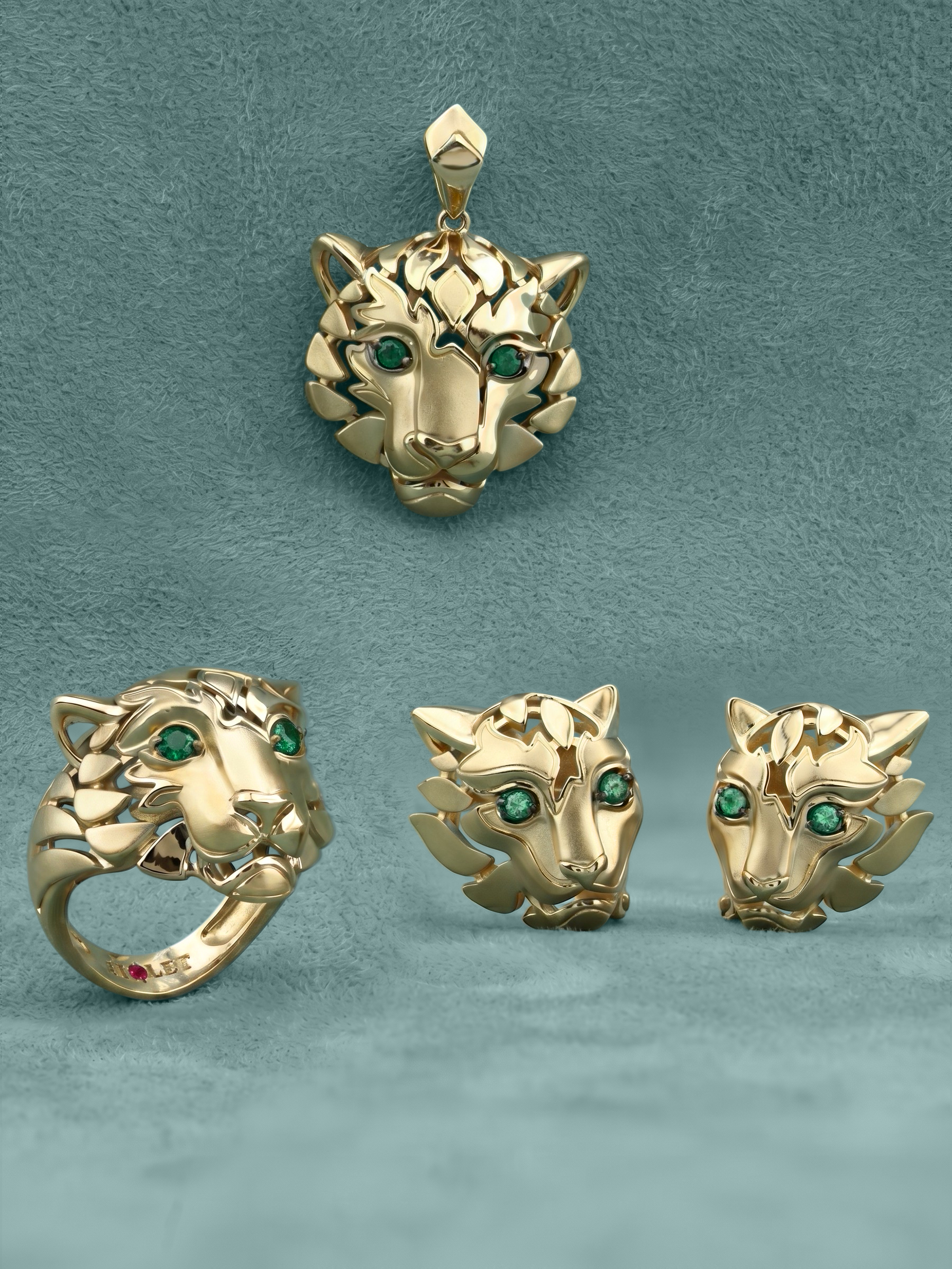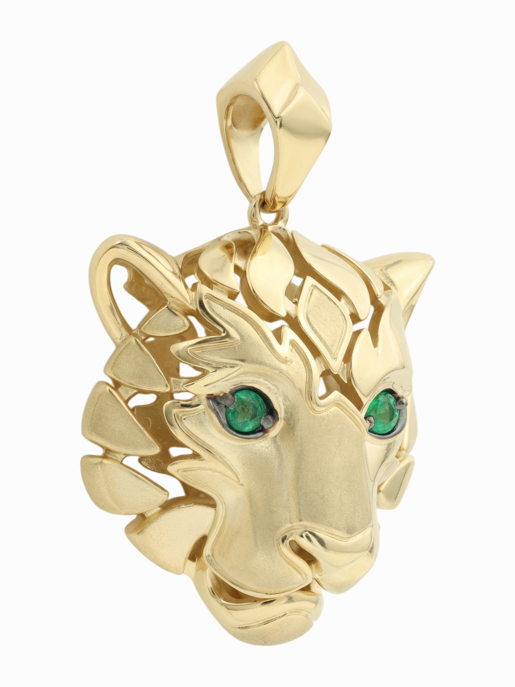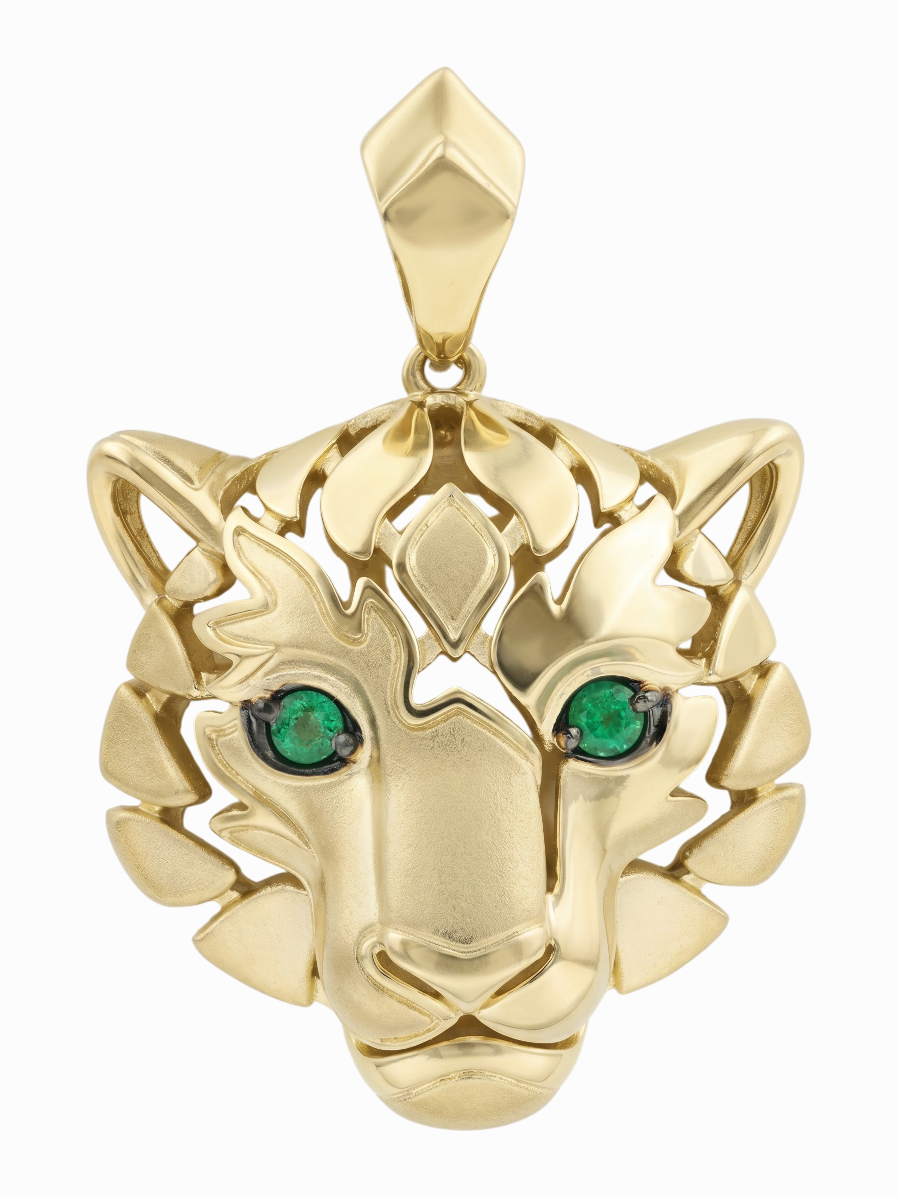 Центральным элементом композиции стали глаза хищника, инкрустированные двумя изумрудами круглой формы. Насыщенный зелёный цвет вставок в сочетании с теплым оттенком драгоценного металла придает изделию особое очарование и глубину. Гармоничные линии и проработанные детали позволяют подвеске выглядеть объемно и эффектно на любом типе цепи.