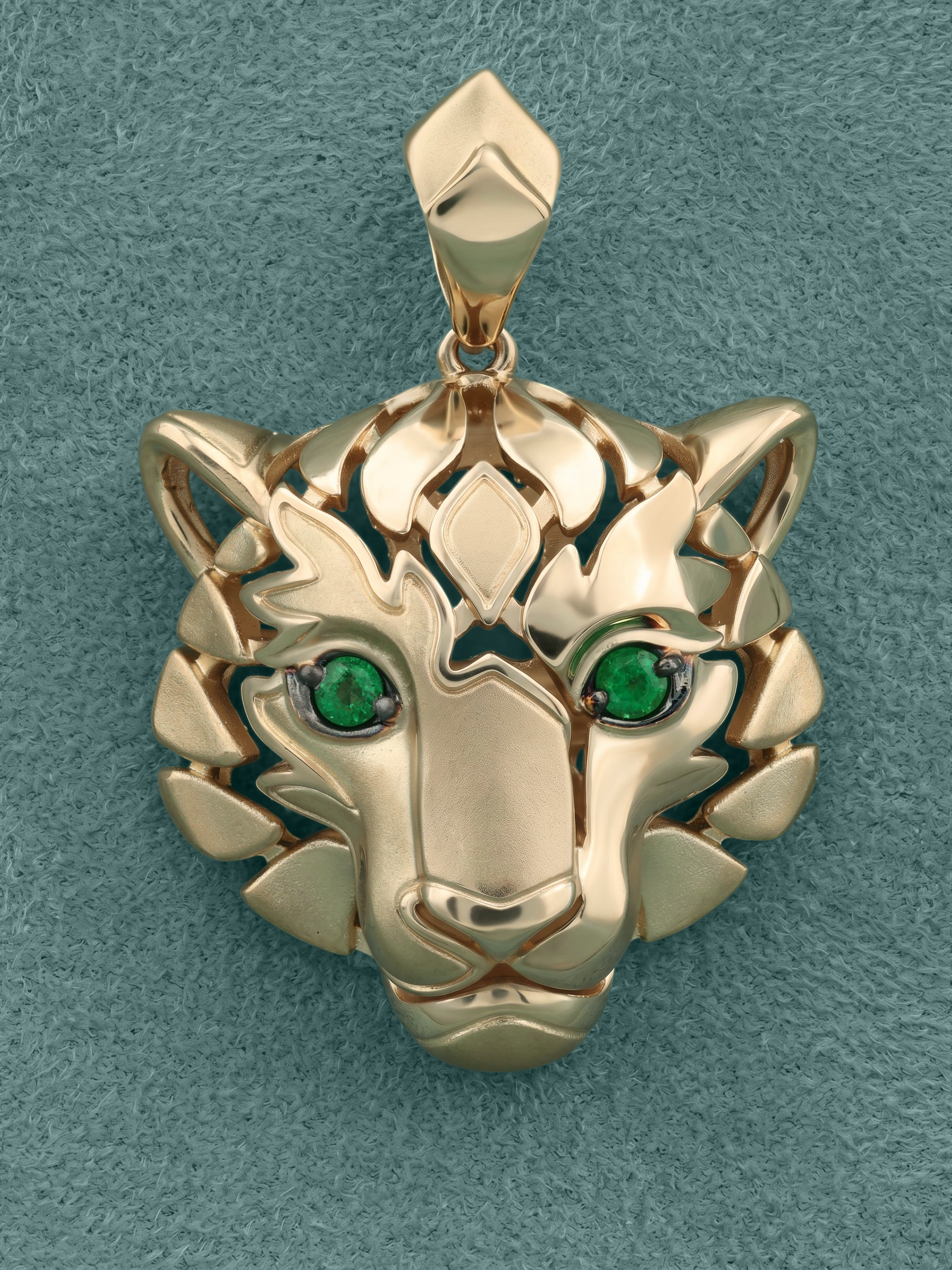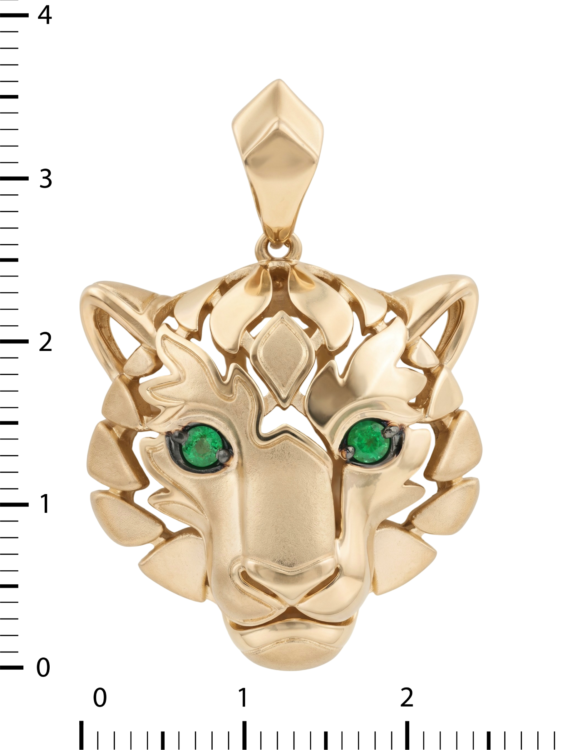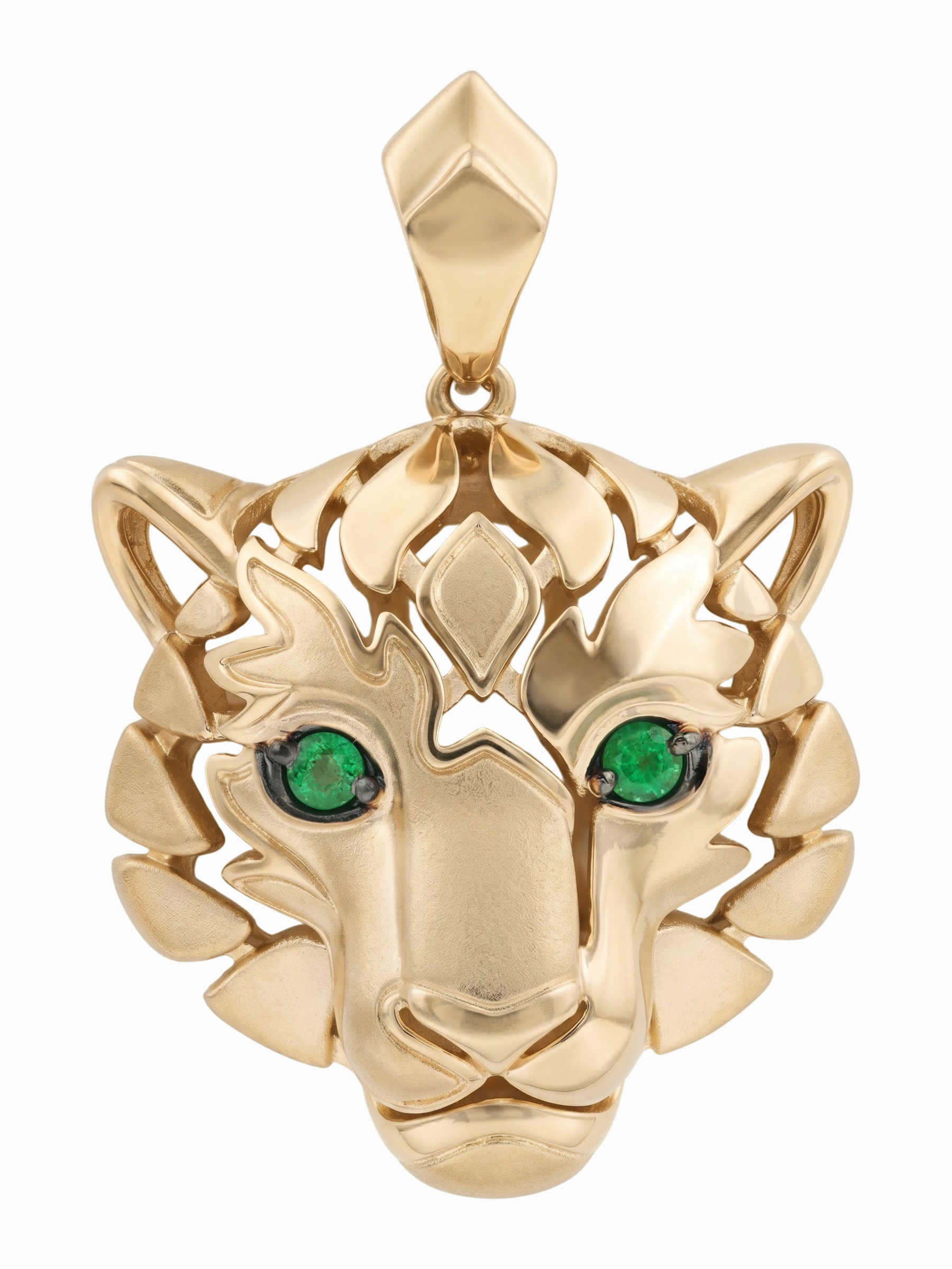 Взгляд хищника притягивает внимание благодаря двум глубоким изумрудам зеленого цвета круглой формы. Контраст между насыщенным цветом камней и сиянием красного металла делает этот аксессуар по-настоящему притягательным. Эта подвеска гармонично дополнит как повседневный, так и вечерний стиль, подчеркивая индивидуальность владельца.