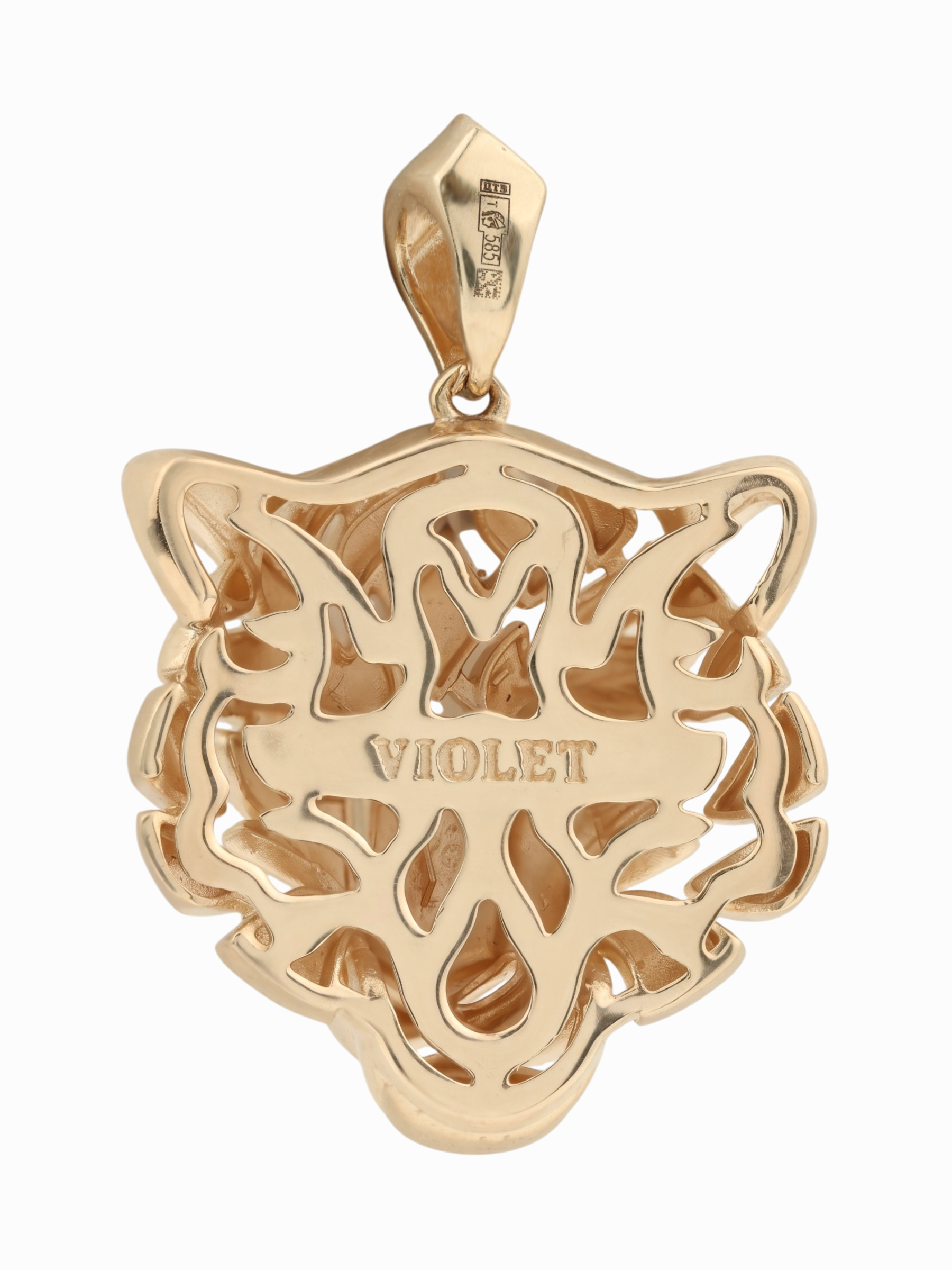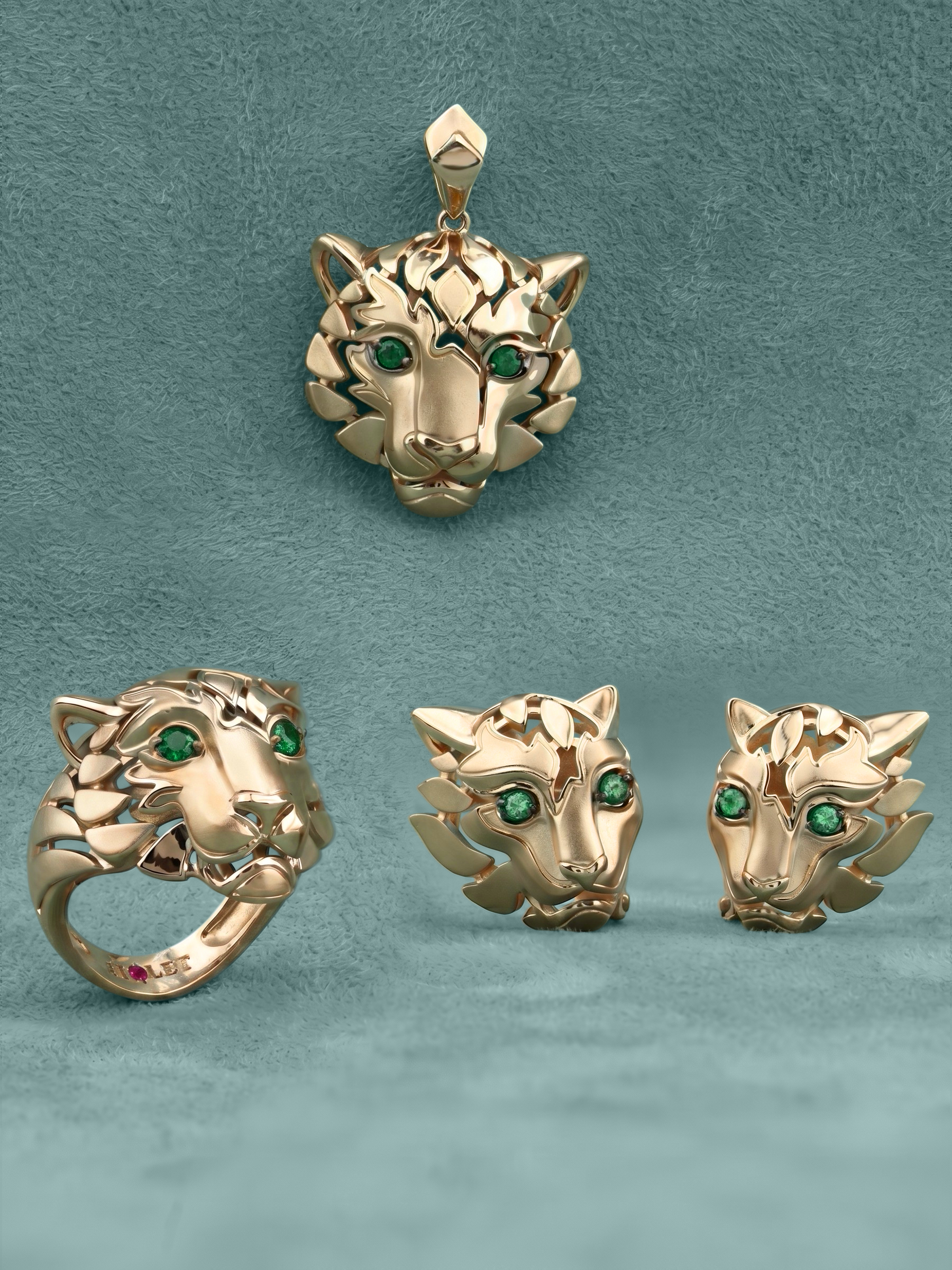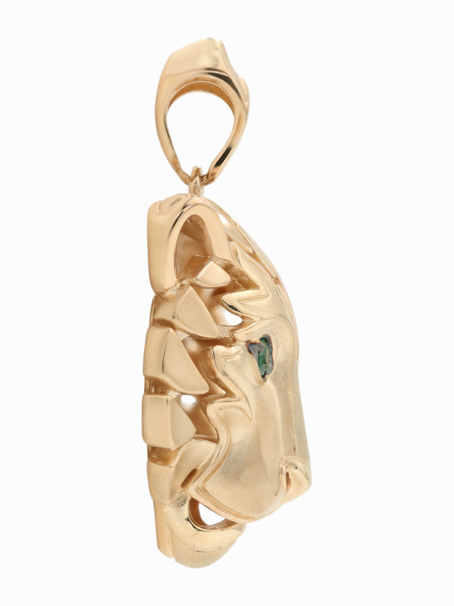 Взгляд хищника притягивает внимание благодаря двум глубоким изумрудам зеленого цвета круглой формы. Контраст между насыщенным цветом камней и сиянием красного металла делает этот аксессуар по-настоящему притягательным. Эта подвеска гармонично дополнит как повседневный, так и вечерний стиль, подчеркивая индивидуальность владельца.