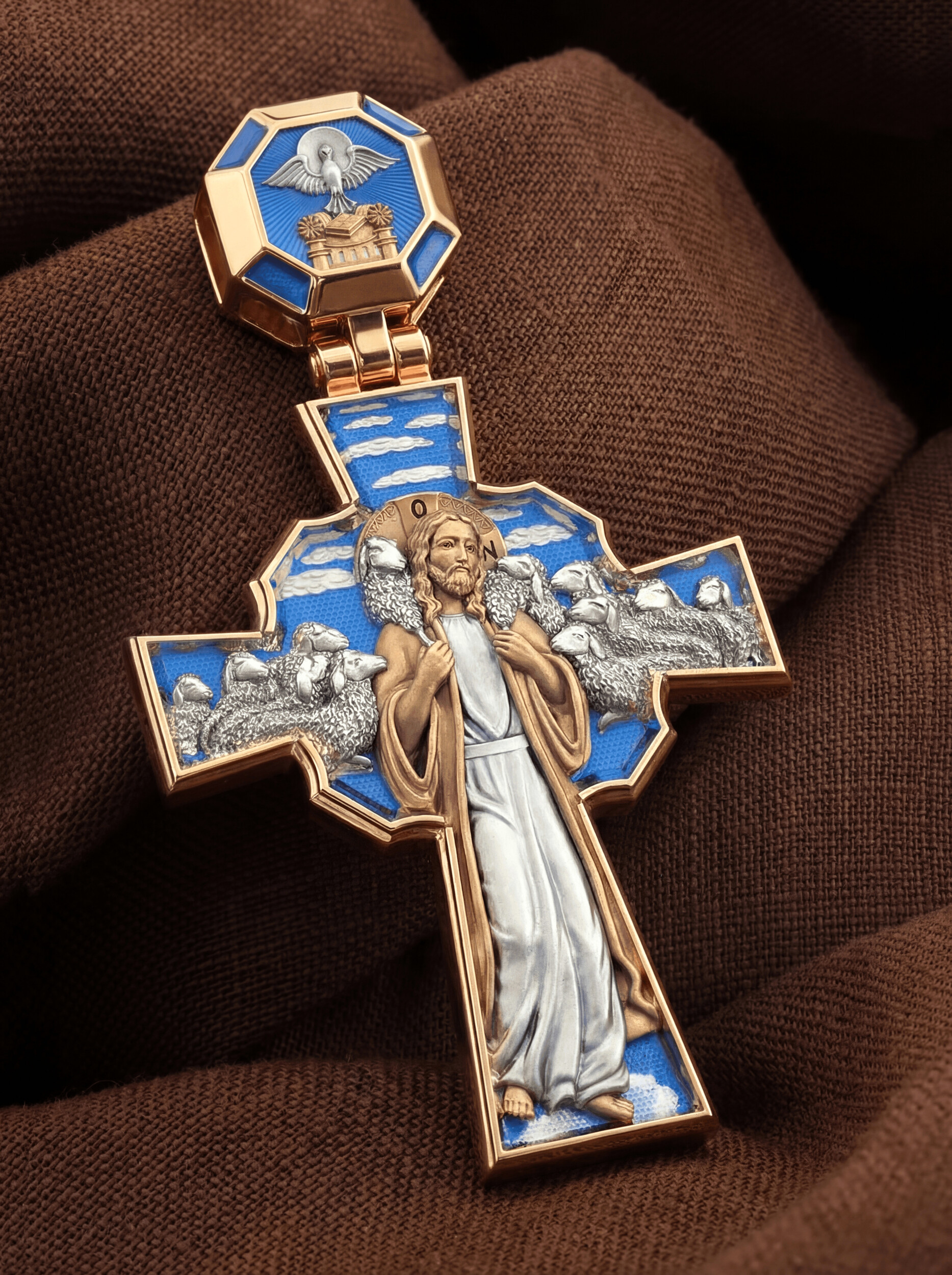 Но обратной стороне креста изображение Иисуса Христа. Добрый Пастырь — символическое именование и изображение Иисуса Христа, заимствованное из Ветхого Завета и повторенное Христом в Новом Завете в своей роли учителя. Иисус изображается с заблудшей овцой, вскинутой на плечи (Лк. 15:3−7).