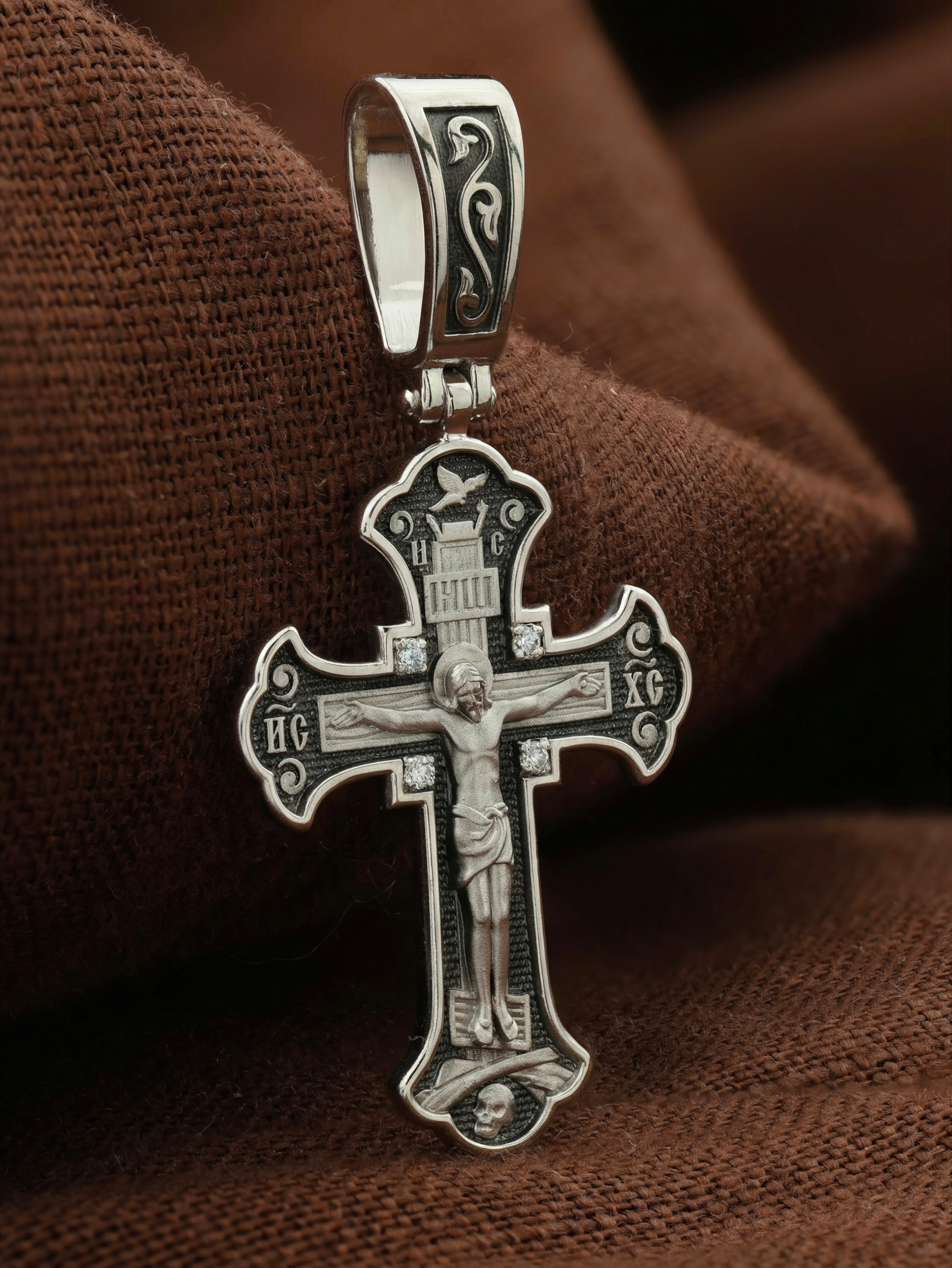 На лицевой стороне этого креста центральную часть занимает икона Распятия Христа — образ жертвы, принесенной Господом за грехи людей. Именно ко Христу, сошедшему на землю ради нашего спасения, возносятся все молитвы. Пресвятая Богородица, ангелы и святые — помощники Господа в деле спасения и заступники за людей перед Богом. «Оружием великим Христовым» именует Церковь крест, потому что, претерпев страдания и умерев, Господь победил смерть и лишил дьявола его власти над миром. Поэтому рядом с титлами Святого имени Христа написано «НИКА», что значит «победитель».