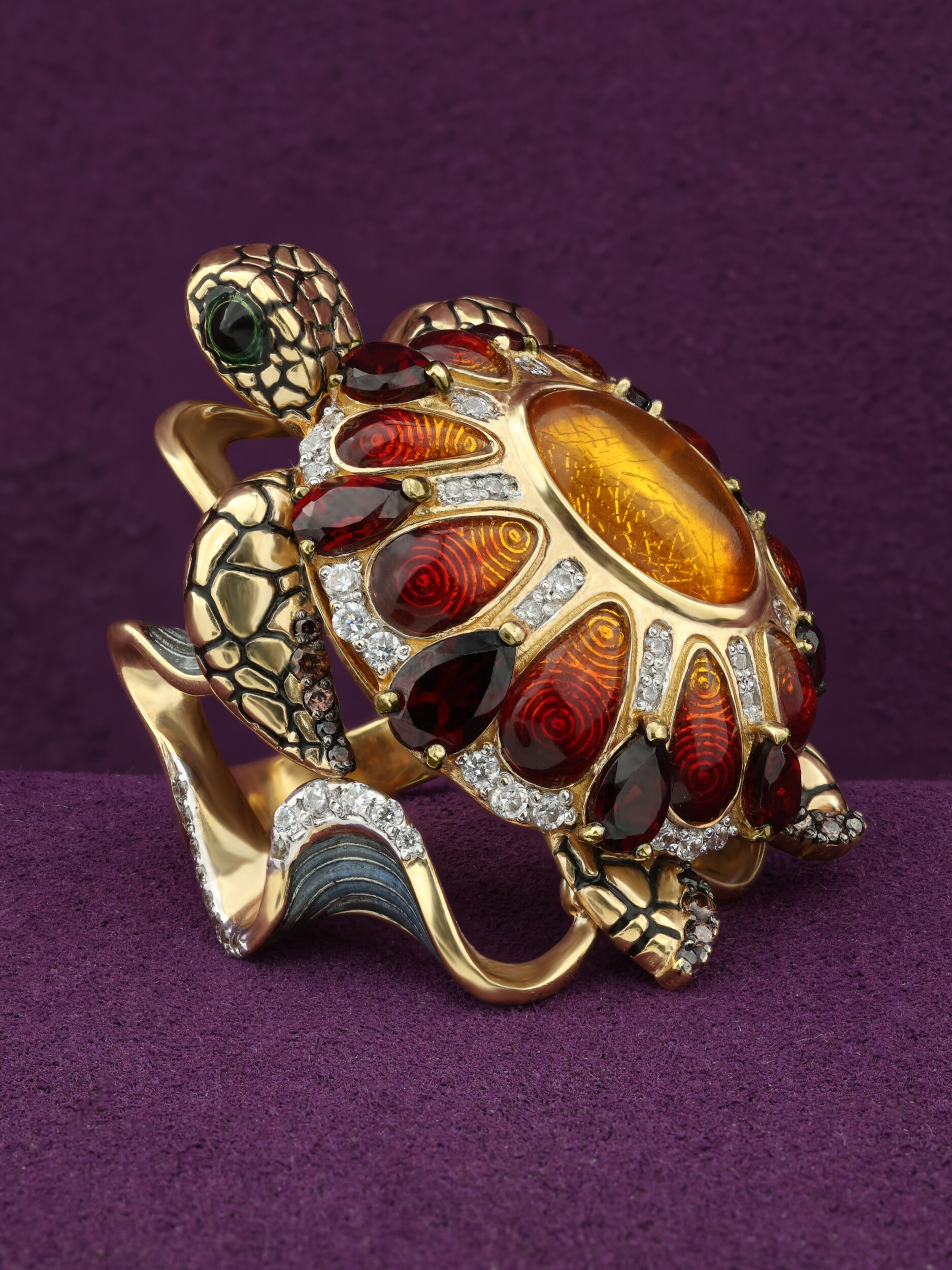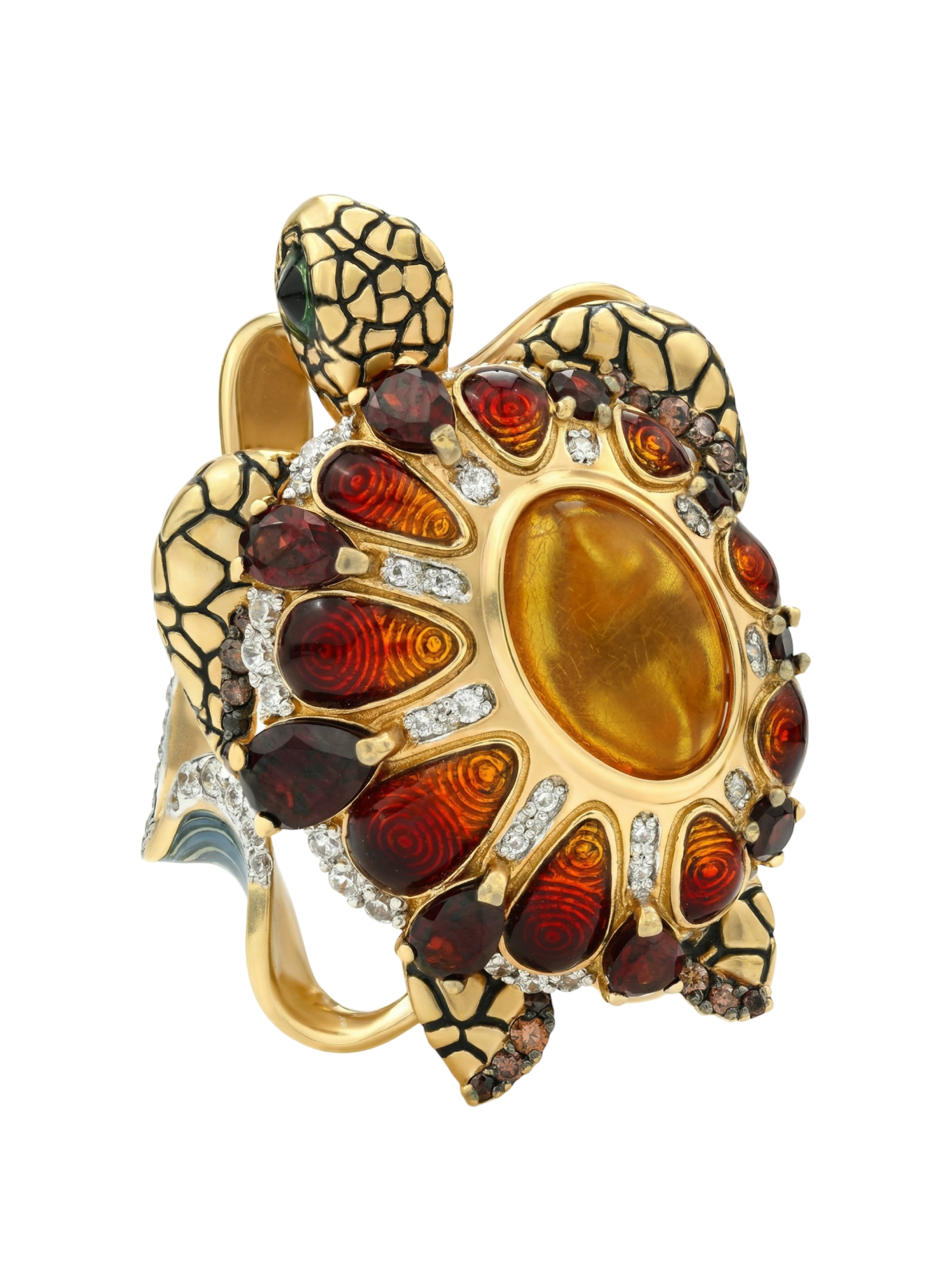 Кольцо из лимонного золота c эмаль , фианитом, гранатом и янтарём