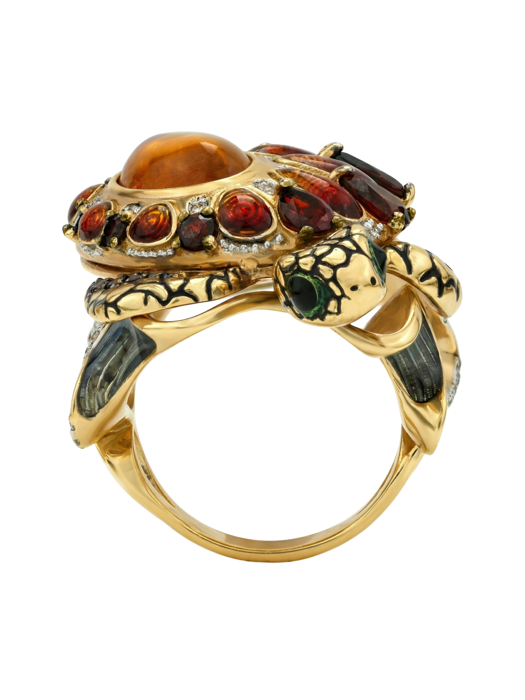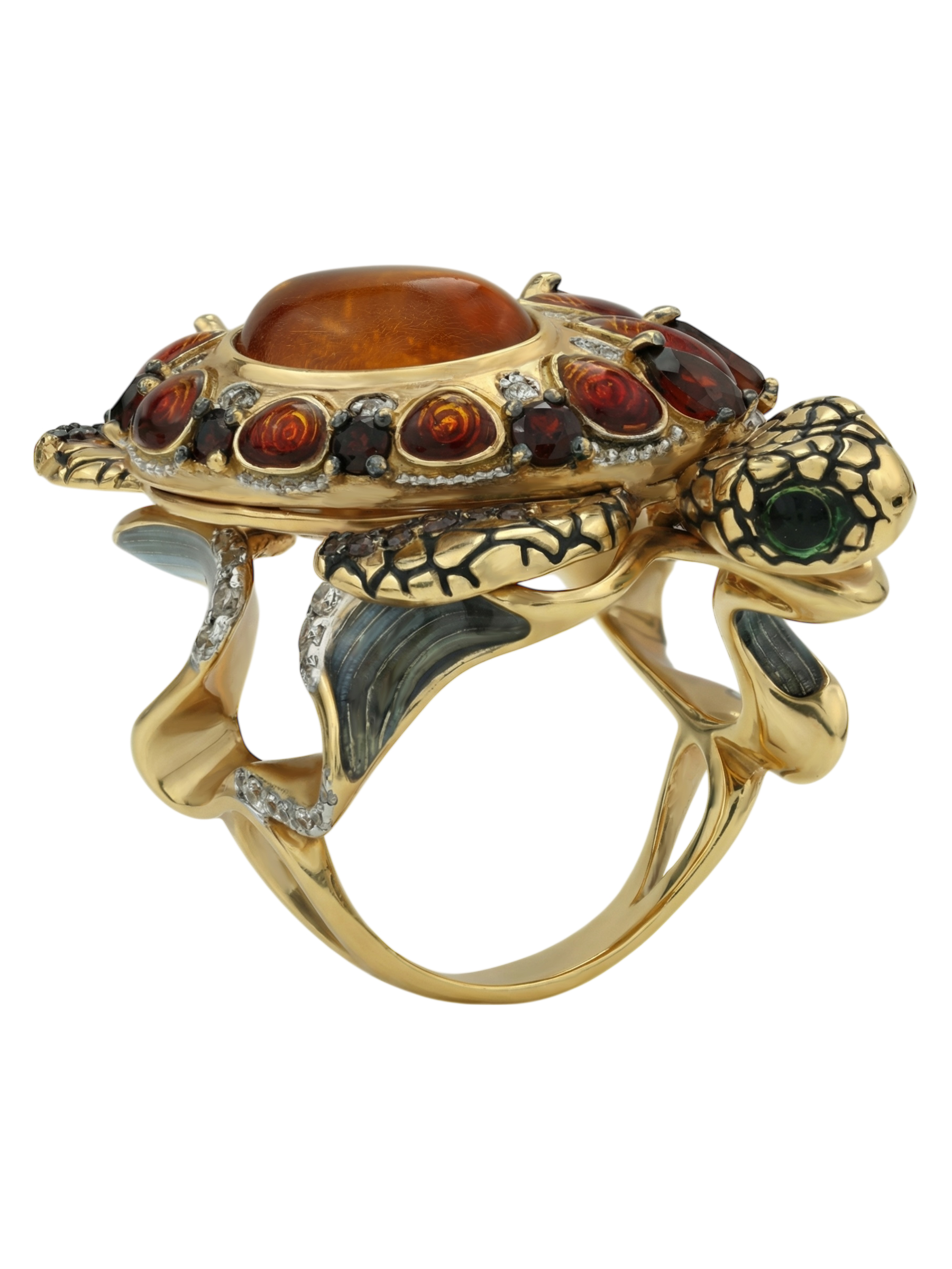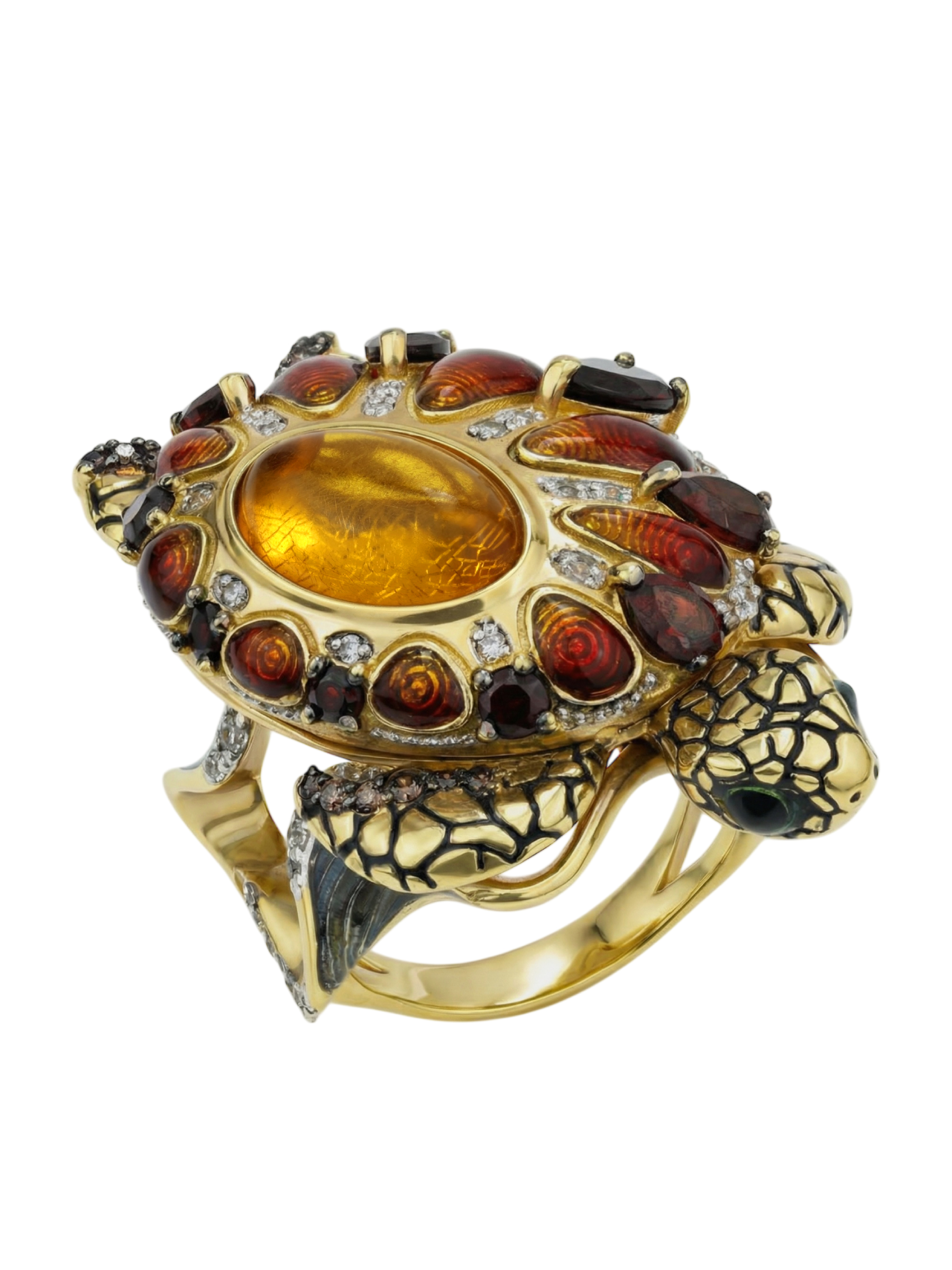 Кольцо из лимонного золота c эмаль, фианитом, гранатом и янтарём