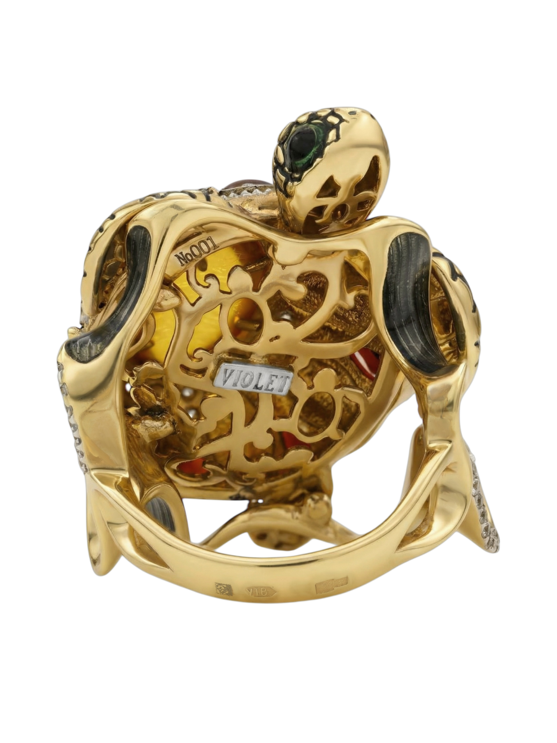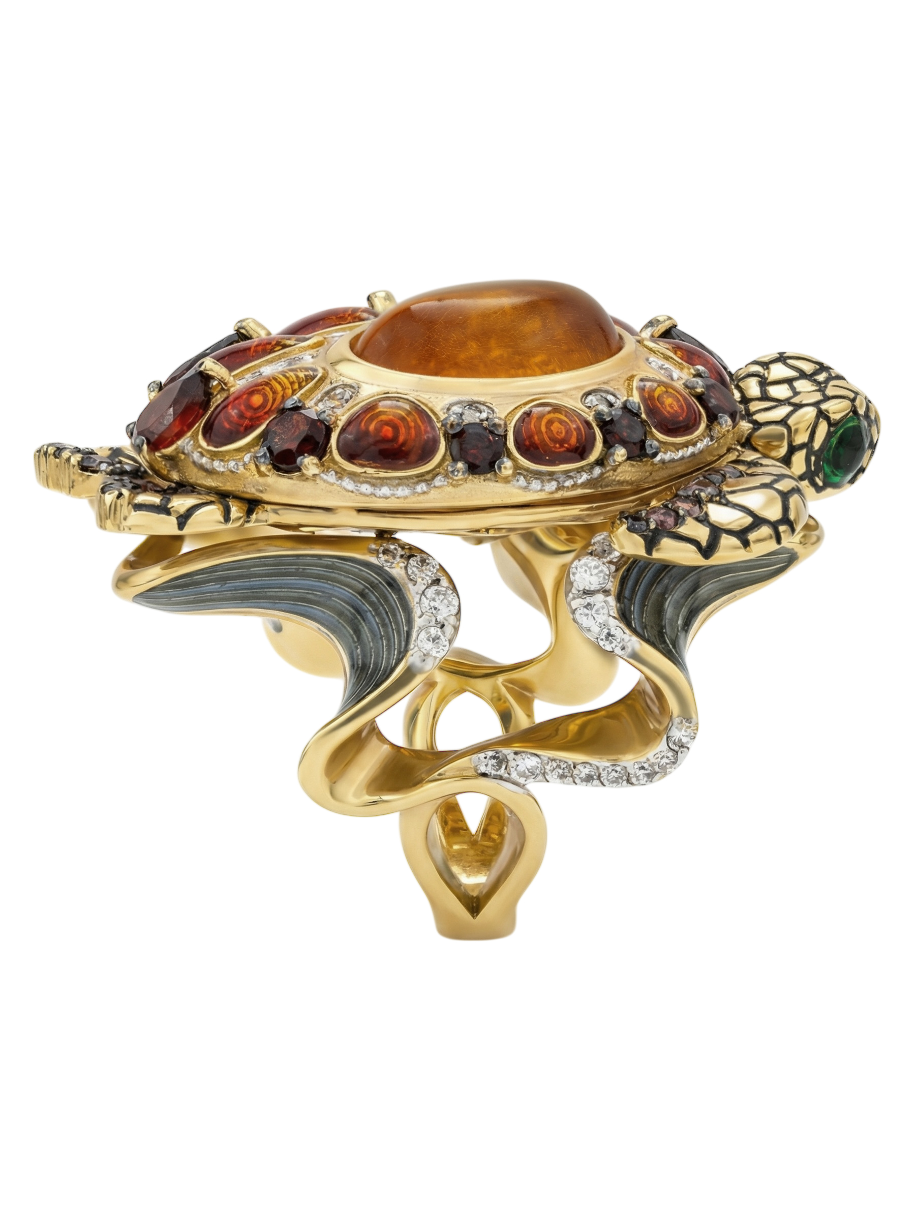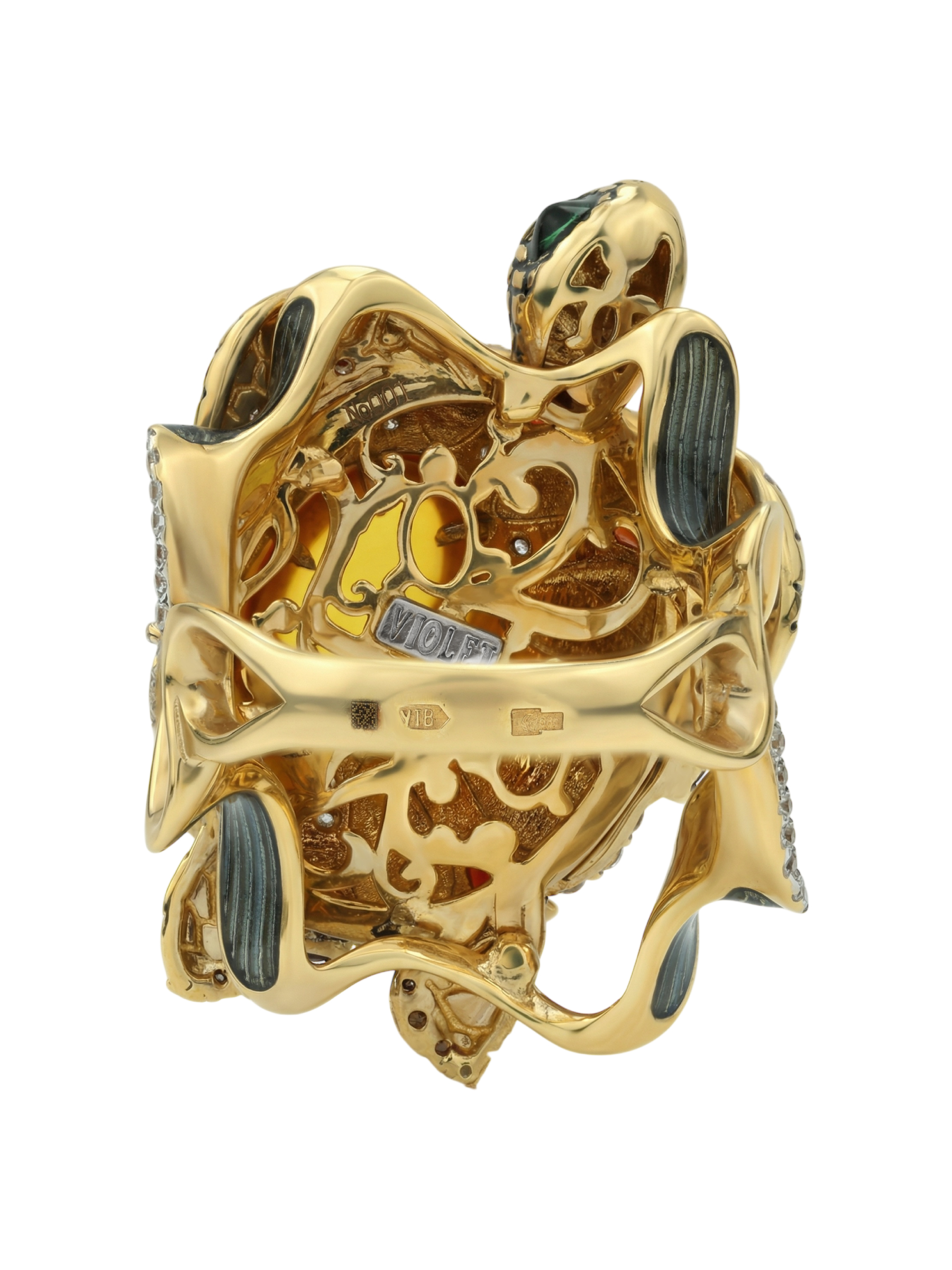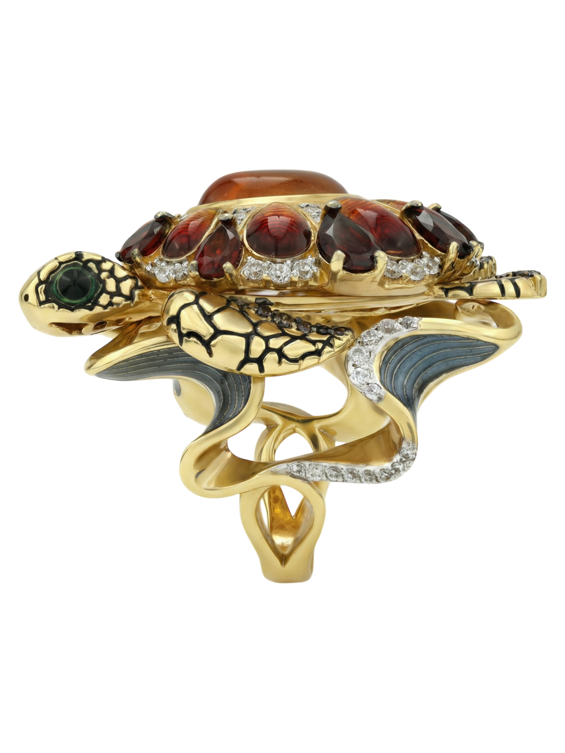 Кольцо из лимонного золота c эмаль, фианитом, гранатом и янтарём