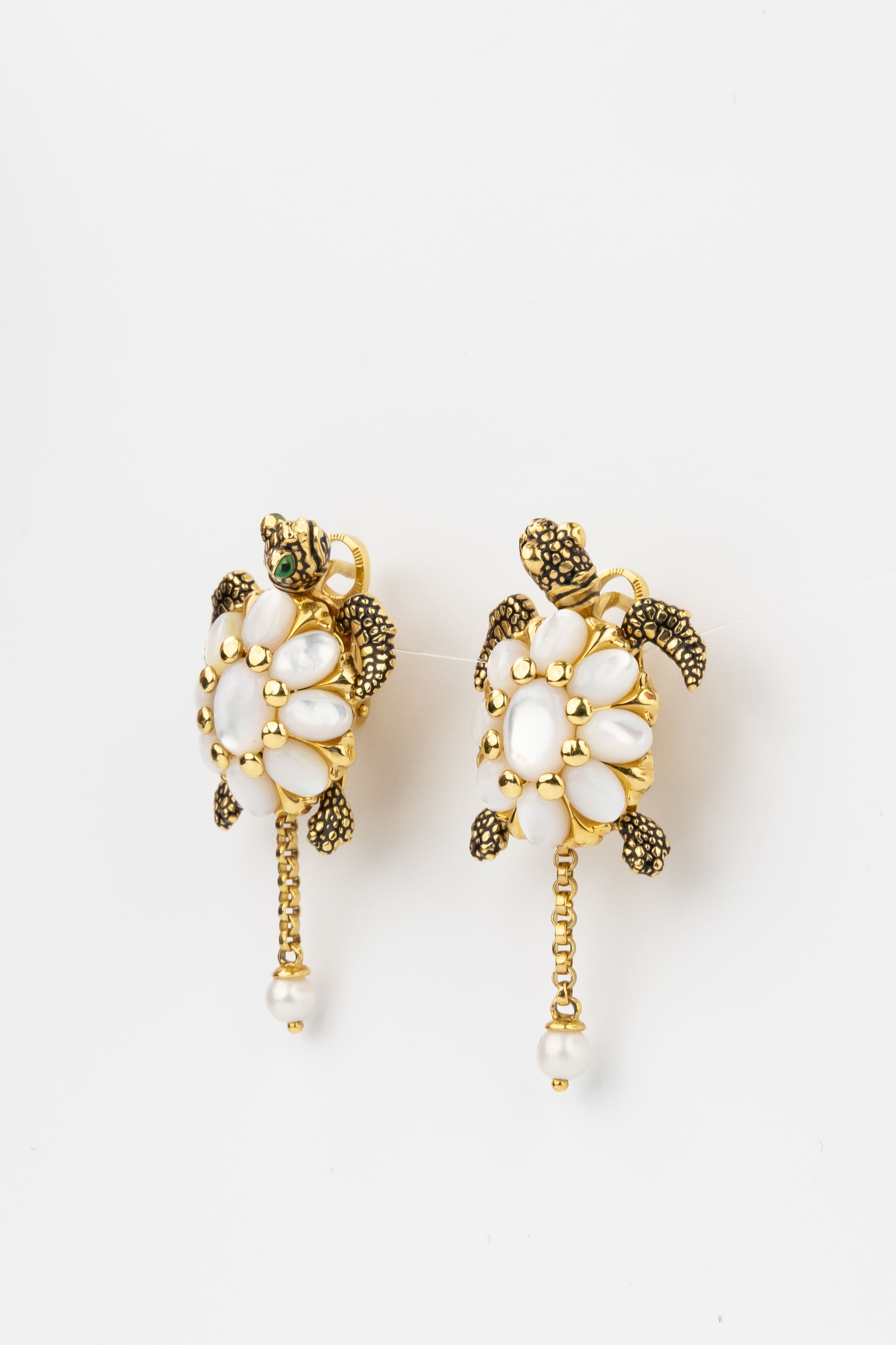 Серьги из лимонного золота c эмаль, жемчугом и перламутром
