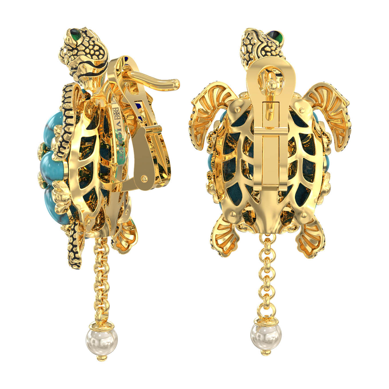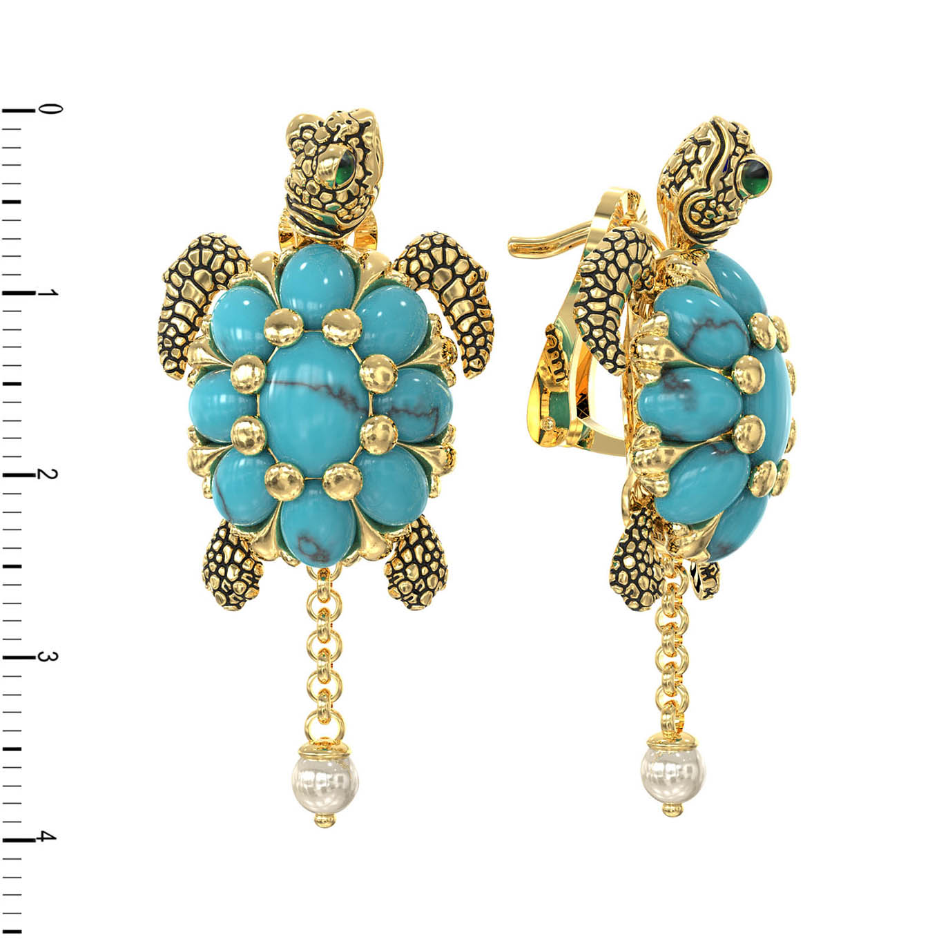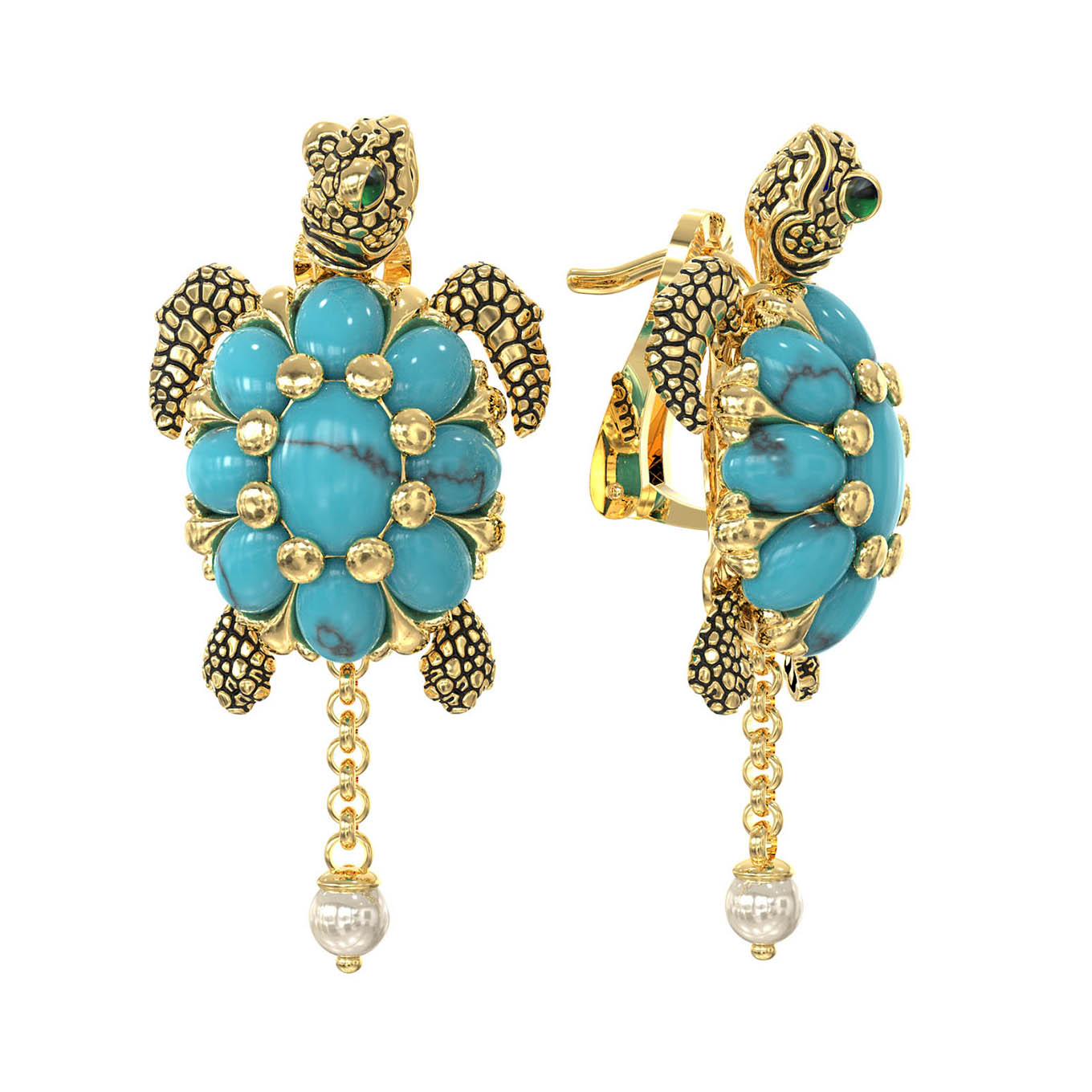 Серьги из лимонного золота c эмаль, жемчугом и бирюзой