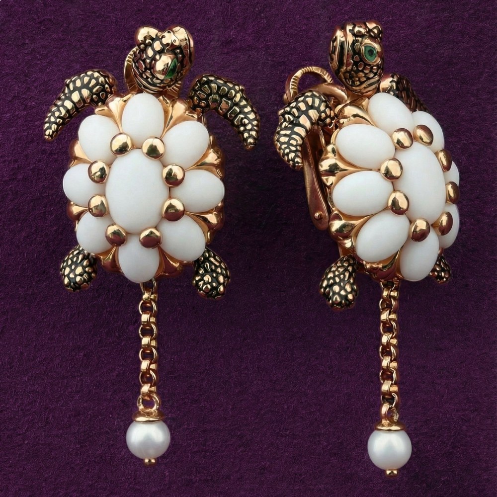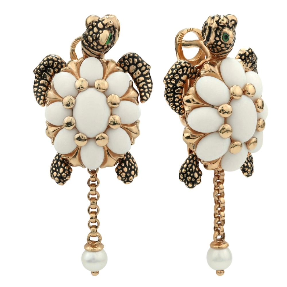 Серьги из золота c эмаль, жемчугом и бивнем мамонта