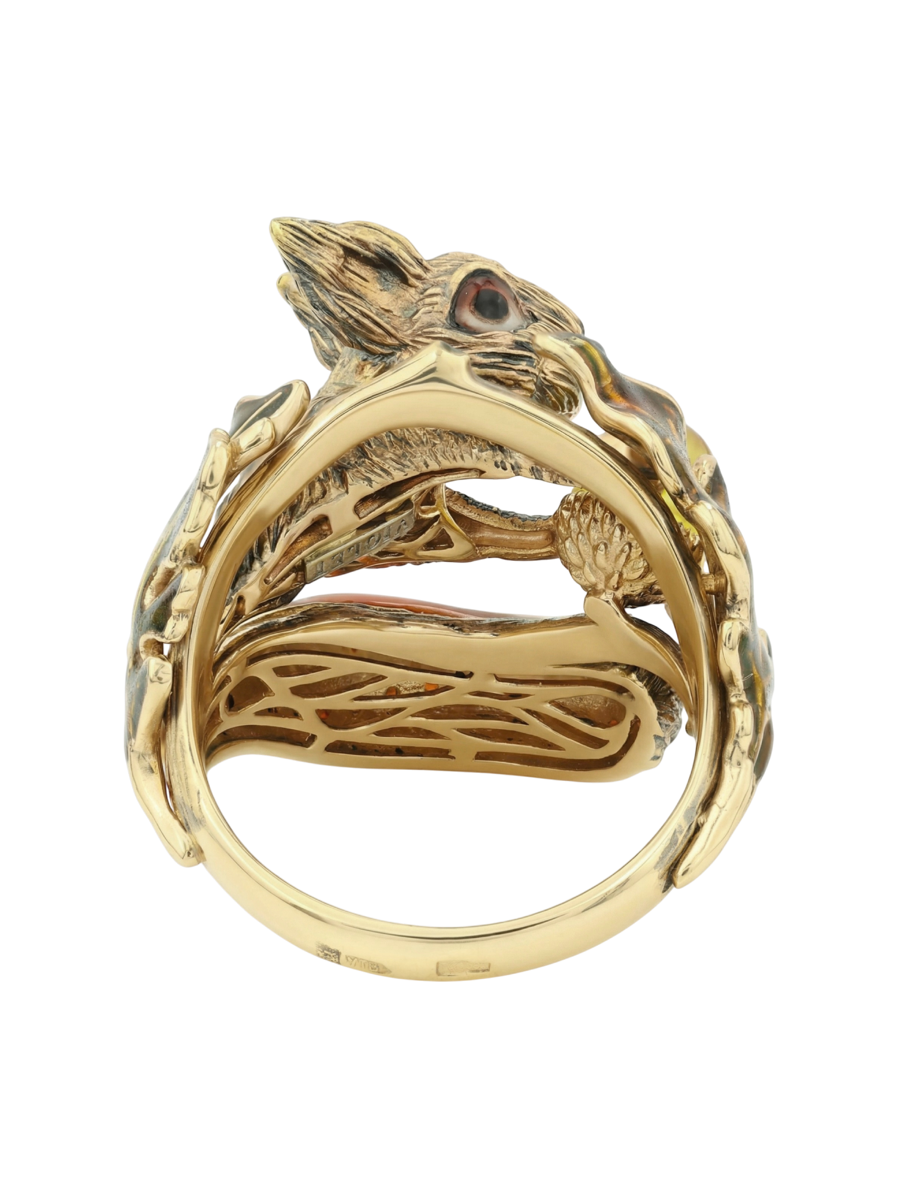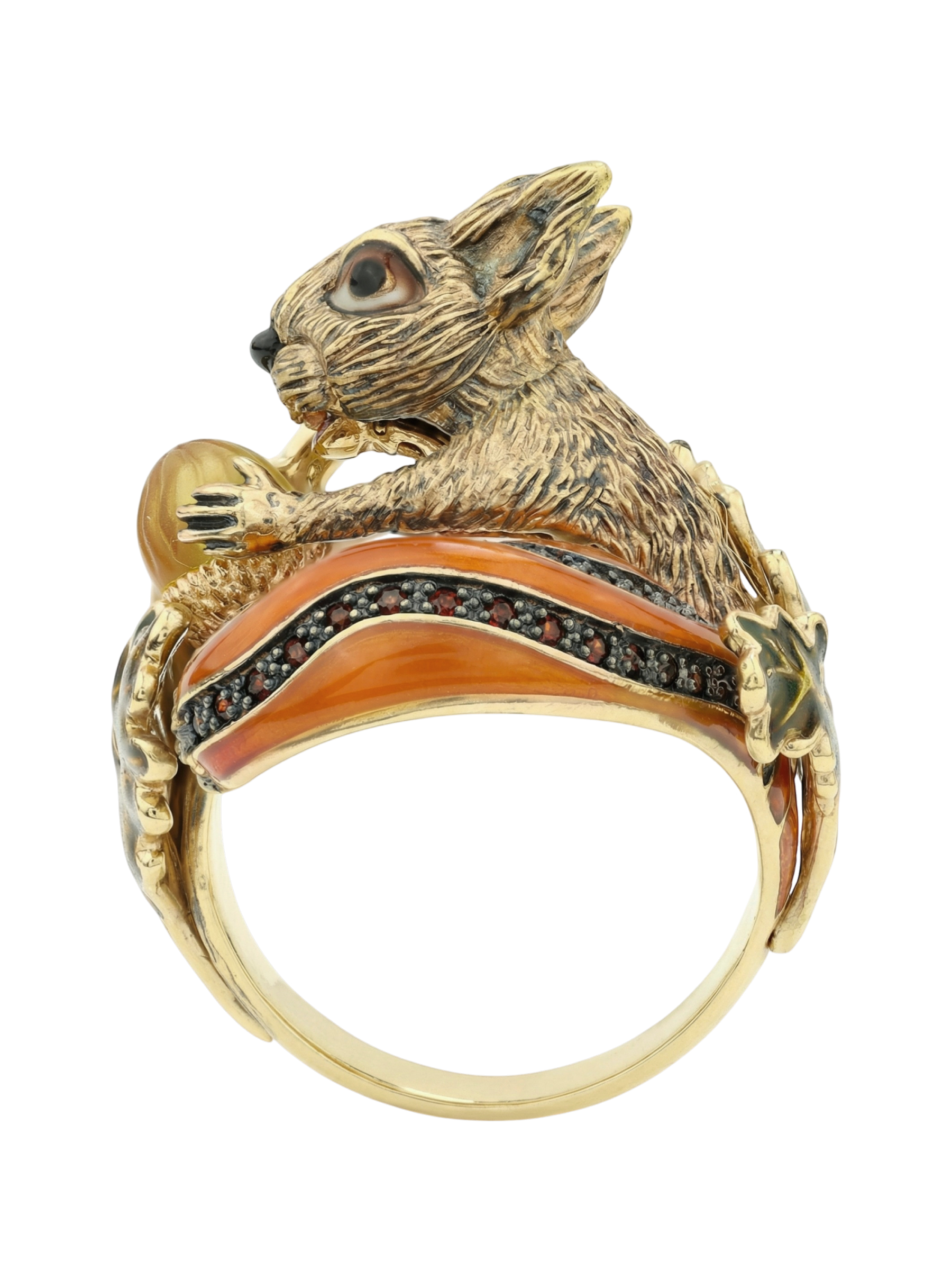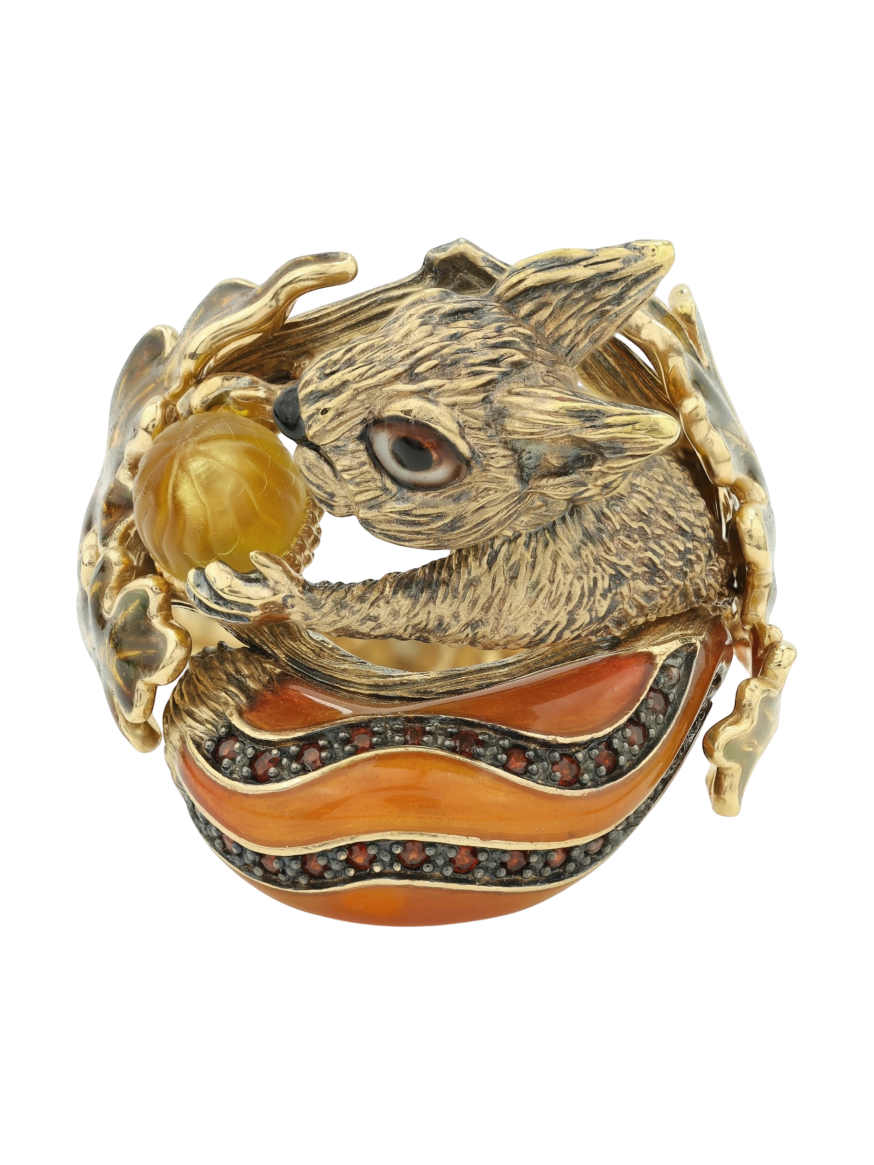 Кольцо из лимонного золота c эмаль, гранатом и янтарём