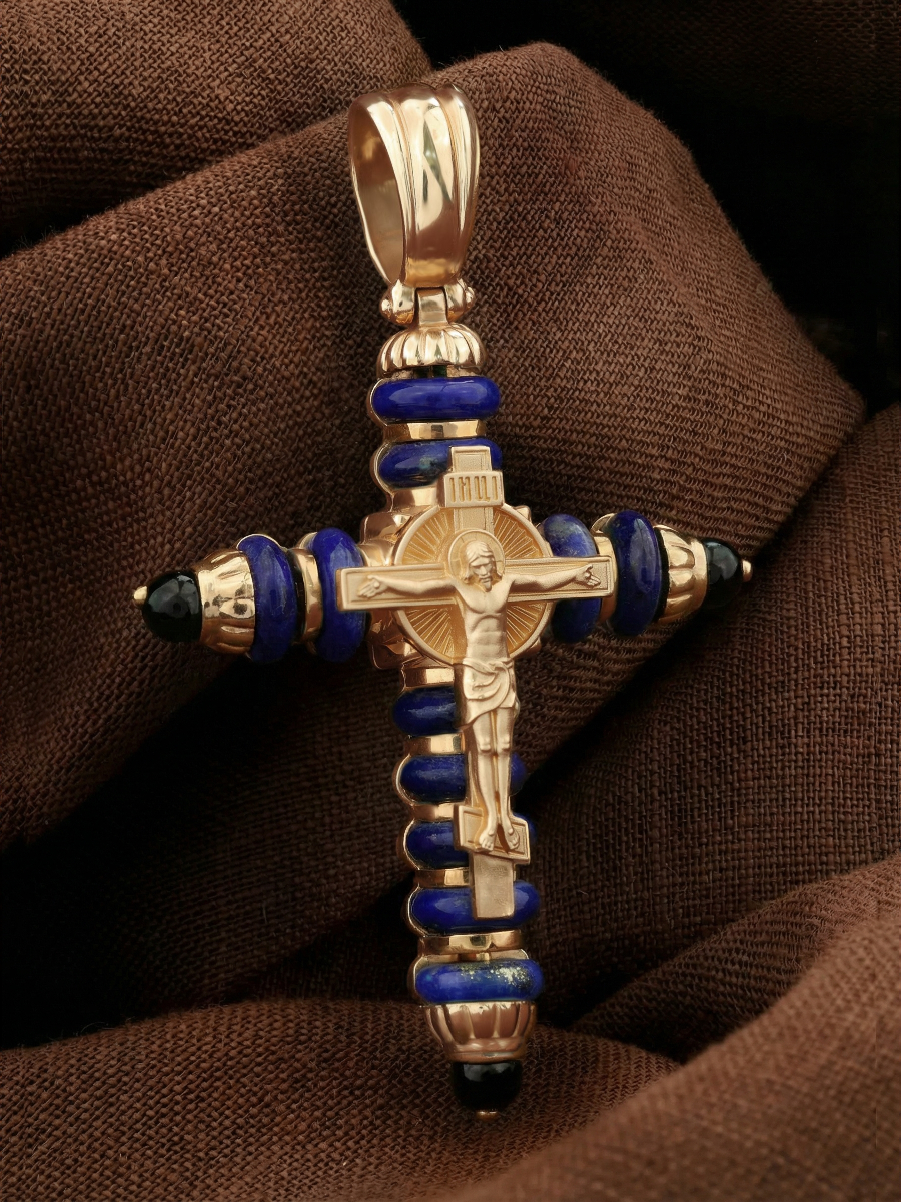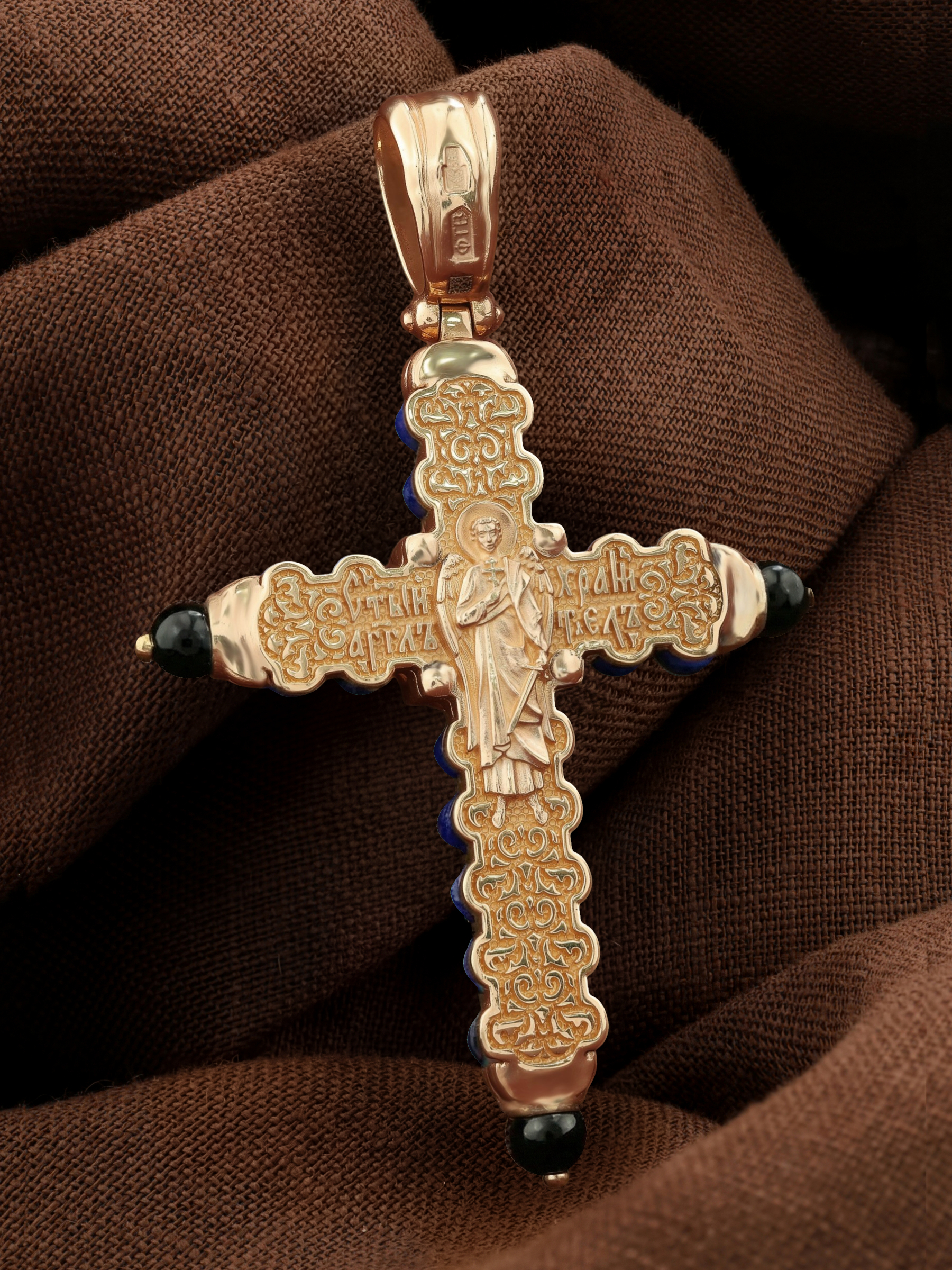 На лицевой стороне креста изображено Распятие Господа и Спасителя нашего Иисуса Христа, отдавшего Себя на смерть для искупления грехов мира. Крест является символом жертвенной любви Всеблагого Бога к падшим людям, всепобеждающим духовным оружием христиан, основанием и средоточием церковной жизни. Над вершиной Распятия помещена надпись «Царь Славы». На верхней перекладине расположена надпись «IНЦI». Она символизирует титло — табличку, на которой, согласно Евангелию, было начертано: Иисус Назорей, Царь Иудейский. Надпись «IC» «ХC»», означает Иисус Христос, помещаются на разных сторонах поперечной перекладины креста. Ниже помещена надпись «НИКА», что означает «победитель».
