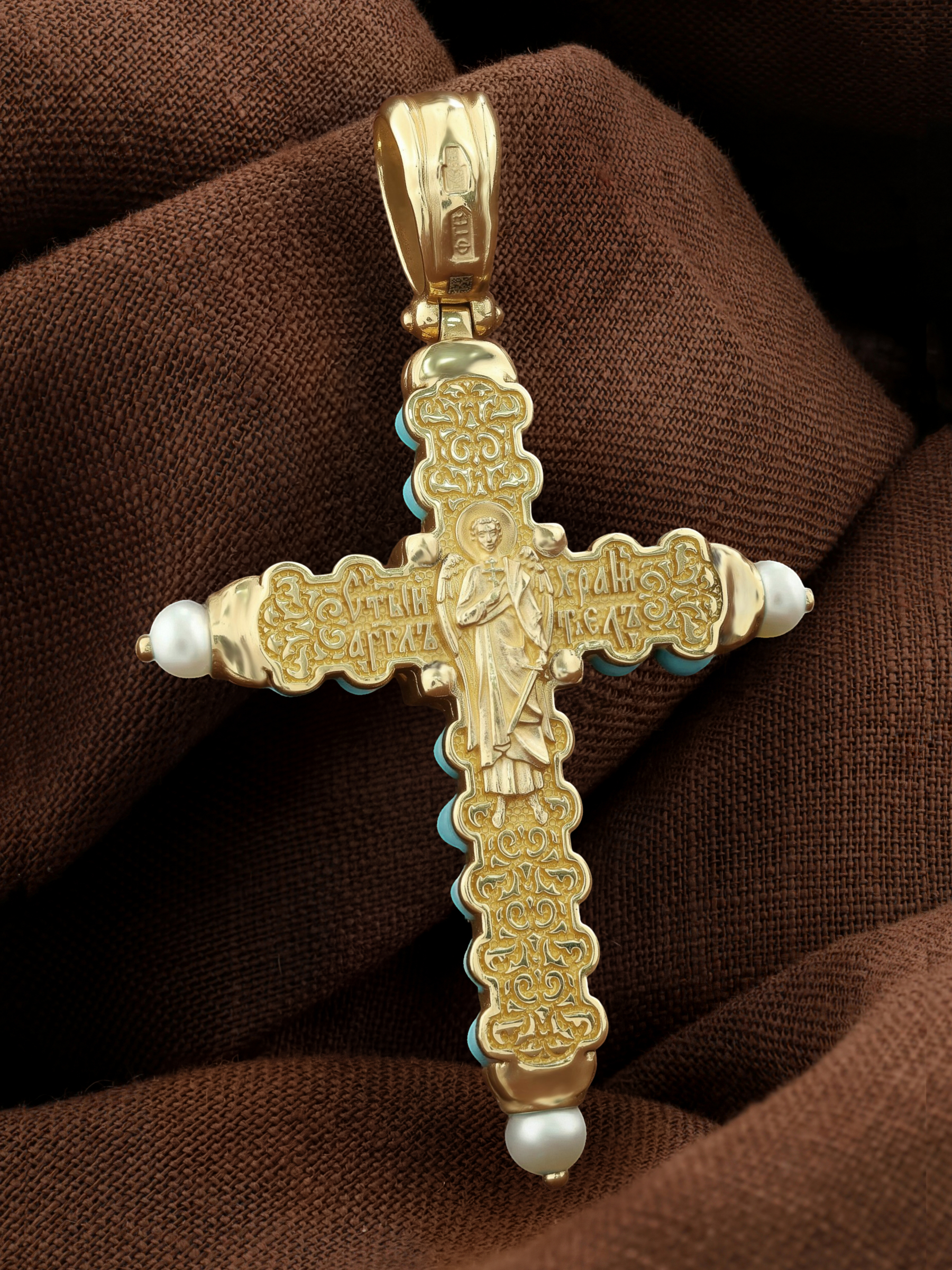 На лицевой стороне креста изображено Распятие Господа и Спасителя нашего Иисуса Христа, отдавшего Себя на смерть для искупления грехов мира. Крест является символом жертвенной любви Всеблагого Бога к падшим людям, всепобеждающим духовным оружием христиан, основанием и средоточием церковной жизни. Над вершиной Распятия помещена надпись «Царь Славы». На верхней перекладине расположена надпись «IНЦI». Она символизирует титло — табличку, на которой, согласно Евангелию, было начертано: Иисус Назорей, Царь Иудейский. Надпись «IC» «ХC»», означает Иисус Христос, помещаются на разных сторонах поперечной перекладины креста. Ниже помещена надпись «НИКА», что означает «победитель».
