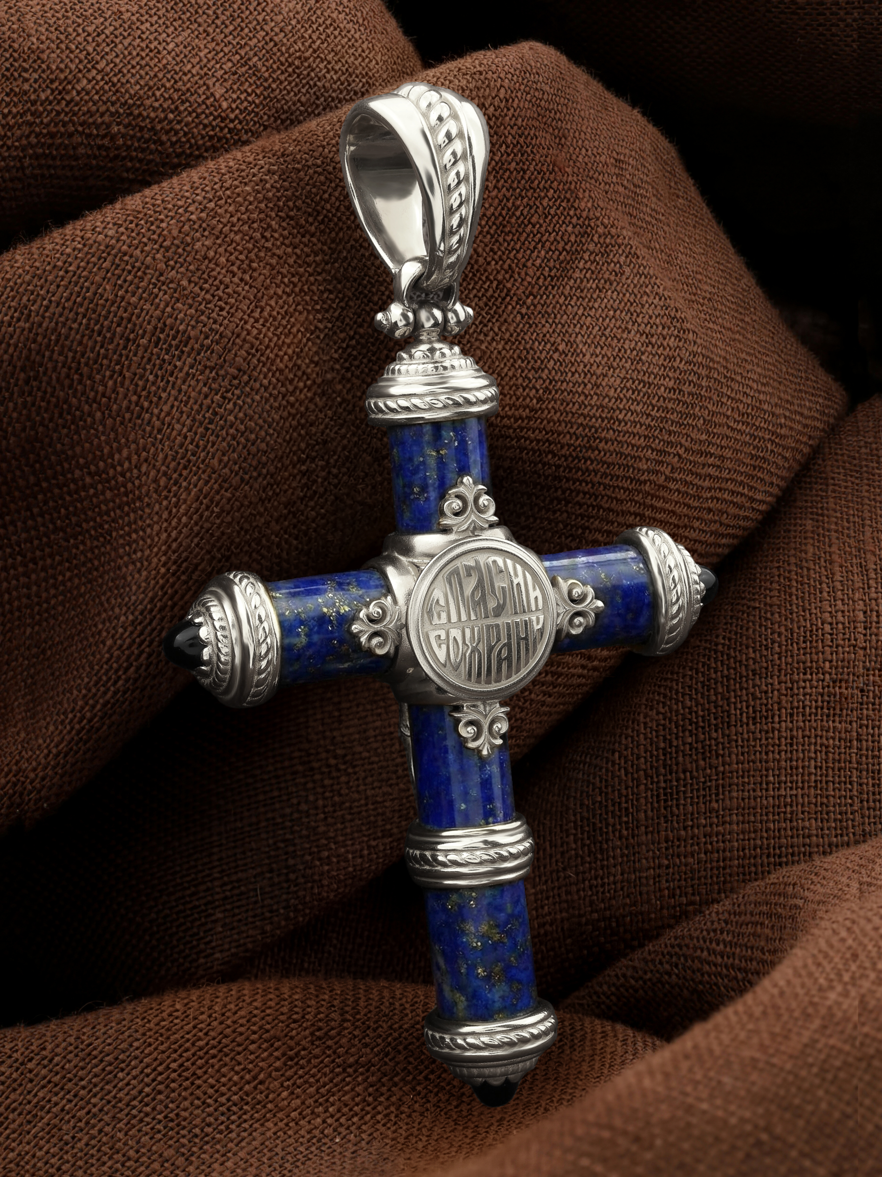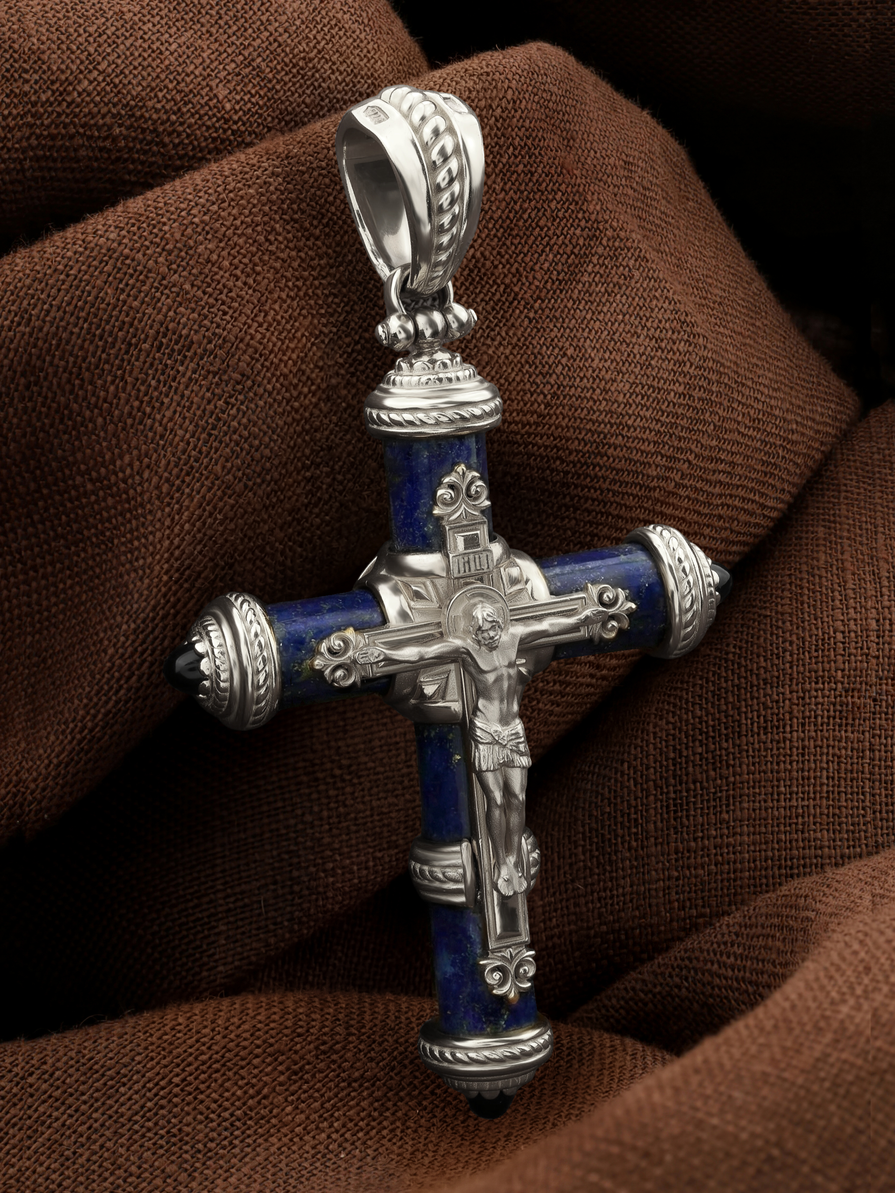 Крест из белого золота c ониксом и лазуритом