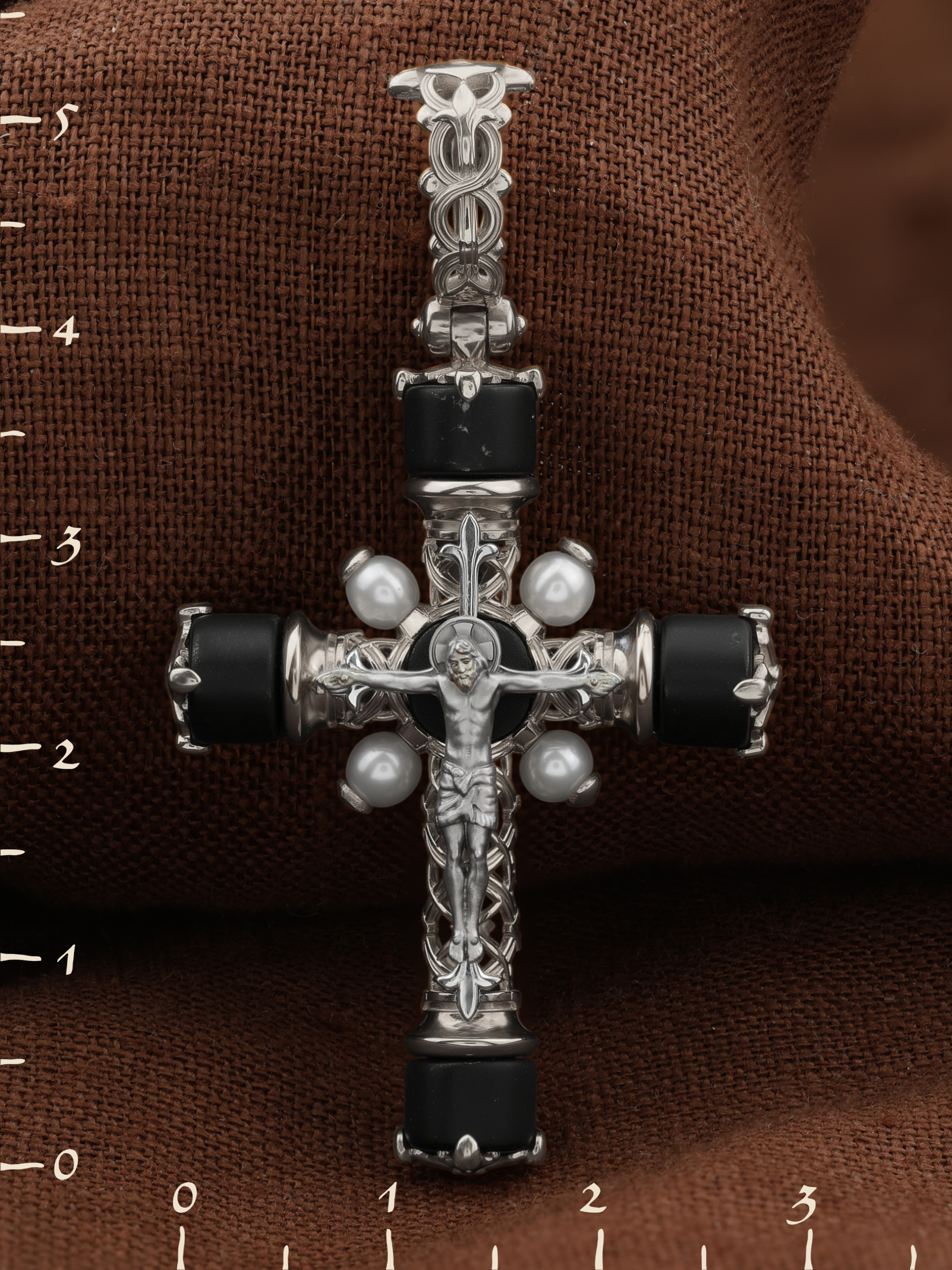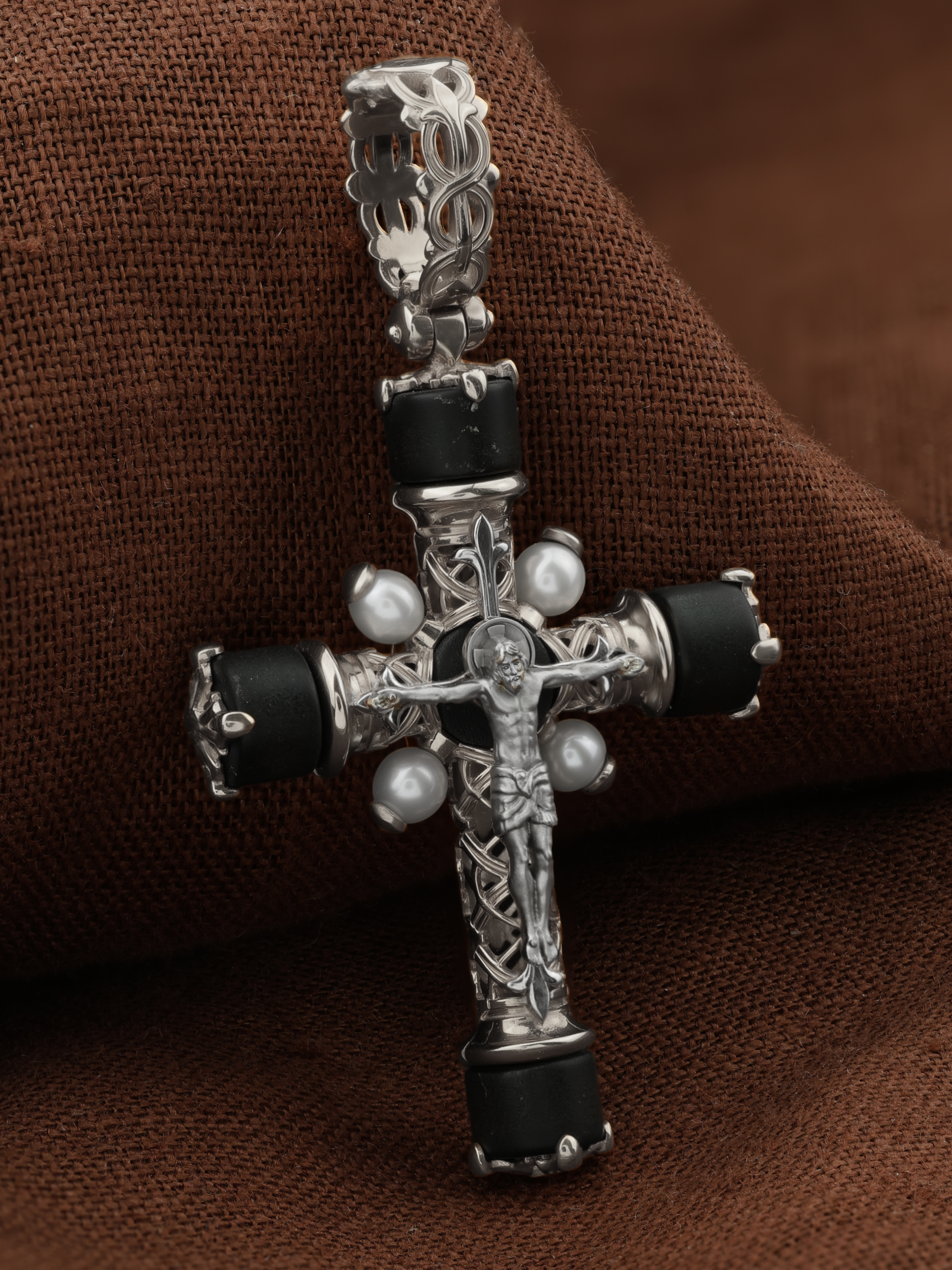 Крест из белого золота c жемчугом и ониксом