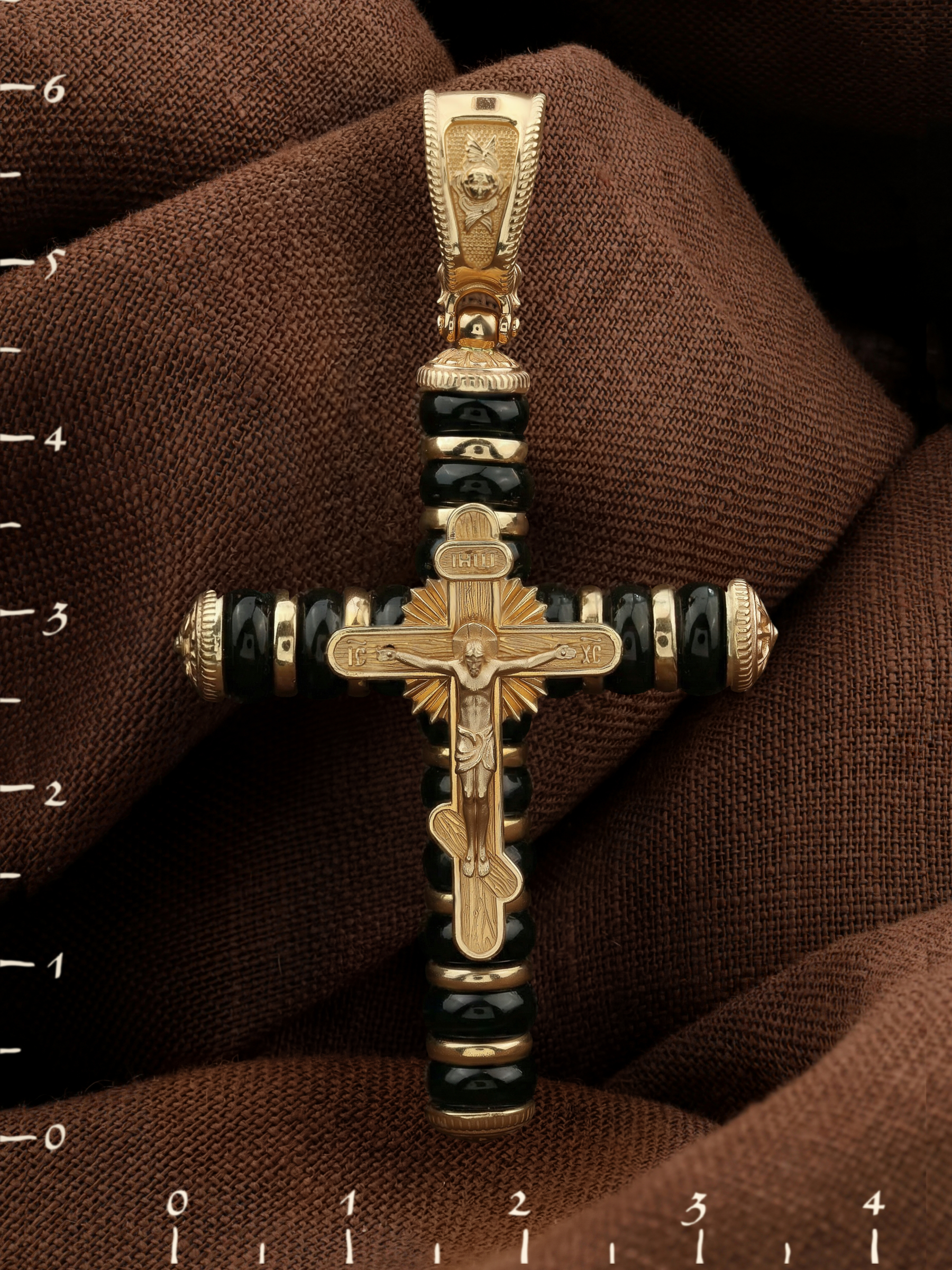 На лицевой стороне креста изображено Распятие Господа и Спасителя нашего Иисуса Христа. Своими крестными страданиями Господь смыл наши грехи, покрыл наш долг перед Богом или, на языке Писания, нас «искупил». В Голгофе сокрыта непостижимая тайна бесконечной правды и любви Бога. Крест стал символом победы добра над злом, жизни над смертью, напоминанием бесконечной Божьей любви, предметом радости. Воплотившийся Сын Божий Своею кровью освятил крест и сделал его проводником Своей благодати, источником освящения верующих. Господь сказал: кто хочет идти за Мною, отвергнись себя, и возьми крест свой, и следуй за Мною. (Мк. 8: 34). На верхней табличке, выше головы Иисуса, расположена надпись, составленная Понтием Пилатом — «IНЦI». Она означает «Иисус Назорей, Царь Иудейский». Надпись «IC» «ХC», означает Иисус Христос, помещается на разных сторонах поперечной перекладины креста. На православном кресте Христос не умирает, а свободно простирает руки, ладони Иисуса открыты, будто он хочет обнять все человечество, даря им свою любовь и открывая путь к вечной жизни. На кулонном кольце изображен шестикрылый Ангел Серафим.