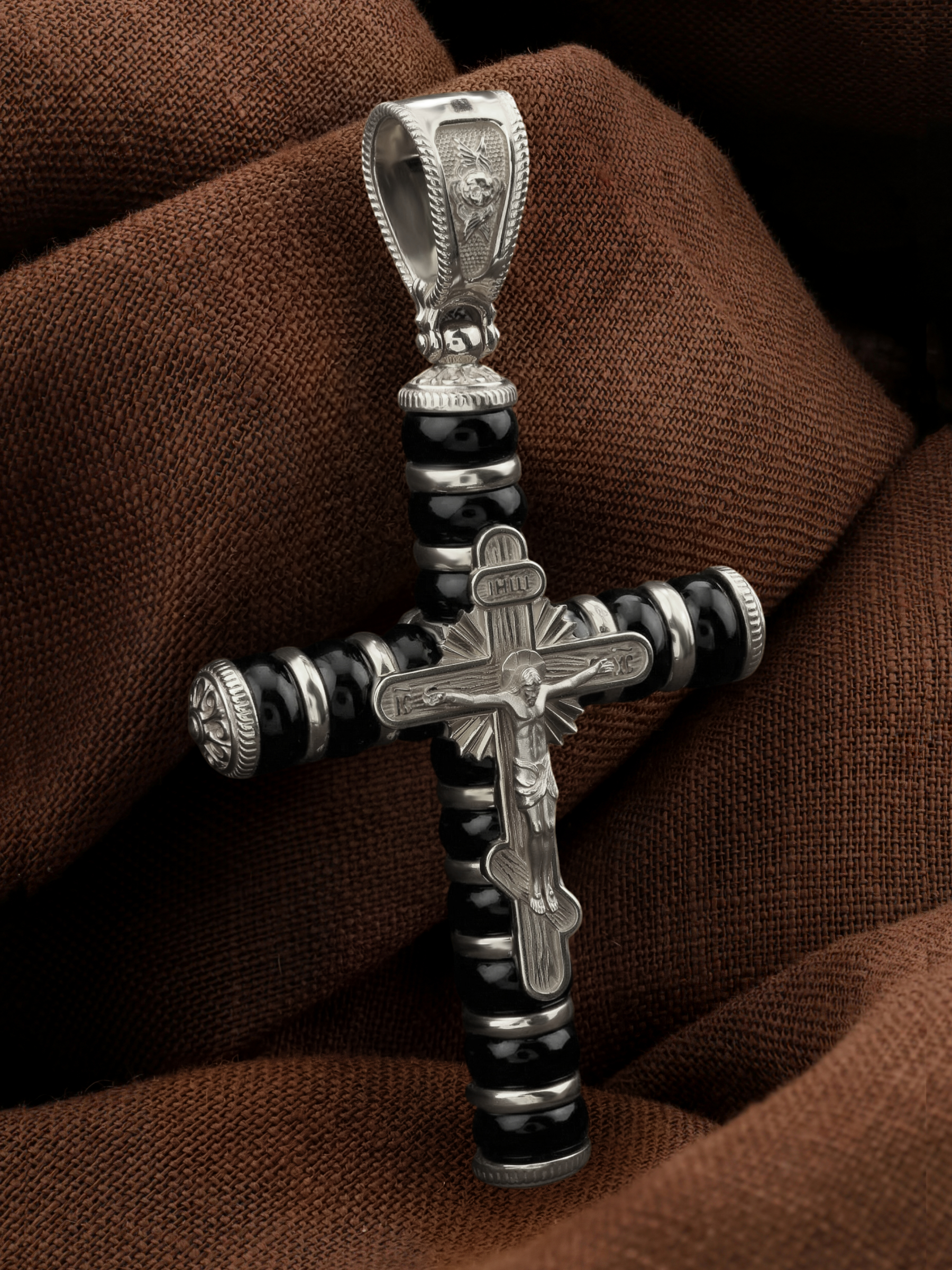 На лицевой стороне креста изображено Распятие Господа и Спасителя нашего Иисуса Христа. Своими крестными страданиями Господь смыл наши грехи, покрыл наш долг перед Богом или, на языке Писания, нас «искупил». В Голгофе сокрыта непостижимая тайна бесконечной правды и любви Бога. Крест стал символом победы добра над злом, жизни над смертью, напоминанием бесконечной Божьей любви, предметом радости. Воплотившийся Сын Божий Своею кровью освятил крест и сделал его проводником Своей благодати, источником освящения верующих. Господь сказал: кто хочет идти за Мною, отвергнись себя, и возьми крест свой, и следуй за Мною. (Мк. 8: 34). На верхней табличке, выше головы Иисуса, расположена надпись, составленная Понтием Пилатом — «IНЦI». Она означает «Иисус Назорей, Царь Иудейский». Надпись «IC» «ХC», означает Иисус Христос, помещается на разных сторонах поперечной перекладины креста. На православном кресте Христос не умирает, а свободно простирает руки, ладони Иисуса открыты, будто он хочет обнять все человечество, даря им свою любовь и открывая путь к вечной жизни. На кулонном кольце изображен шестикрылый Ангел Серафим.