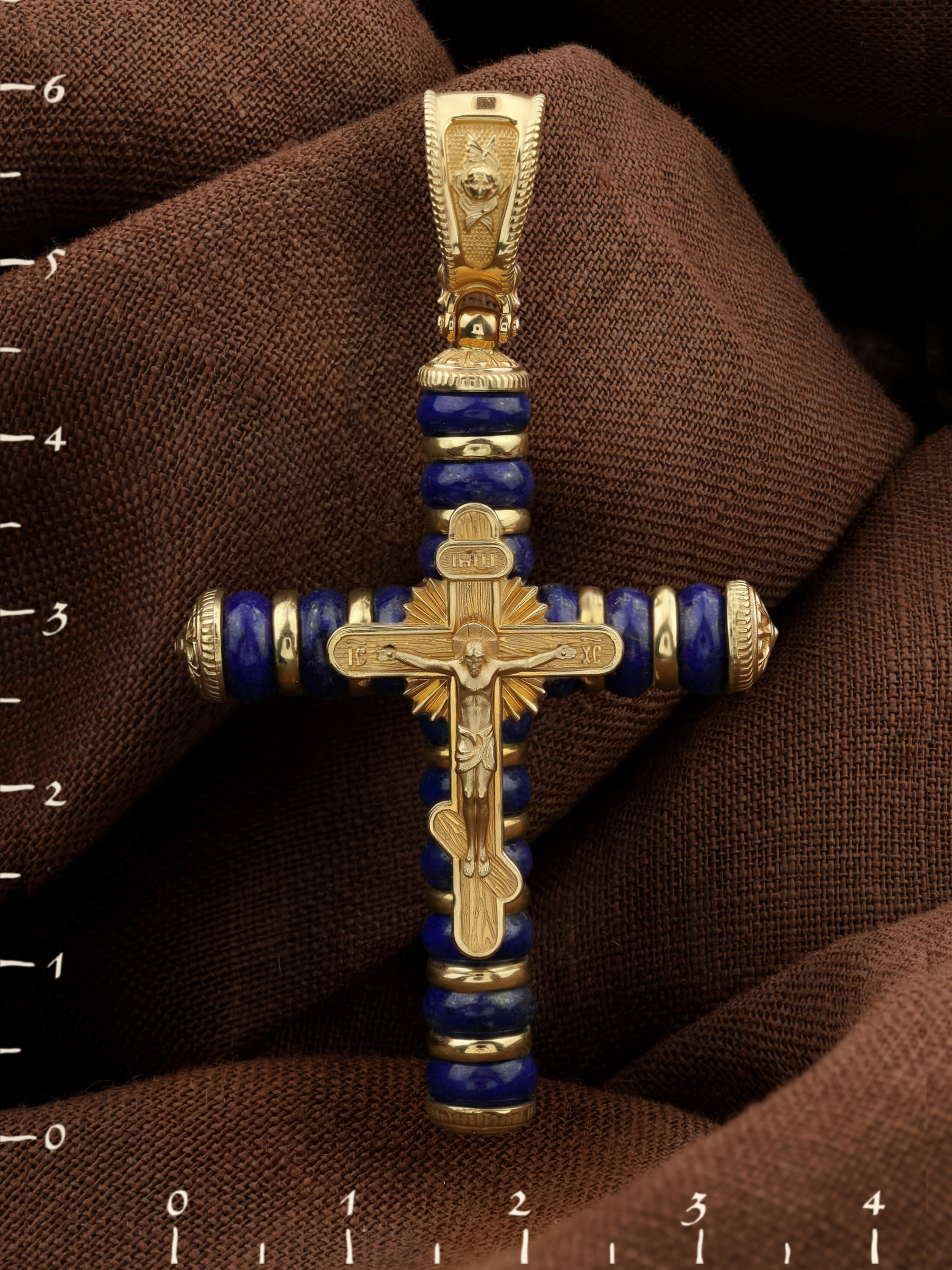 На лицевой стороне креста изображено Распятие Господа и Спасителя нашего Иисуса Христа. Своими крестными страданиями Господь смыл наши грехи, покрыл наш долг перед Богом или, на языке Писания, нас «искупил». В Голгофе сокрыта непостижимая тайна бесконечной правды и любви Бога. Крест стал символом победы добра над злом, жизни над смертью, напоминанием бесконечной Божьей любви, предметом радости. Воплотившийся Сын Божий Своею кровью освятил крест и сделал его проводником Своей благодати, источником освящения верующих. Господь сказал: кто хочет идти за Мною, отвергнись себя, и возьми крест свой, и следуй за Мною. (Мк. 8: 34). На верхней табличке, выше головы Иисуса, расположена надпись, составленная Понтием Пилатом — «IНЦI». Она означает «Иисус Назорей, Царь Иудейский». Надпись «IC» «ХC», означает Иисус Христос, помещается на разных сторонах поперечной перекладины креста. На православном кресте Христос не умирает, а свободно простирает руки, ладони Иисуса открыты, будто он хочет обнять все человечество, даря им свою любовь и открывая путь к вечной жизни. На кулонном кольце изображен шестикрылый Ангел Серафим.