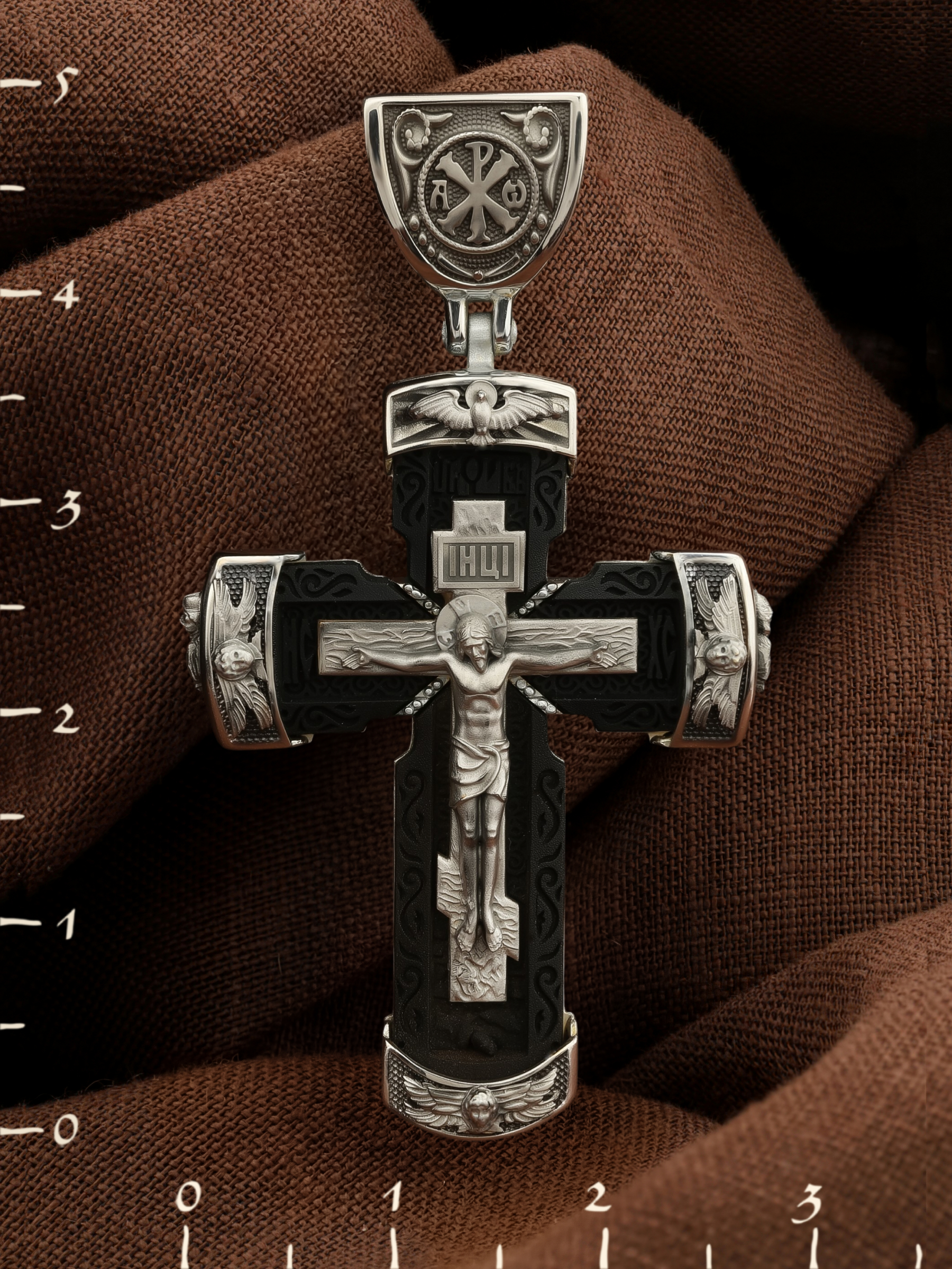 На лицевой стороне креста изображено Распятие, потому что это орудие казни Иисус Христос сделал орудием победы над грехом и смертью. Своими страданиями Он искупил грехи человечества, умерев и сошествовав во ад, победил сатану, освободил души праведников от вечной смерти и открыл им небесные врата рая. Жертва Христа сделала возможным спасение для каждого человека. На православном кресте Христос не умирает, а свободно простирает руки, ладони Иисуса открыты, будто он хочет обнять все человечество, даря им свою любовь и открывая путь к вечной жизни.