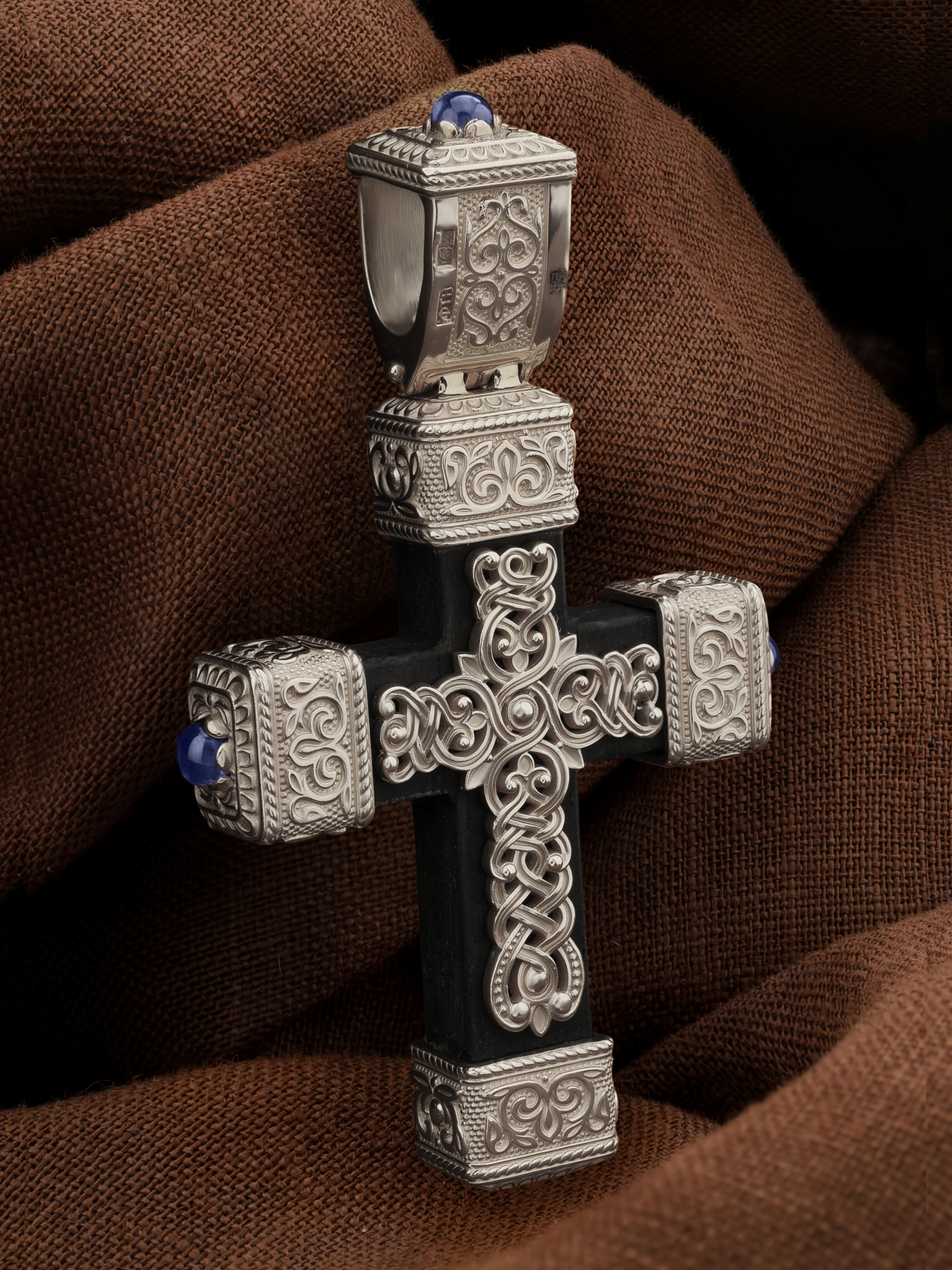 Крест из белого золота c эмаль, сапфиром и эбеновым деревом