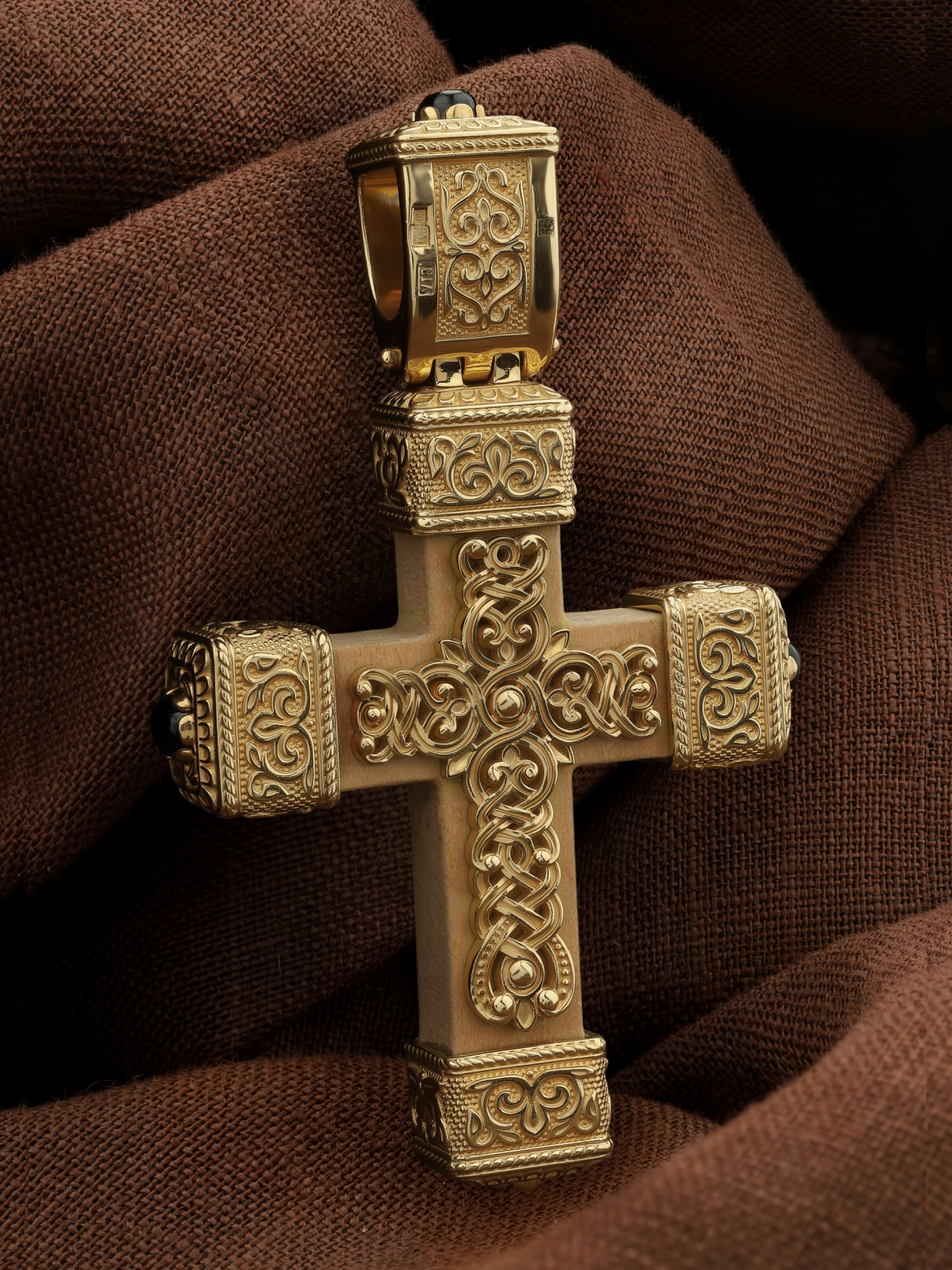 Крест из лимонного золота c эмаль, ониксом и деревом груши