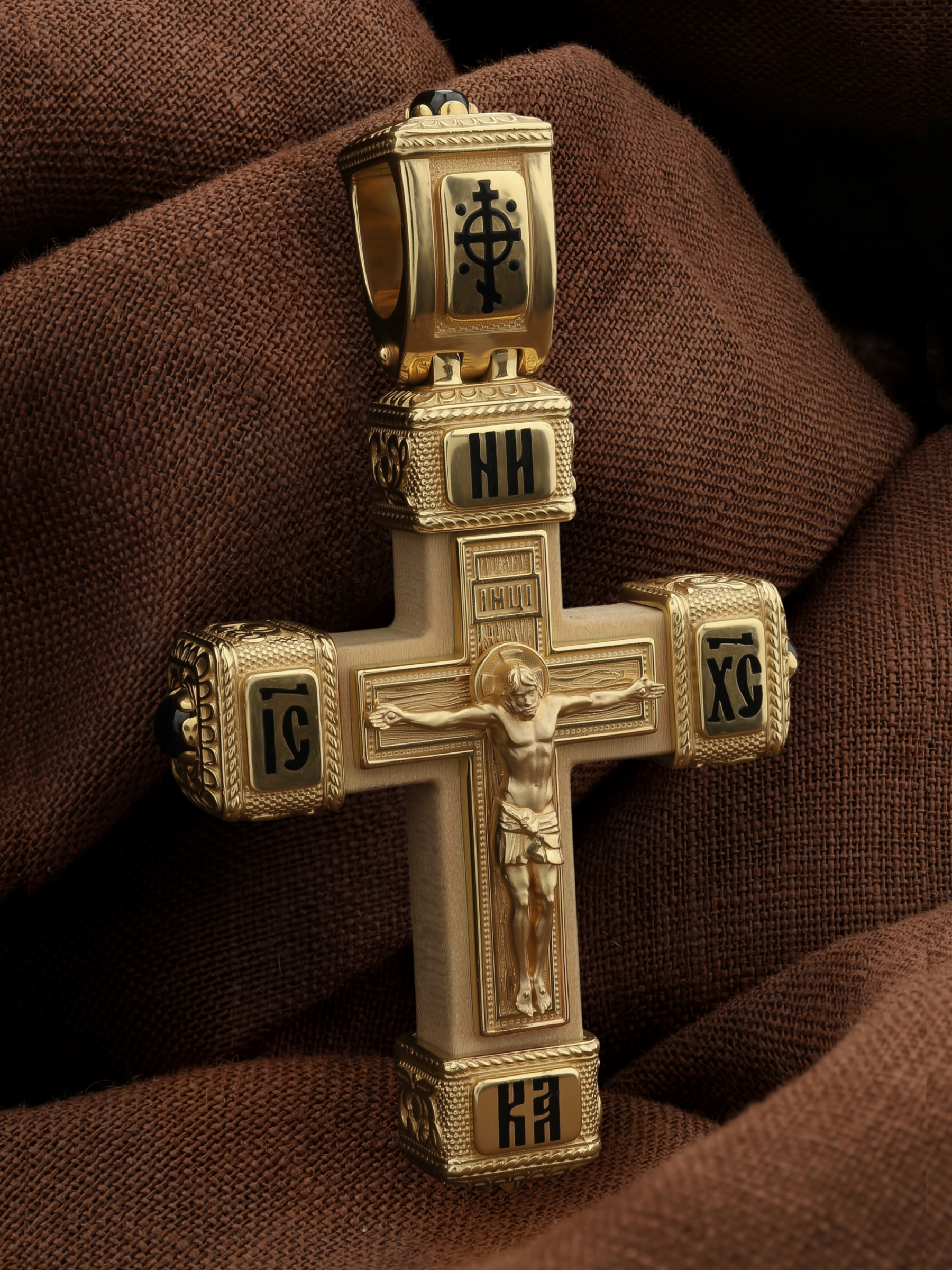 На лицевой стороне креста изображено Распятие Господа и Спасителя нашего Иисуса Христа. Крест- символ спасения и искупления рода человеческого, знамение победы над смертью и адом. Иисус Христос, как искупительная жертва освобождения человечества от власти греха, умер крестной смертью и в третий день воскрес. На верхней табличке, выше головы Иисуса, расположена надпись, составленная Понтием Пилатом — «ИНЦИ». Она означает «Иисус Назорей, Царь Иудейский». Надпись «IС ХС» означает Иисус Христос помещается на разных сторонах поперечной перекладины креста. Надпись –«НИКА» означает победитель. На кулонном кольце помещен крест «терновый венец». Этот крест имеет форму восьмиконечного креста, вторая перекладина которого в центре обведена кругом с остриями по краю, символизирующими терновый венец. «Воины, сплетши венец из терна, возложили ему на голову, — говорится в Евангелии, — и ранами Его мы исцелились» (Ис. 53, 5). Вот почему терновый венок стал для христиан символом победы и награды, «венцом правды» (2 Тим. 4, 8), «венцом славы» (1 Пет. 5, 4), «венцом жизни» (Иак. 1, 12;.Апок. 2, 10).