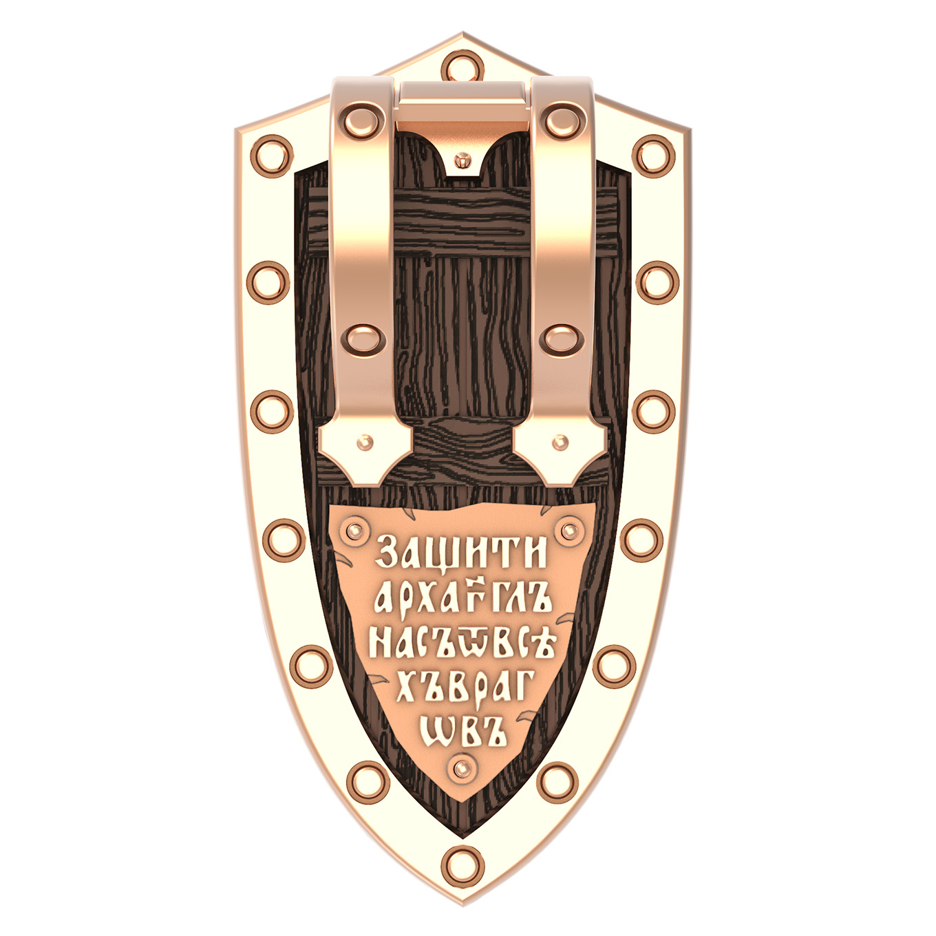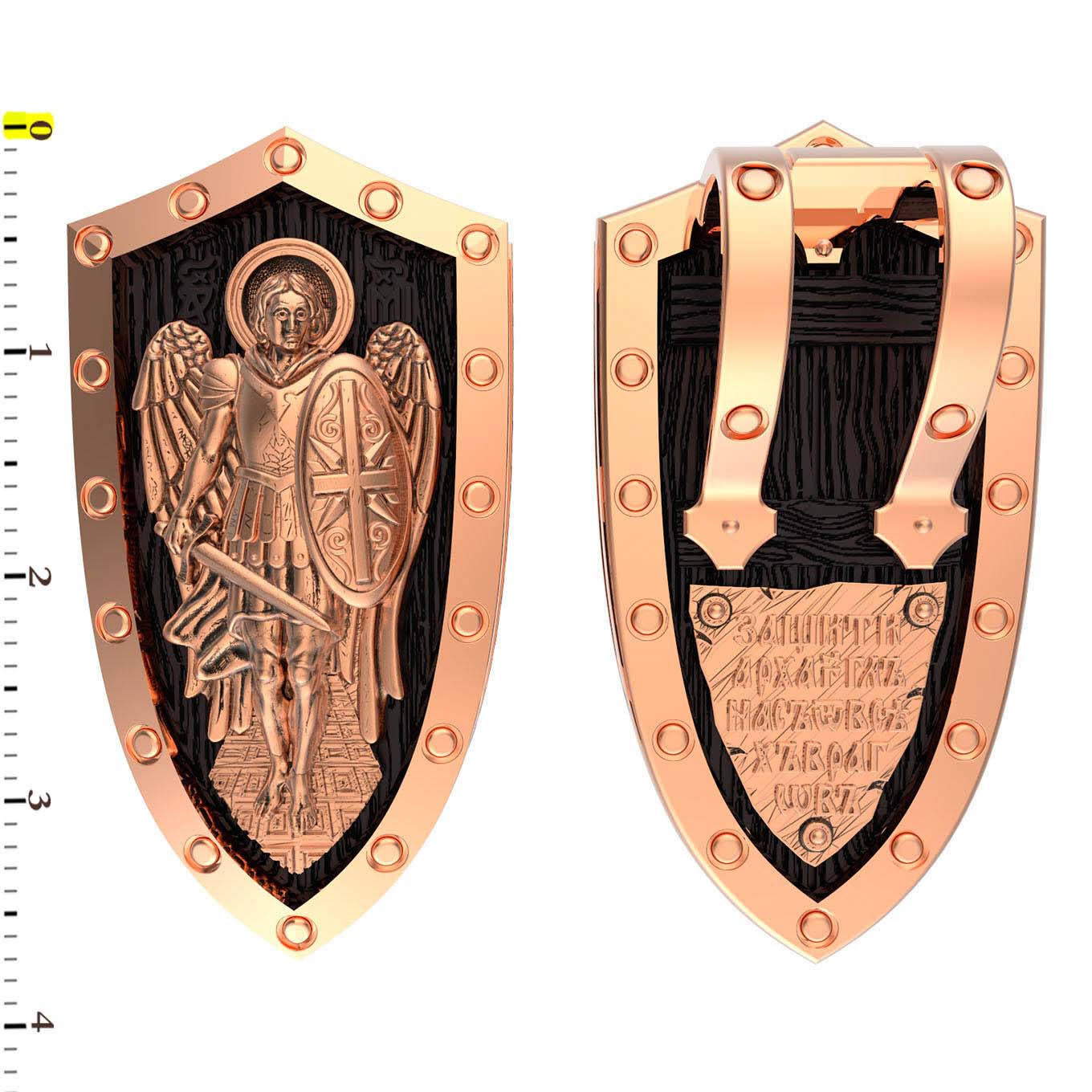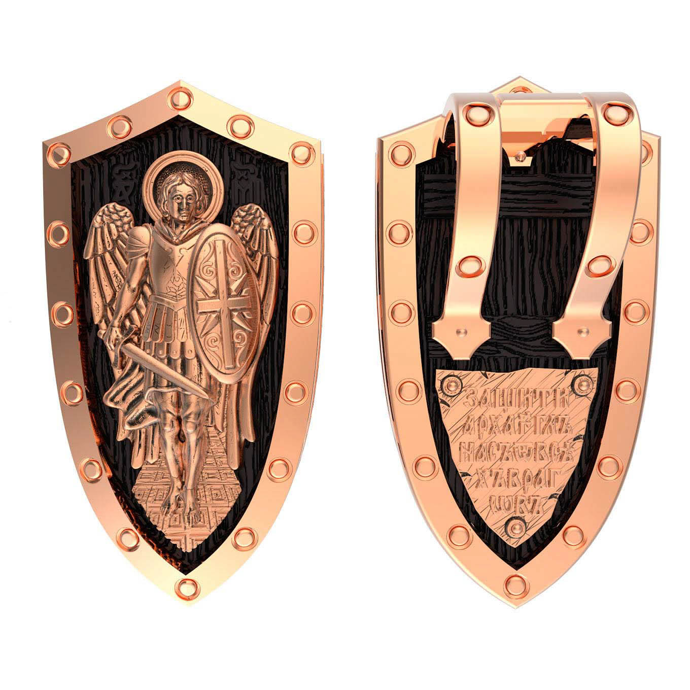 На лицевой стороне образка изображение Архангела Михаила — верного служителя Божия, который низринул с Неба возгордившегося денницу с другими павшими духами. В Православии его называют Архистратигом, что означает глава святого воинства Ангелов и Архангелов. Образок сделан в виде воинского щита. Архангел Михаил изображен в воинственном виде с огненным мечом в правой руке и щитом в левой. Архангел почитается как покровитель воинов и всех верных Богу и ведущих борьбу против сил зла, борец против ересей, а также защитник душ умерших, страж райских врат. С древних времен прославлен своими чудесами Архангел Михаил на Руси. Примеров явления и помощи Архистратига Михаила в русской истории бессчетно. Архангел Михаил не перестает ратоборствовать за славу Творца и Господа всяческих, за дело спасения рода человеческого, за церковь и чад ее. И, согласно, Откровению Иоанна Богослова во время последней битвы небесных и дьявольских сил Михаил и его ангелы опять низвергнут Люцифера вместе с его войском: «Михаил и Ангелы его воевали против дракона, и дракон и ангелы его воевали [против них], но не устояли, и не нашлось уже для них места на небе. И низвержен был великий дракон, древний змий, называемый диаволом и сатаною, обольщающий всю вселенную, низвержен на землю, и ангелы его низвержены с ним» (Откр.12:7−9).