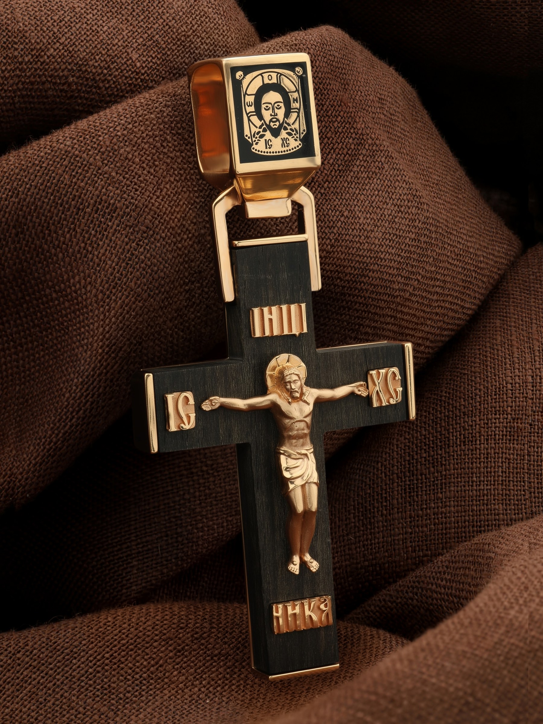 На лицевой стороне креста изображено Распятие Господа и Спасителя нашего Иисуса Христа. В Голгофе сокрыта непостижимая тайна бесконечной правды и любви Бога. Крест стал символом победы добра над злом, жизни над смертью, напоминанием бесконечной Божьей любви, предметом радости. Воплотившийся Сын Божий Своею кровью освятил крест и сделал его проводником Своей благодати, источником освящения верующих. На верхней табличке, выше головы Иисуса, расположена надпись, составленная Понтием Пилатом — «IНЦI». Она означает «Иисус Назорей, Царь Иудейский». Надпись «IС ХС» означает Иисус Христос размещается на разных сторонах поперечной перекладины креста. В нижней части креста находится надпись «НИКА», что в переводе с греческого означает «победитель». На православном кресте Христос не умирает, а свободно простирает руки, ладони Иисуса открыты, будто он хочет обнять все человечество, даря им свою любовь и открывая путь к вечной жизни. На кулонном кольце размещено изображение Спаса Нерукотворного — образ Спасителя, который Он запечатлел на плате и передал для исцеления больному проказой царю Эдессы. Ему придается победное и защитное значение.