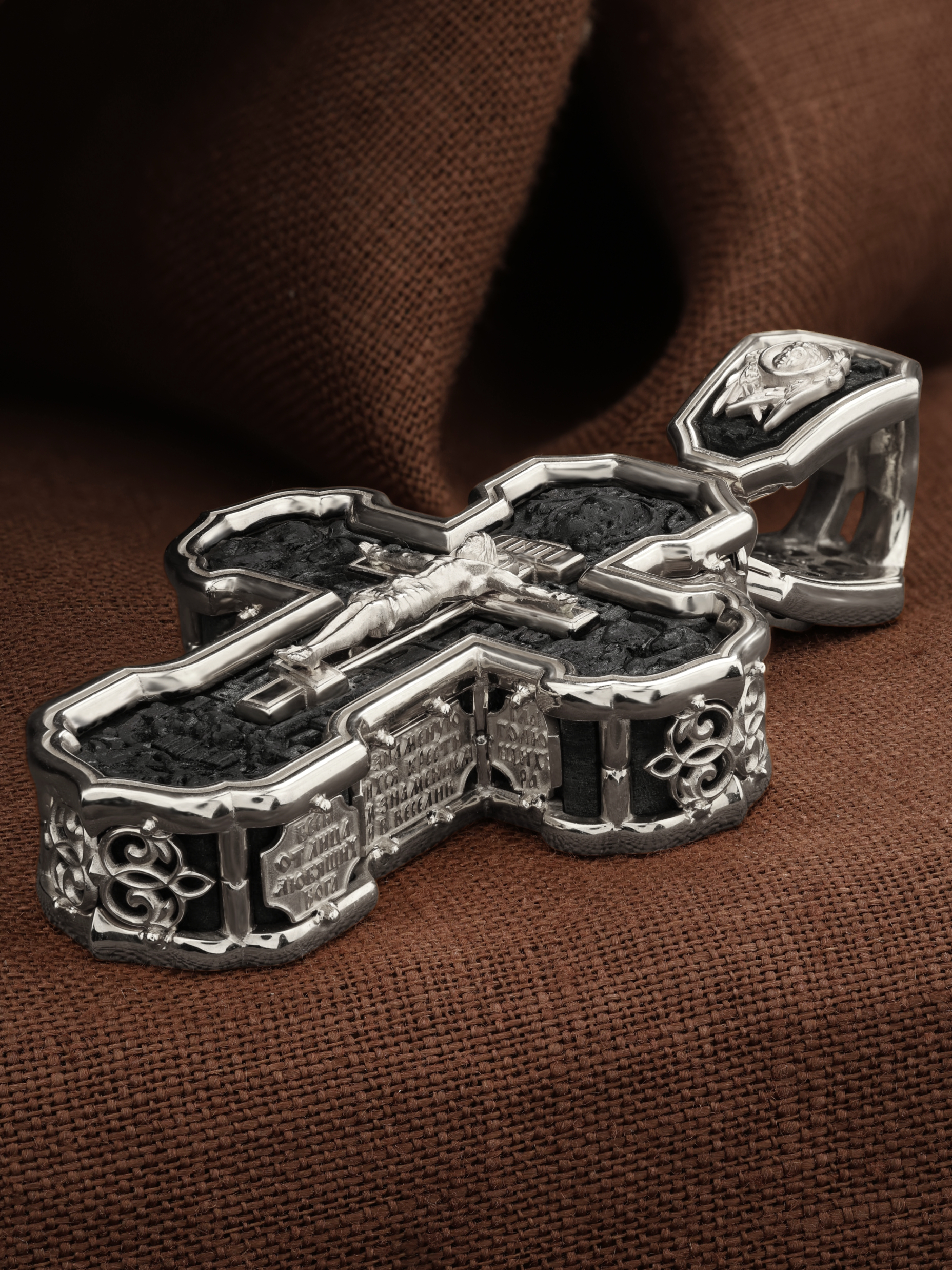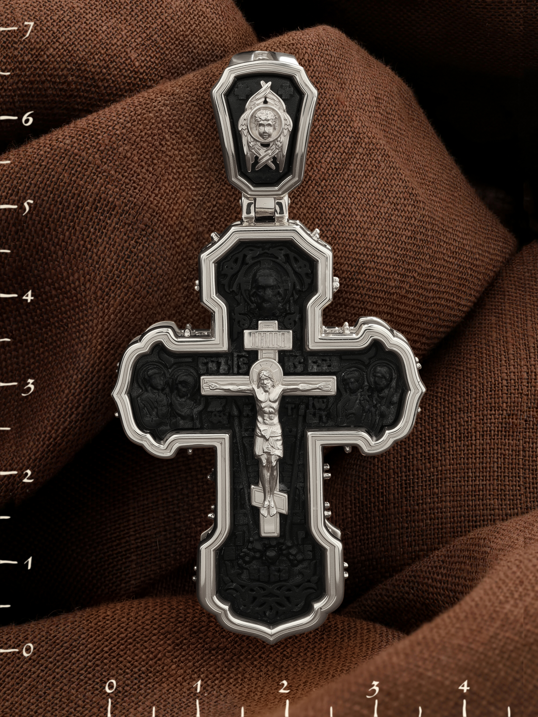 На лицевой стороне креста изображено Распятие Господа и Спасителя нашего Иисуса Христа. Крест- символ спасения и искупления рода человеческого, знамение победы над смертью и адом. Иисус Христос, как искупительная жертва освобождения человечества от власти греха, умер крестной смертью и в третий день воскрес. На верхней табличке, выше головы Иисуса, расположена надпись, составленная Понтием Пилатом — «IНЦI». Она означает «Иисус Назорей, Царь Иудейский». Надпись «IС» « ХС» означает Иисус Христос и помещается на разных сторонах поперечной (большой) перекладины креста. Рядом расположена надпись «Сын Божий». Выше Распятия изображен Нерукотворный образ Господа и Спасителя нашего Иисуса Христа. Слева от Распятия — Пресвятая Богородица и святая мироносица Мария Магдалина с крестом в руке. Справа — апостол и евангелист Иоанн Богослов, один из ближайших учеников Иисуса Христа и сотник Лонгин с крестом в правой руке и копьем — в левой. За крестом высится Иерусалимская стена. Крест стоит на горе камней, символизирующих Голгофу. В ее основании различается череп — это голова Адама. Вдоль креста изображены копие сотника Лонгина и трость с губкой и буквы «К» и «Т». Надпись «МЛРБ» — «место лобное рай бысть» означает, что место лобное стало раем и помещаются в нижней части креста. Рядом — слово «НИКА», что означает «победитель». На православном кресте Христос не умирает, а свободно простирает руки, ладони Иисуса открыты, будто он хочет обнять все человечество, даря им свою любовь и открывая путь к вечной жизни. На кулонном кольце изображен шестикрылый Серафим.
