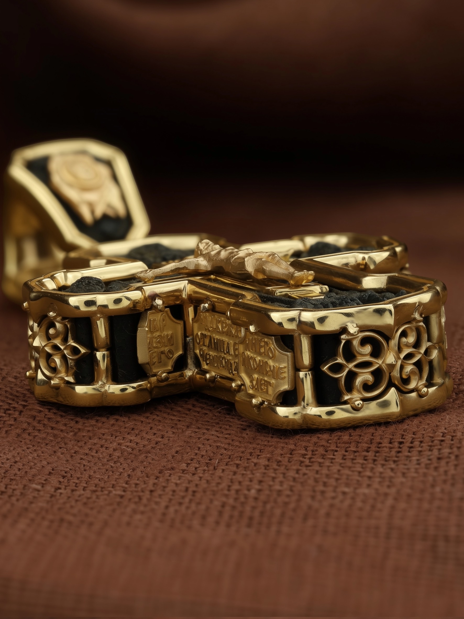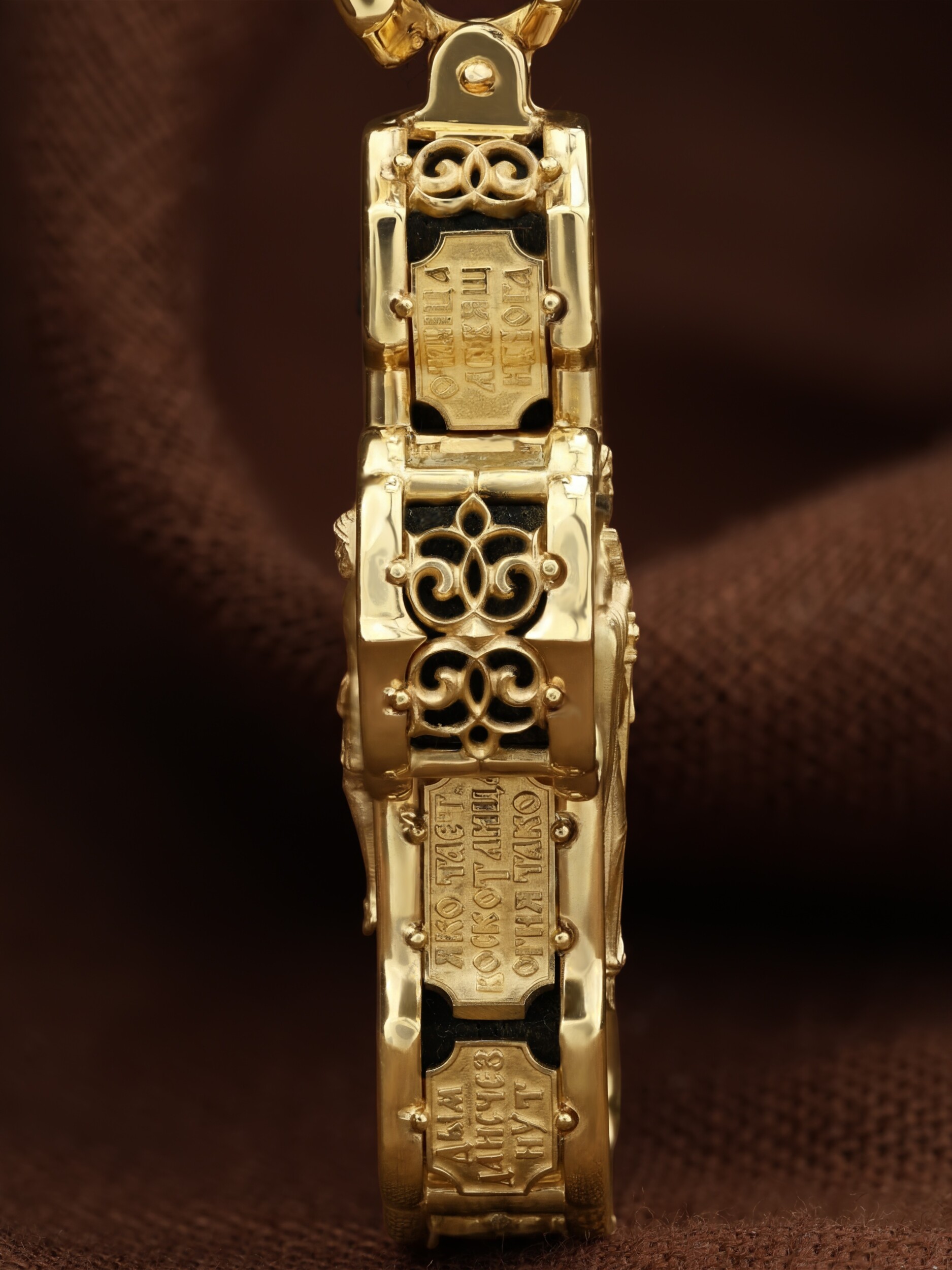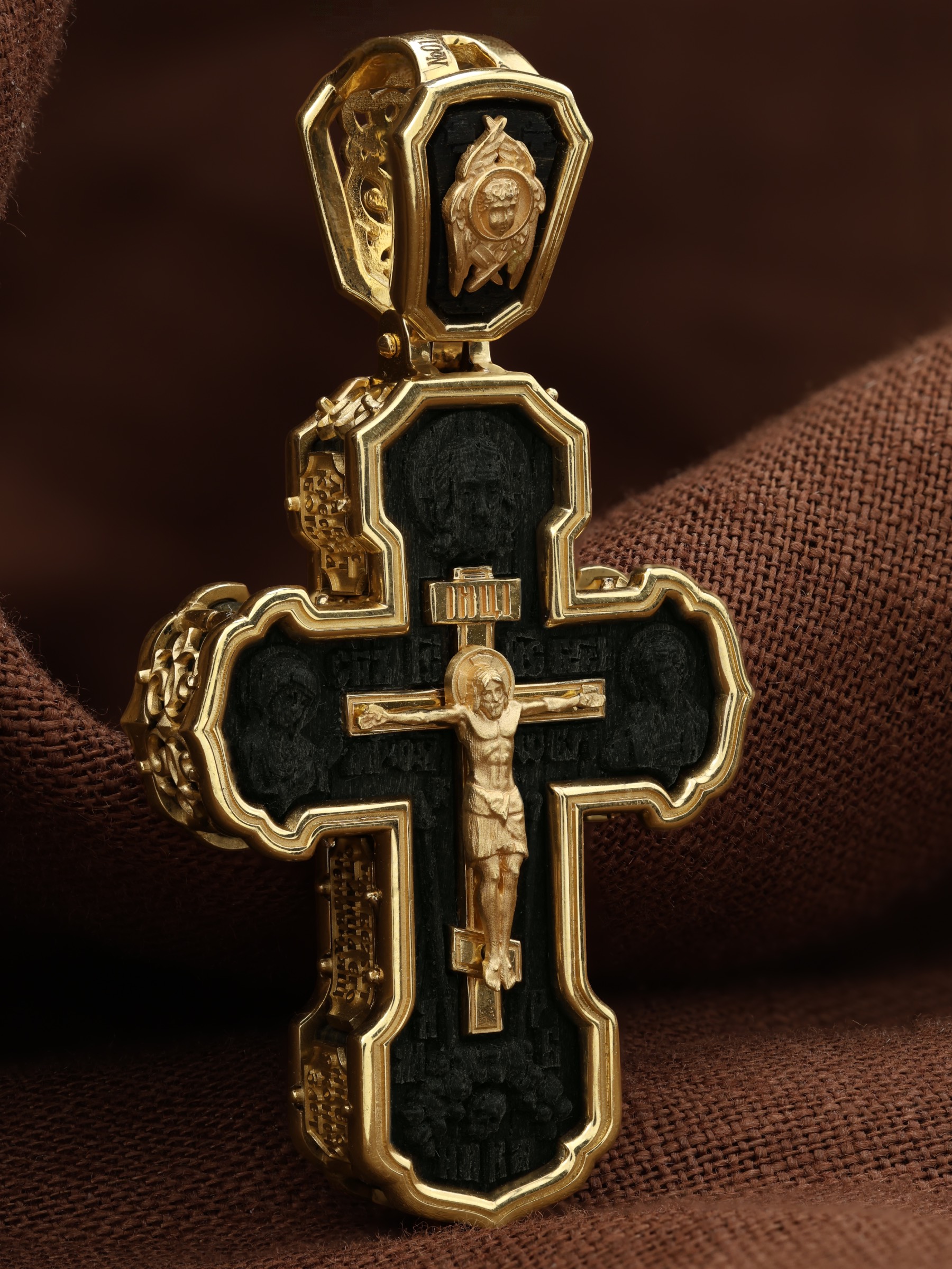 На лицевой стороне креста изображено Распятие Господа и Спасителя нашего Иисуса Христа. Крест- символ спасения и искупления рода человеческого, знамение победы над смертью и адом. Иисус Христос, как искупительная жертва освобождения человечества от власти греха, умер крестной смертью и в третий день воскрес. На верхней табличке, выше головы Иисуса, расположена надпись, составленная Понтием Пилатом — «IНЦI». Она означает «Иисус Назорей, Царь Иудейский». Надпись «IС» « ХС» означает Иисус Христос и помещается на разных сторонах поперечной (большой) перекладины креста. Рядом расположена надпись «Сын Божий». Выше Распятия изображен Нерукотворный образ Господа и Спасителя нашего Иисуса Христа. Слева от Распятия изображена Пресвятая Богородица, справа — апостол и евангелист Иоанн Богослов, один из ближайших учеников Иисуса Христа. Крест стоит на горе камней, символизирующих Голгофу. В ее основании различается череп — это голова Адама. Вдоль креста изображены копие сотника Лонгина и трость с губкой и буквы «К» и «Т». Надпись «МЛРБ» — «место лобное рай бысть» означает, что место лобное стало раем и помещаются в нижней части креста. Рядом — слово «НИКА», что означает «победитель». На православном кресте Христос не умирает, а свободно простирает руки, ладони Иисуса открыты, будто он хочет обнять все человечество, даря им свою любовь и открывая путь к вечной жизни. На кулонном кольце изображен шестикрылый Серафим.