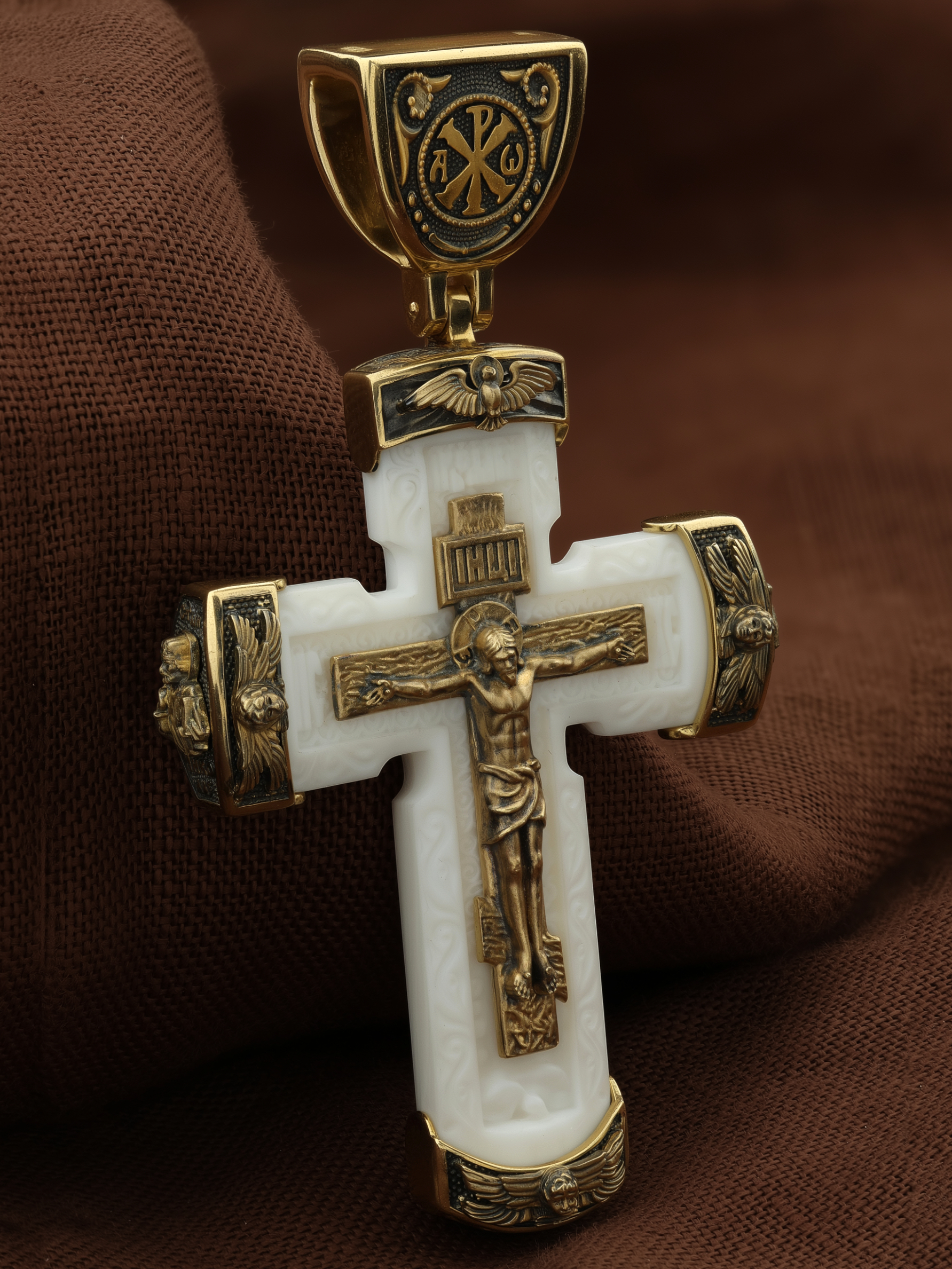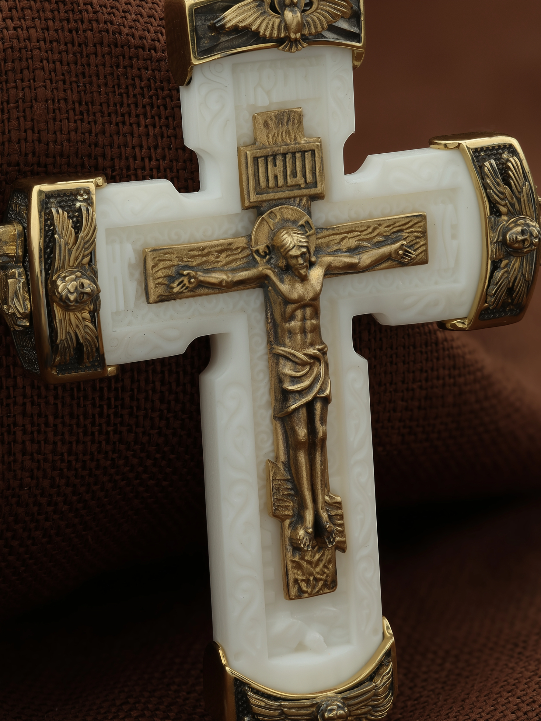Над Распятием изображен парящий голубь — символ Святого Духа и Его благодати.