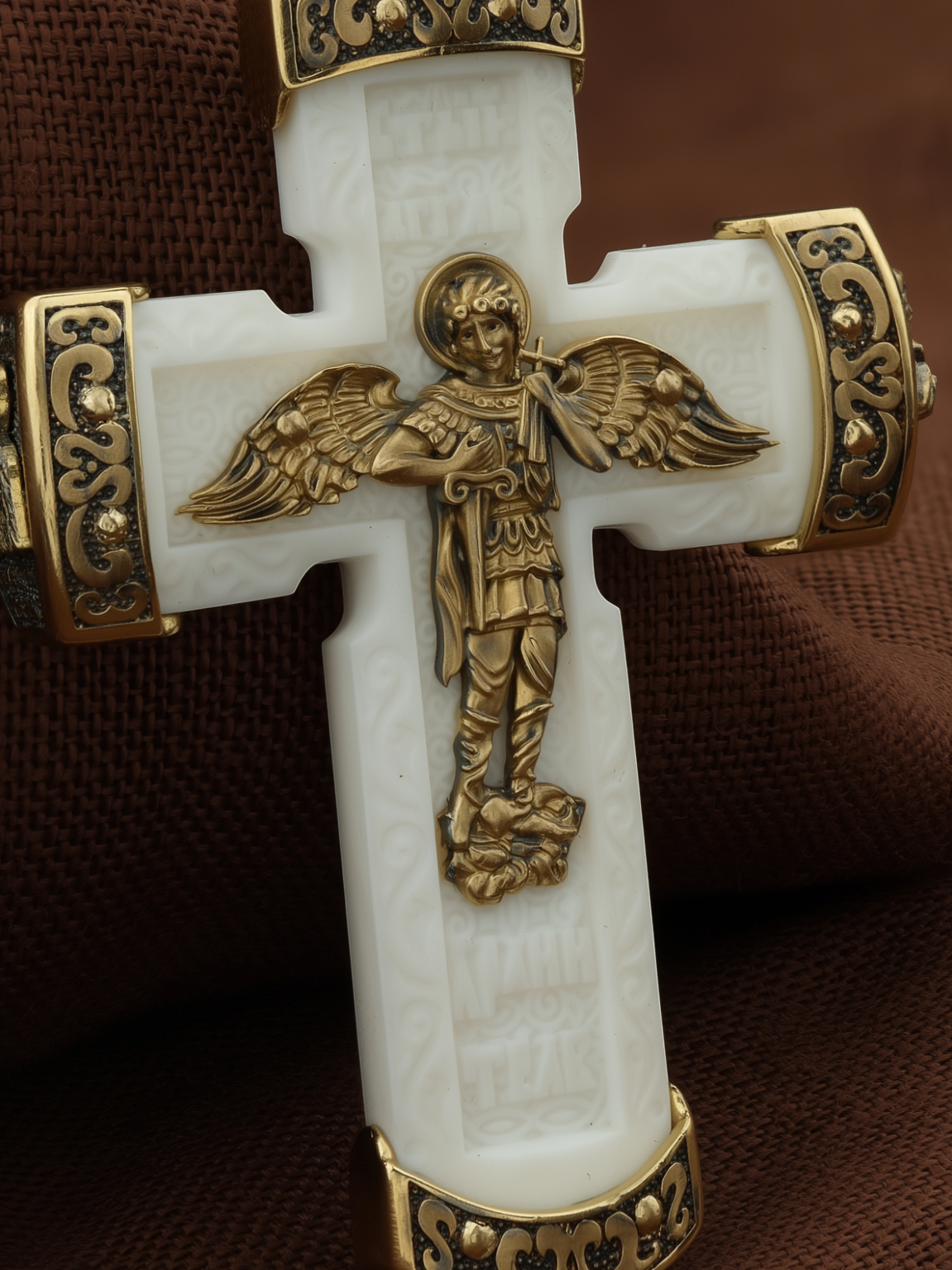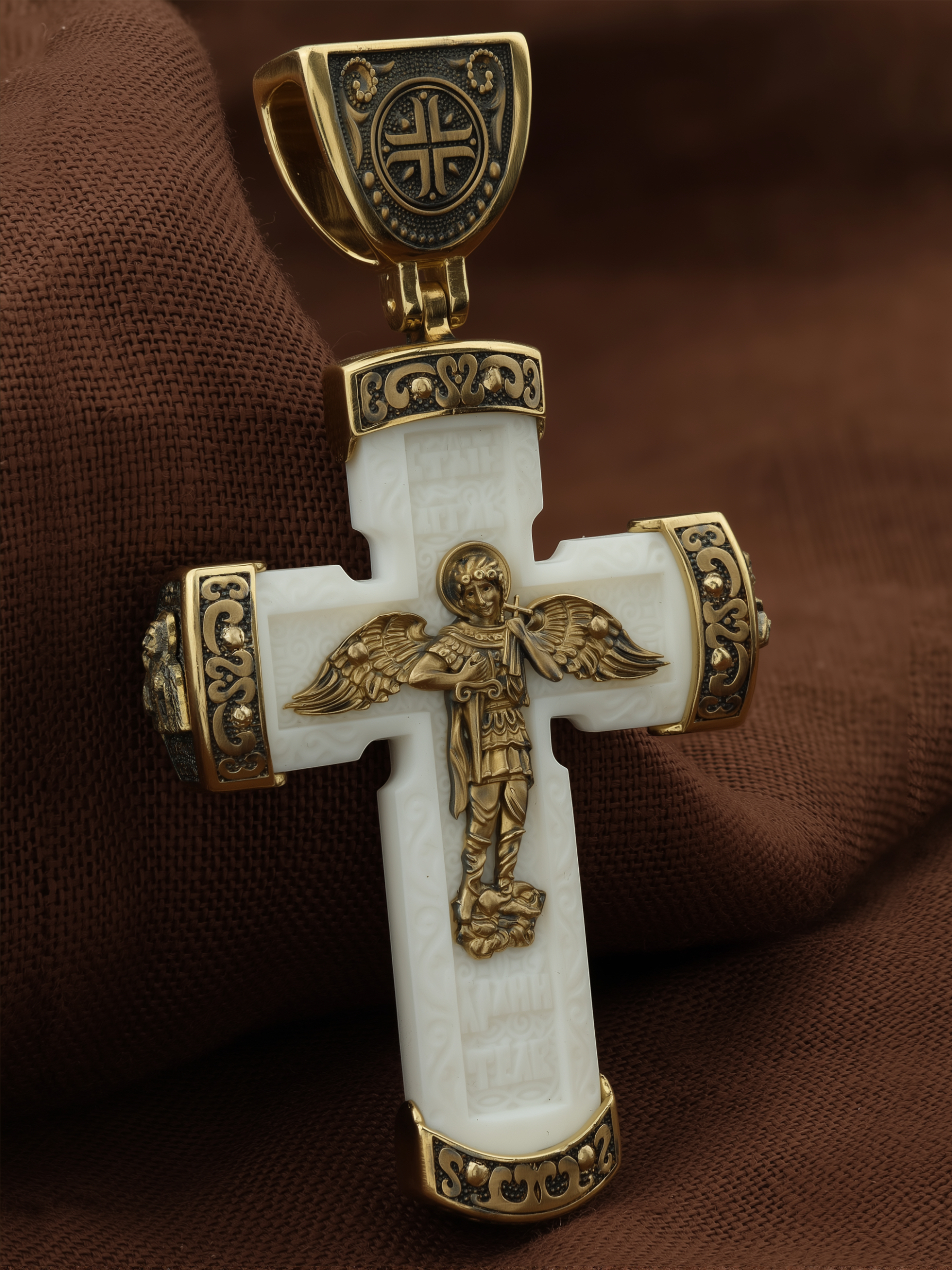 В центре оборота креста изображен Ангела Хранителя с традиционными атрибутами в руках: крестом, которым он осеняет человека, и мечом для прогнания бесов. По Православному учению, каждому, принявшему святое крещение, дается Господом Ангел Хранитель, который сопровождает человека всю его жизнь, помогая в добрых делах и охраняя от нападок злых духов. Святые отцы утверждают, что только верующий человек имеет рядом с собой Ангела Хранителя: «Тем, которые сподобились крещения и возносятся на высоту добродетелей, даны от Бога Ангелы, заботящиеся о них и содействующие им. В этом уверяет нас Господь, когда говорит, что есть Ангелы Хранители у всякого, кто верует в Него» (преп. Анастасий Синаит). Но Ангел Хранитель пребывает с христианином, если только мы не прогоним его греховными делами, поскольку «как дым разгоняет пчел, так и грех прогоняет от нас Ангела Хранителя» (свт. Василий Великий). Но и после завершения земного пути Ангел Хранитель не покидает христианина, а помогает душе преодолеть воздушные мытарства на пути в Царство Небесное.