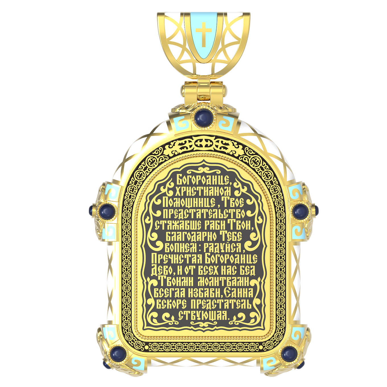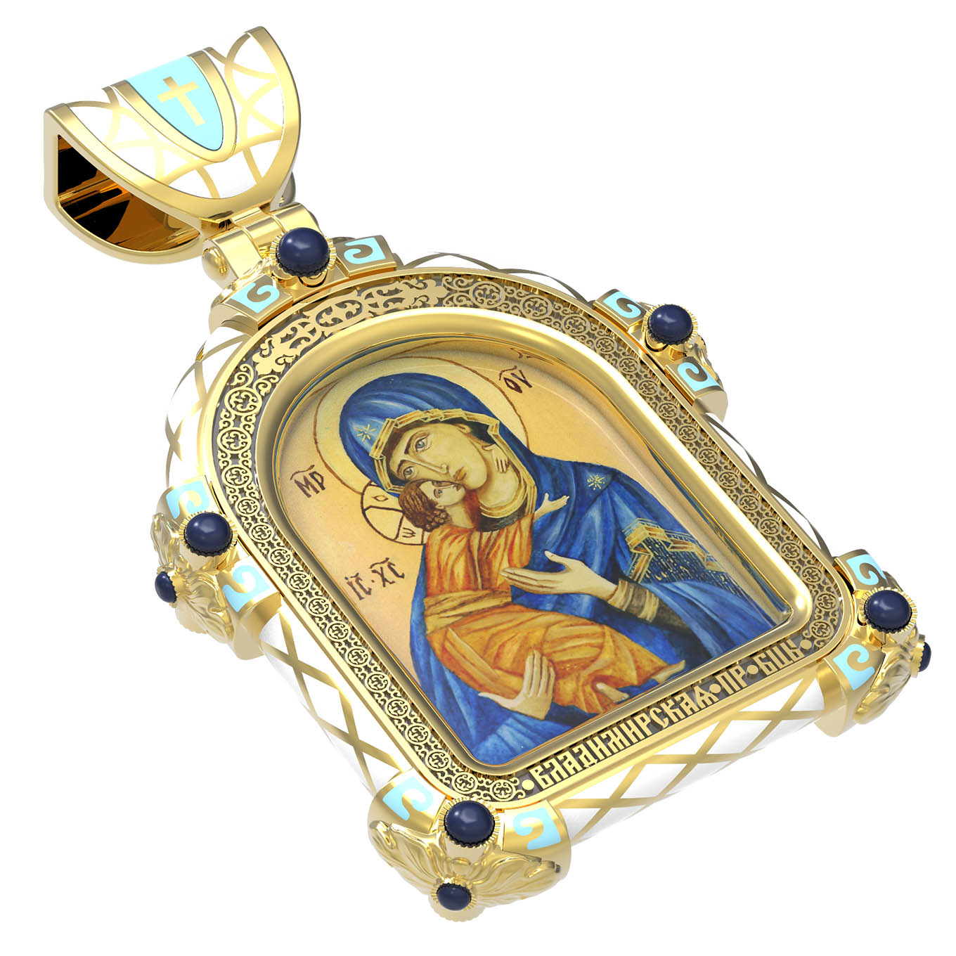 На лицевой стороне образка изображена Владимирская икона Божией Матери — одна из самых чтимых святынь Русской православной церкви. По преданию, икона была написана Святым апостолом и евангелистом Лукой во время земной жизни Богородицы. Дева Мария, увидев Свое изображение, молвила: «Отныне ублажат Мя вси роди. Благодать Рождшегося от Меня и Моя с сим образом да будет». Образ написан в лирическом иконографическом типе «Умиление». Младенец припал щекой к щеке Матери и тянется к ней правой рукой, другой нежно обнимая за шею. Икона вплоть до V века находилась в Иерусалиме, затем была перевезена в Византию. На Русь икона была привезена в 1131 г. За прошедшие столетия святыня неоднократно переезжала из Владимира в Москву и обратно, не раз спасая страну от захватчиков. Русская Православная Церковь установила троекратное празднование Владимирской иконе Божьей Матери. Каждый из дней празднования связан с избавлением русского народа от порабощения иноплеменниками по молитвам ко Пресвятой Богородице. В последующие века у иконы происходили многие важные исторические события: подписание актов, принятие присяги значимых государственных деятелей и возведение на престол. На кулонном кольце изображен Спас Нерукотворный — образ Господа и Спасителя нашего Иисуса Христа, чудесно отпечатавшийся на плате, котором Христос вытер свой лик.