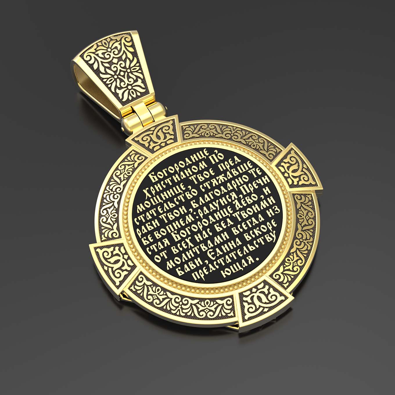 На лицевой стороне образка изображена Казанская икона Божией Матери. Пресвятая Богородица — милосердная заступница, просительница за нас перед Богом. Она стала воистину нашей Матушкой, охраняющей и поддерживающей нас от рождения до самой смерти, а Ее благодатная помощь изливается на нас по молитвам у ее чудотворных икон. Казанская икона явилась в 1579 году в Казани, вскоре после взятия Казанского царства у татар Иоанном Грозным. Этот образ Богородицы не раз сопровождал русский народ в бедствиях. Икона Божией Матери Казанская вдохновляла русских ратников в период Смутного времени при освобождении Москвы от поляков. Перед Казанской иконой в 1709 году, накануне Полтавской победы, император Петр I молился о даровании победы русскому войску. В 1812 году накануне отъезда в действующую армию перед чудотворной иконой Божией Матери молился князь Михаил Кутузов. Не только государственным мужам и дружинам указывала путь икона — по доброй традиции именно этой иконой благословляют на брак молодых родители, длинным списком чудес сопровождается этот образ Богоматери — один из самых любимых на Руси. Существует множество древних списков с этой удивительной иконы. На кулонном кольце изображен Спас Нерукотворный — образ Господа и Спасителя нашего Иисуса Христа, чудесно отпечатавшийся на плате, котором Христос вытер свой лик.