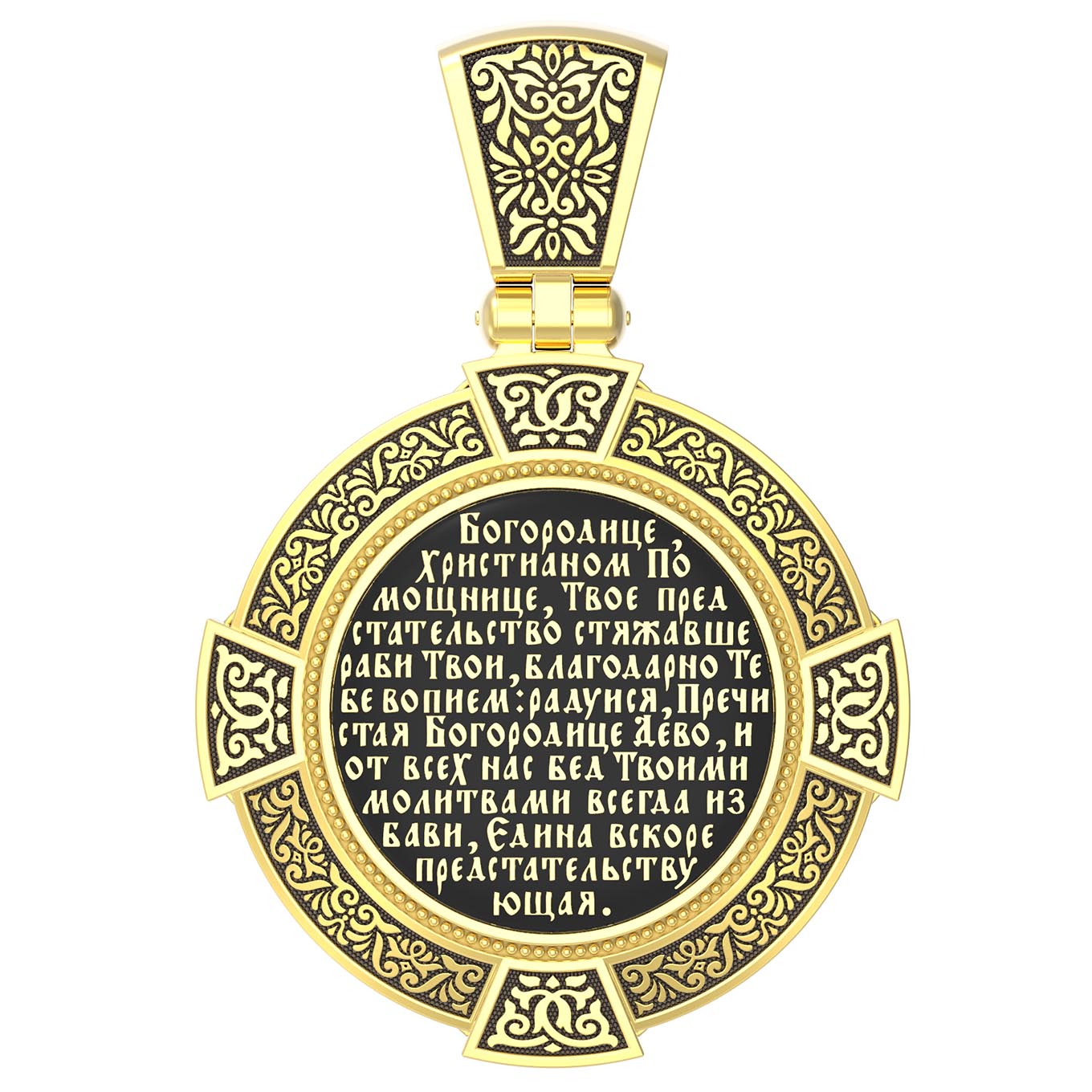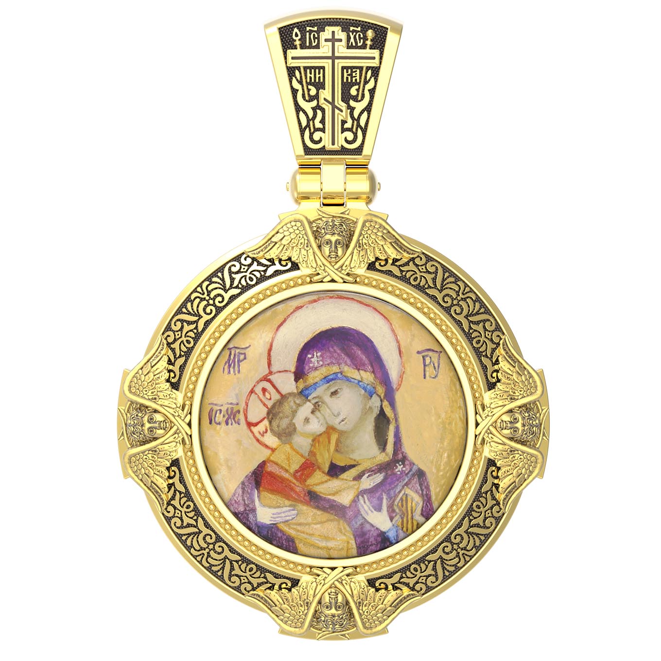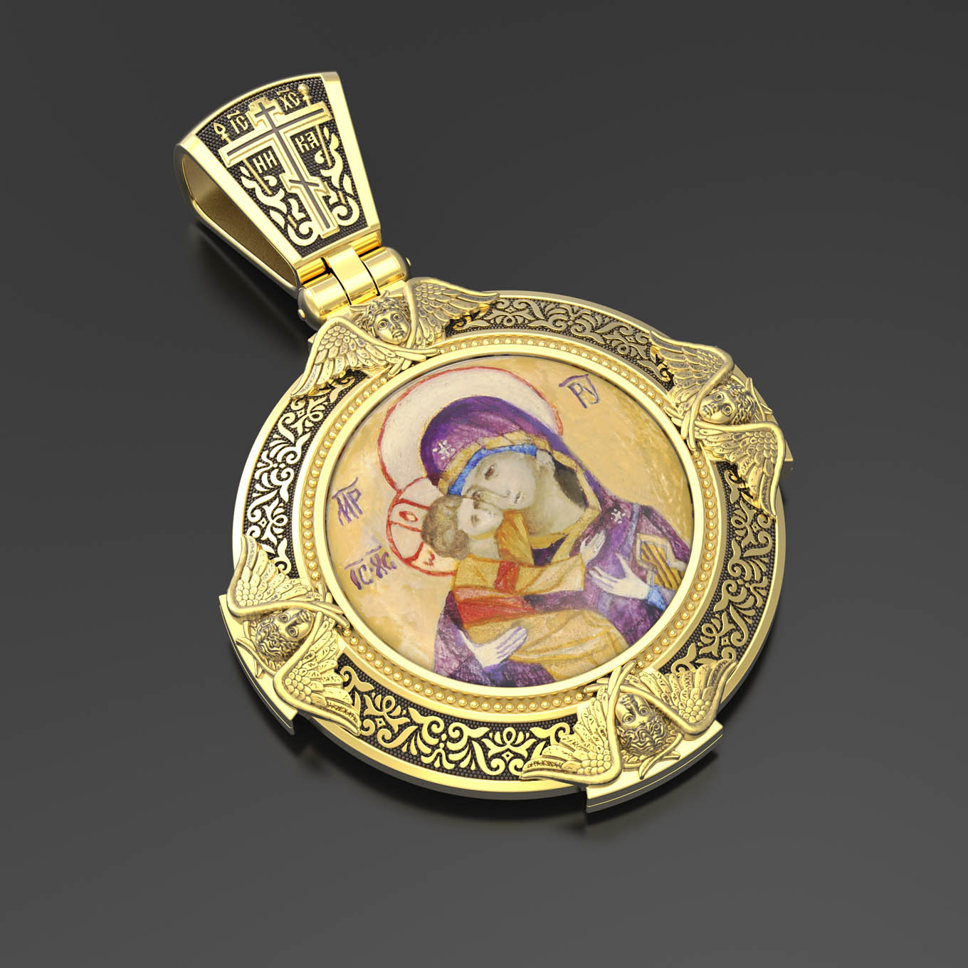 На лицевой стороне образка изображена Владимирская икона Божией Матери — одна из самых чтимых святынь Русской православной церкви. По преданию, икона была написана Святым апостолом и евангелистом Лукой во время земной жизни Богородицы. Дева Мария, увидев Свое изображение, молвила: «Отныне ублажат Мя вси роди. Благодать Рождшегося от Меня и Моя с сим образом да будет». Образ написан в лирическом иконографическом типе «Умиление». Младенец припал щекой к щеке Матери и тянется к ней правой рукой, другой нежно обнимая за шею. Икона вплоть до V века находилась в Иерусалиме, затем была перевезена в Византию. На Русь икона была привезена в 1131 г. За прошедшие столетия святыня неоднократно переезжала из Владимира в Москву и обратно, не раз спасая страну от захватчиков. Русская Православная Церковь установила троекратное празднование Владимирской иконе Божьей Матери. Каждый из дней празднования связан с избавлением русского народа от порабощения иноплеменниками по молитвам ко Пресвятой Богородице. В последующие века у иконы происходили многие важные исторические события: подписание актов, принятие присяги значимых государственных деятелей и возведение на престол. На кулонном кольце изображен Спас Нерукотворный — образ Господа и Спасителя нашего Иисуса Христа, чудесно отпечатавшийся на плате, котором Христос вытер свой лик.