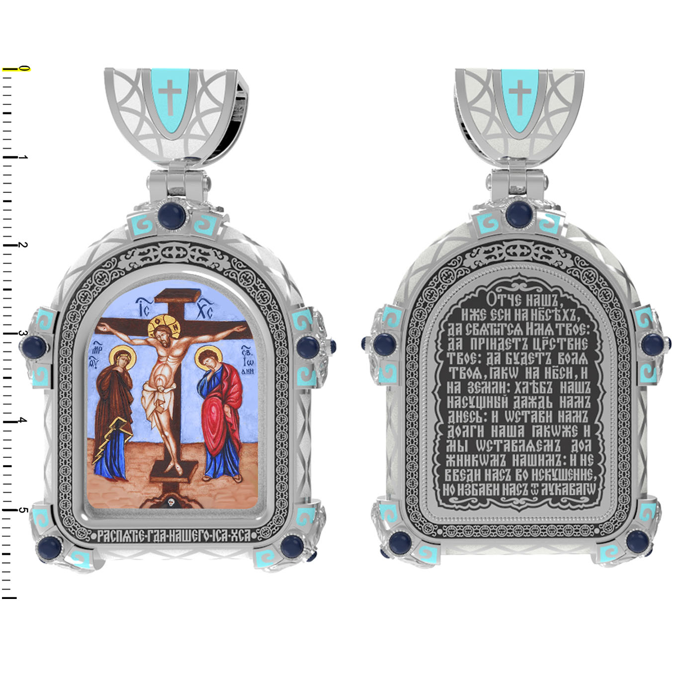 На лицевой стороне образка изображено Распятие Господа и Спасителя нашего Иисуса Христа. Своими крестными страданиями Господь смыл наши грехи, покрыл наш долг перед Богом или, на языке Писания, нас «искупил». В Голгофе сокрыта непостижимая тайна бесконечной правды и любви Бога. Крест стал символом победы добра над злом, жизни над смертью, напоминанием бесконечной Божьей любви, предметом радости. Воплотившийся Сын Божий Своею кровью освятил крест и сделал его проводником Своей благодати, источником освящения верующих. На верхней табличке, выше головы Иисуса, расположена надпись, составленная Понтием Пилатом — «IНЦI». Она означает «Иисус Назорей, Царь Иудейский». Ниже перекладины написано сокращенно имя Спасителя «IC» «XC» — Иисус Христос. Крест стоит на горе камней, символизирующих Голгофу. Под подножием Креста изображена покоящаяся голова (череп) Адама. Слева от Распятия стоят оплакивающие Господа Пресвятая Богородица и святая мироносица Мария Клеопова. Справа — апостол и евангелист Иоанн Богослов, один из ближайших учеников Иисуса Христа и сотник Лонгин с крестом в правой руке и копьем — в левой. По преданию, увидя, что они горько плачут, Иисус сказал Матери Своей: «Жено! Се сын Твой!» Потом сказал ученику Иоанну: «Се мати твоя». С этого времени Иоанн взял Матерь Божию к себе, и Она жила в его доме до самой смерти.
