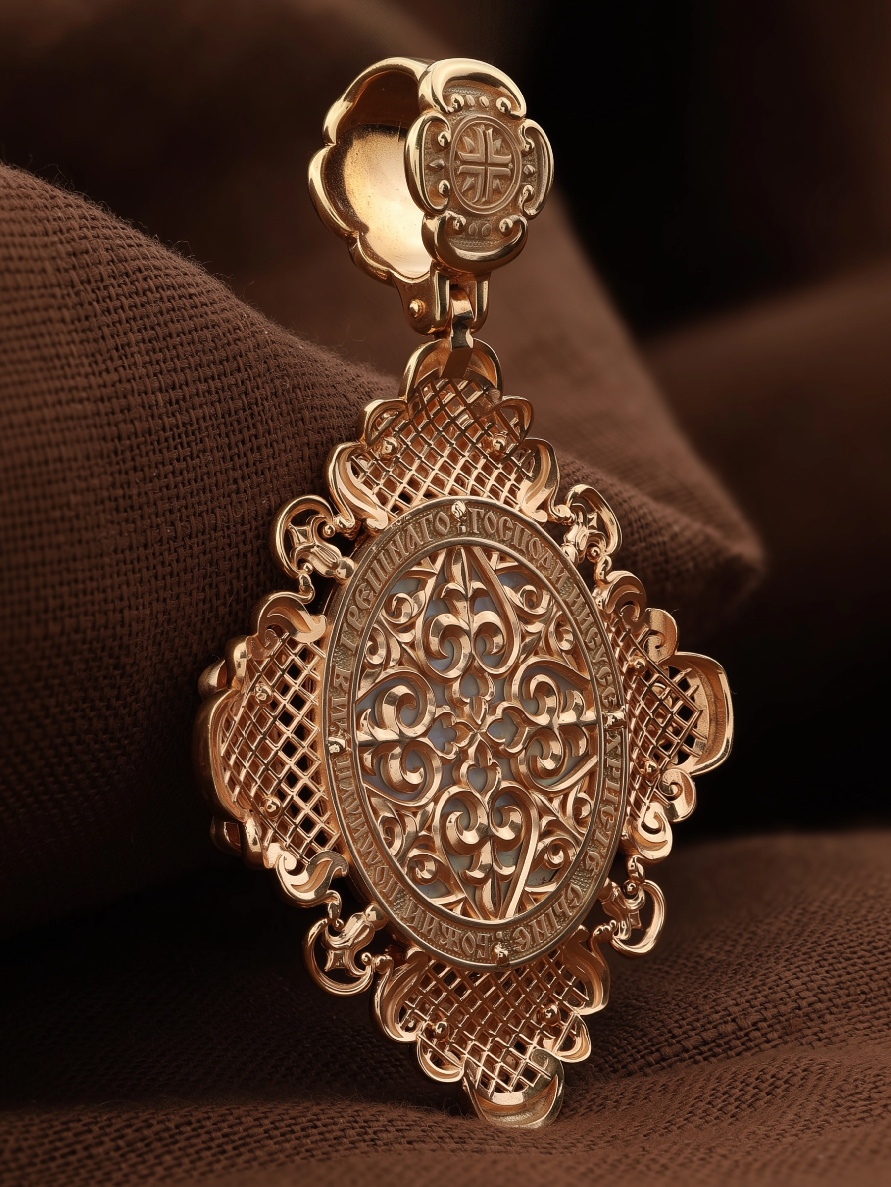 На лицевой стороне образка изображена Владимирская икона Божией Матери — одна из самых чтимых святынь Русской православной церкви. По преданию, икона была написана Святым апостолом и евангелистом Лукой во время земной жизни Богородицы. Дева Мария, увидев Свое изображение, молвила: «Отныне ублажат Мя вси роди. Благодать Рождшегося от Меня и Моя с сим образом да будет». Образ написан в лирическом иконографическом типе «Умиление». Младенец припал щекой к щеке Матери и тянется к ней правой рукой, другой нежно обнимая за шею. Икона вплоть до V века находилась в Иерусалиме, затем была перевезена в Византию. На Русь икона была привезена в 1131 г. За прошедшие столетия святыня неоднократно переезжала из Владимира в Москву и обратно, не раз спасая страну от захватчиков. Русская Православная Церковь установила троекратное празднование Владимирской иконе Божьей Матери. Каждый из дней празднования связан с избавлением русского народа от порабощения иноплеменниками по молитвам ко Пресвятой Богородице. В последующие века у иконы происходили многие важные исторические события: подписание актов, принятие присяги значимых государственных деятелей и возведение на престол. На кулонном кольце изображен Спас Нерукотворный — образ Господа и Спасителя нашего Иисуса Христа, чудесно отпечатавшийся на плате, котором Христос вытер свой лик.