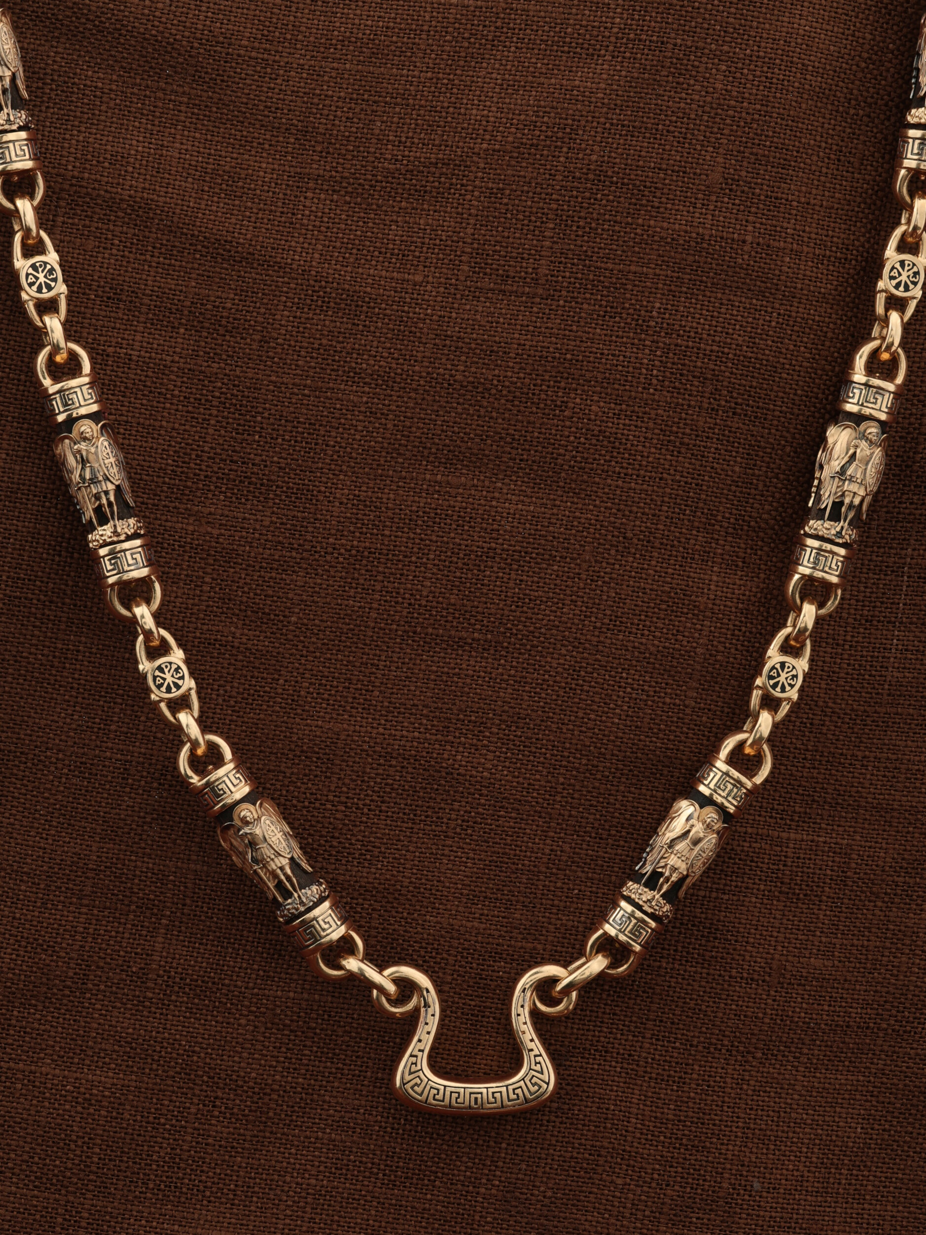На звеньях цепи изображена Хризма — монограмма имени Христа, которая состоит из двух начальных греческих букв имени  — Х (хи) и Р (ро), скрещённых между собой. По краям монограммы помещены греческие буквы a и w. Такое употребление этих букв восходит к тексту Апокалипсиса: «Аз есмь Альфа и Омега, начало и конец, говорит Господь, Который есть и был и грядет, Вседержитель.» (Откр. 1:8; см. также Откр. 22:13). Также на звеньях изображен Святой Ангел-Хранитель в виде прекрасного юноши держащего в правой руке мечь, а в левой — щит. Ангел-Хранитель — это Ангел приставляемый Богом к человеку при крещении для охраны и помощи в добрых делах. Он невидимо находится при человеке на протяжении всей его жизни, если человек сохраняет в себе любовь к Богу и истинную веру перед Ним. Ангел-Xранитель делают для нас все, что служит к истинному нашему благу и спасению. Невидимо пребывая при нас постоянно, он, руководствуя нас ко спасению, не только по нашему желанию таинственно наставляет нас на все доброе и полезное, не только возносит наши молитвы к Богу, но еще и сам от себя охраняют и защищают нас от врагов видимых и невидимых и ходатайствует за нас пред Богом. Ангел-Хранитель так любит нас, как никто на земле любить не может. Одного лишь каждому из нас он желает — спасения души; к этому он направляет все свои заботы. И если видит нас также заботящимися о спасении, радуется, если же видит нас пребывающими в нерадении о душе своей, скорбит. Но и самый великий грешник может примириться со своим Ангелом-Хранителем посредством искреннего раскаяния в грехах и оставления их навсегда. В таком случае, по слову Писания, великая радость бывает для всех ангелов на небесах (Лк. 15:10). Цепь украшена орнаментом.